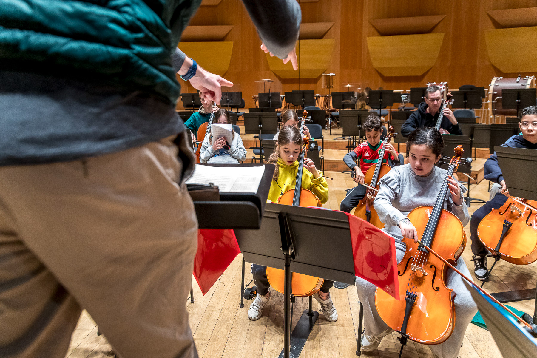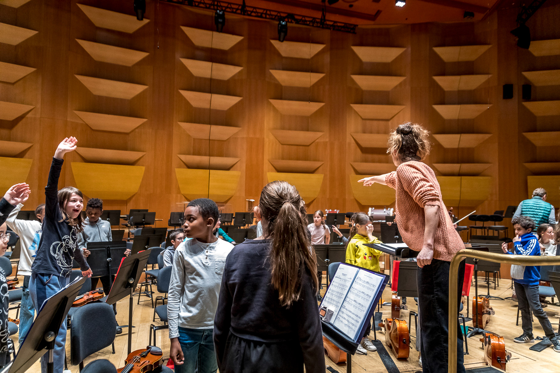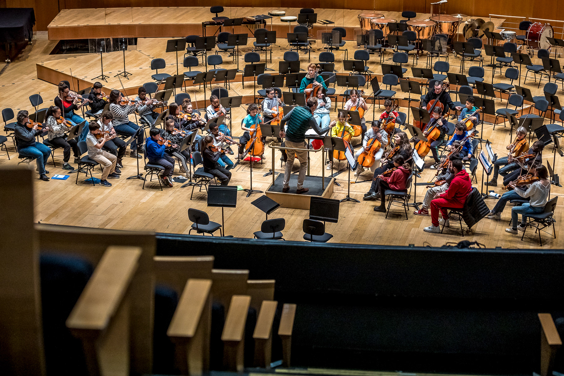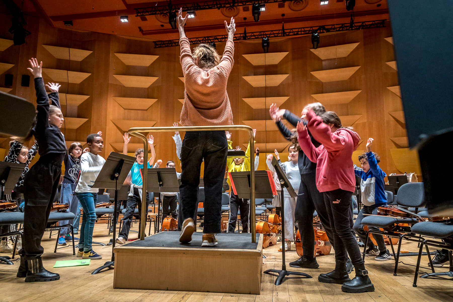 Reportage photo sur les coulisses d'une répétition à l'auditorium de Lyon des enfants engagés dans le projet DEMOS avec un chef d'orchestre. Le dispositif vise rendre accessible la pratique musicale en orchestre à des enfants issus de milieux défavorisés et traditionnellement éloignés de la musique "classique" - Auditorium de Lyon, France