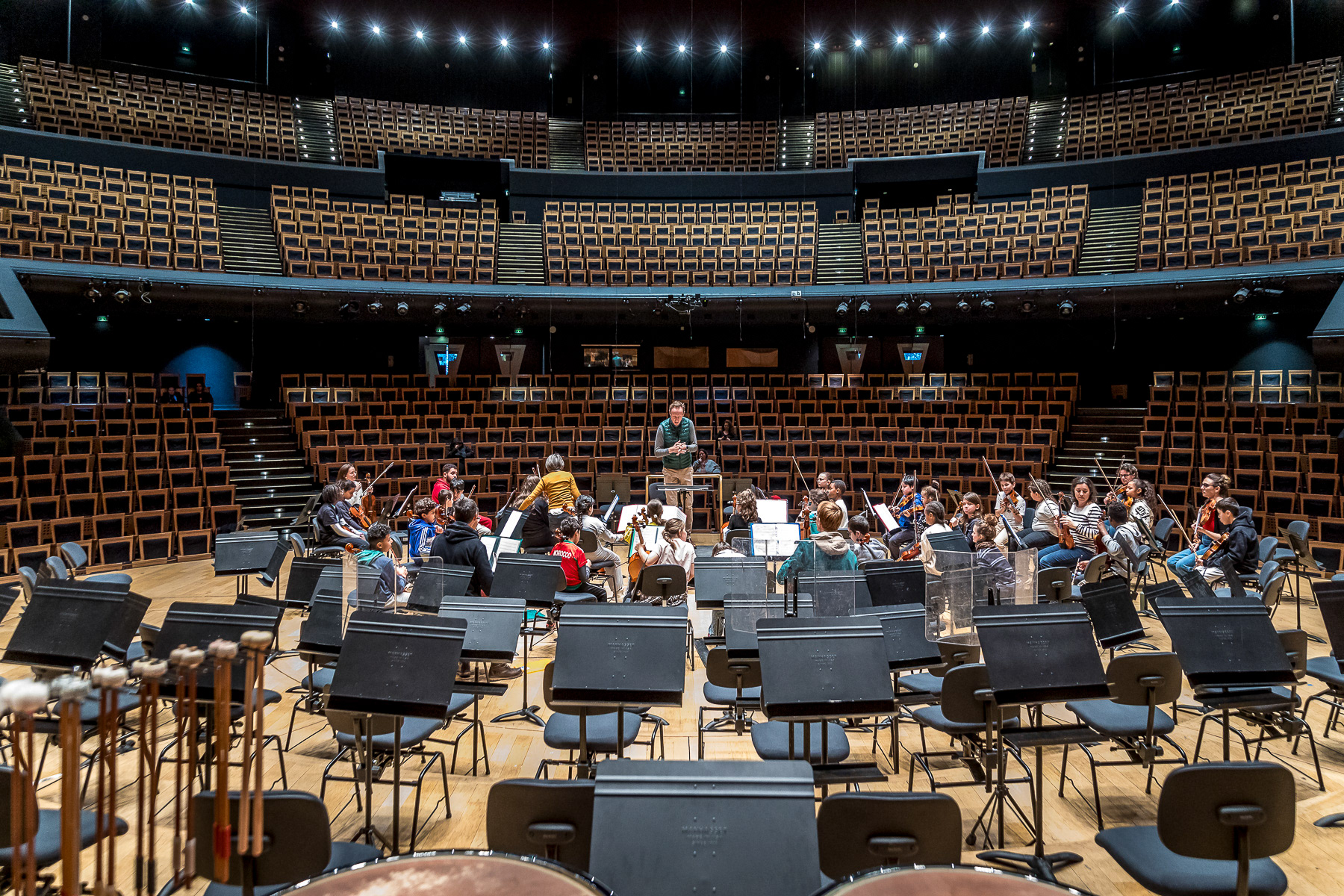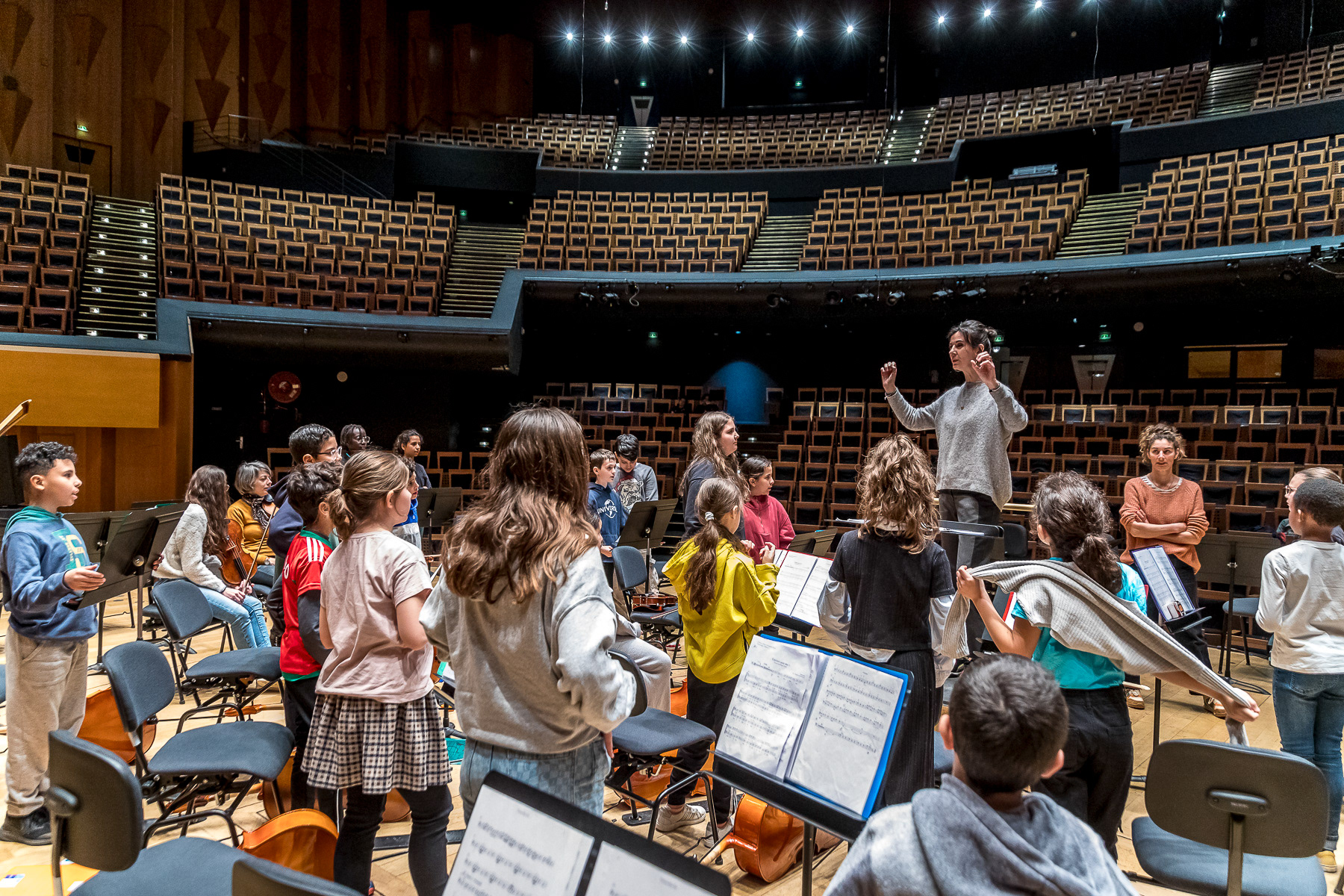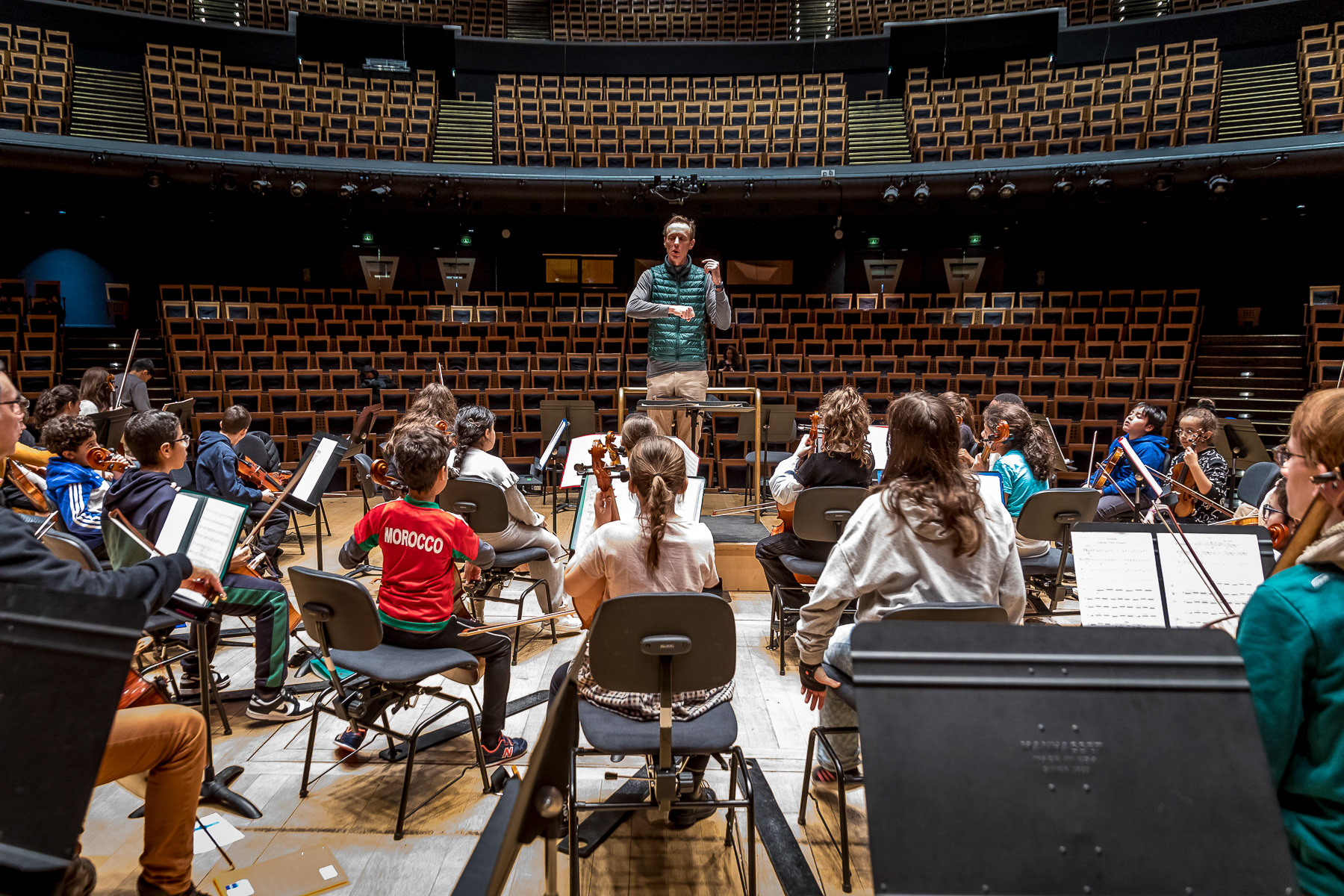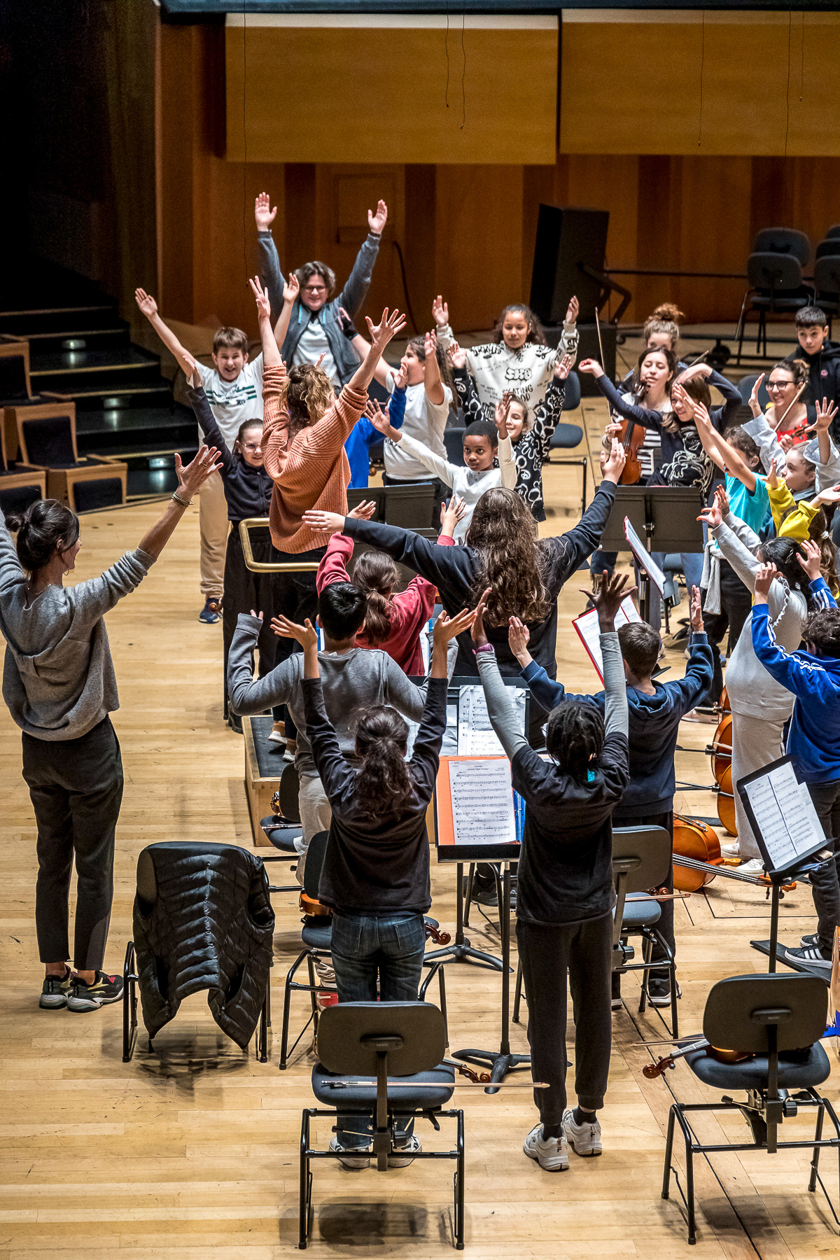 Reportage photo sur les coulisses d'une répétition à l'auditorium de Lyon des enfants engagés dans le projet DEMOS avec un chef d'orchestre. Le dispositif vise rendre accessible la pratique musicale en orchestre à des enfants issus de milieux défavorisés et traditionnellement éloignés de la musique "classique" - Auditorium de Lyon, France