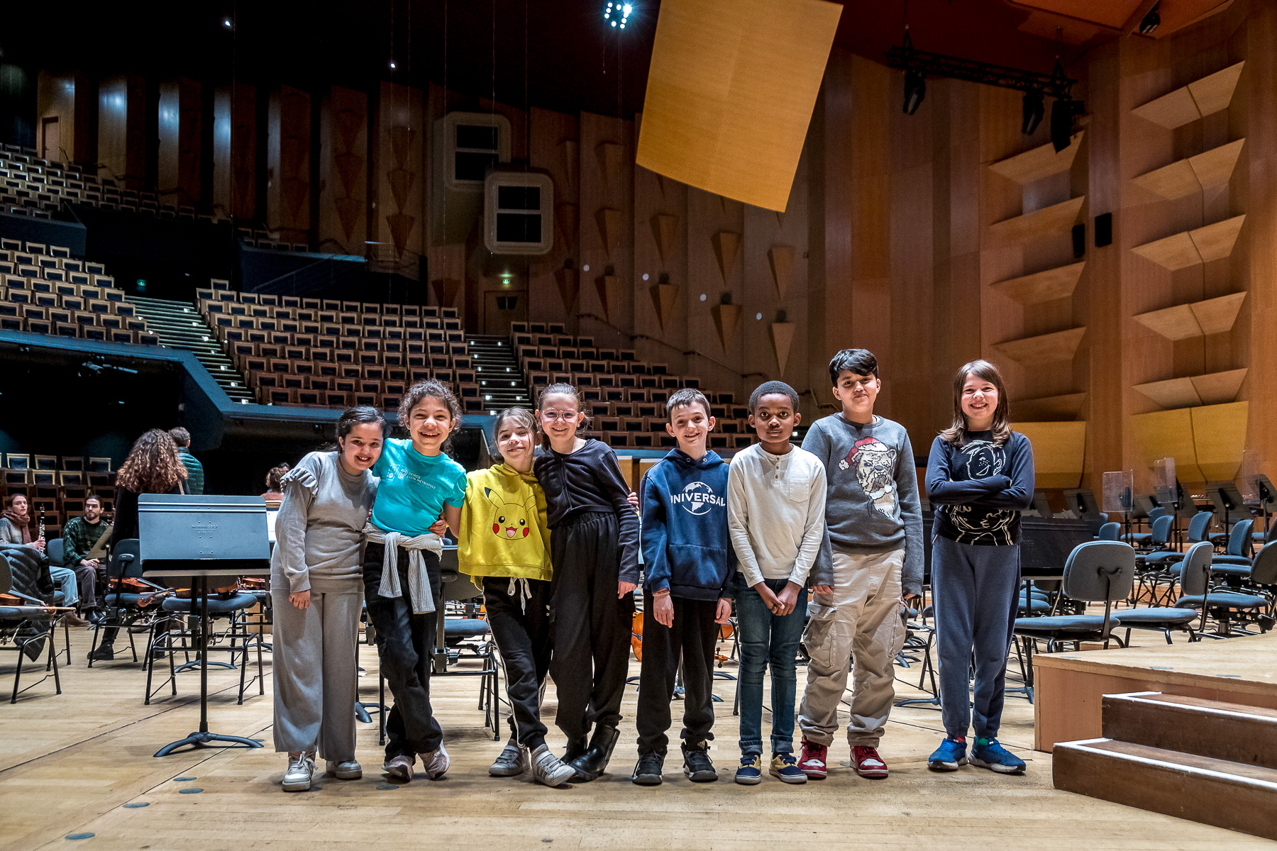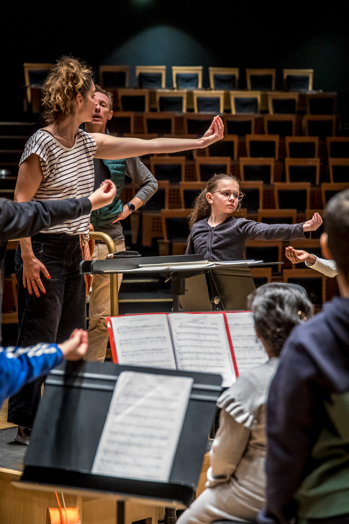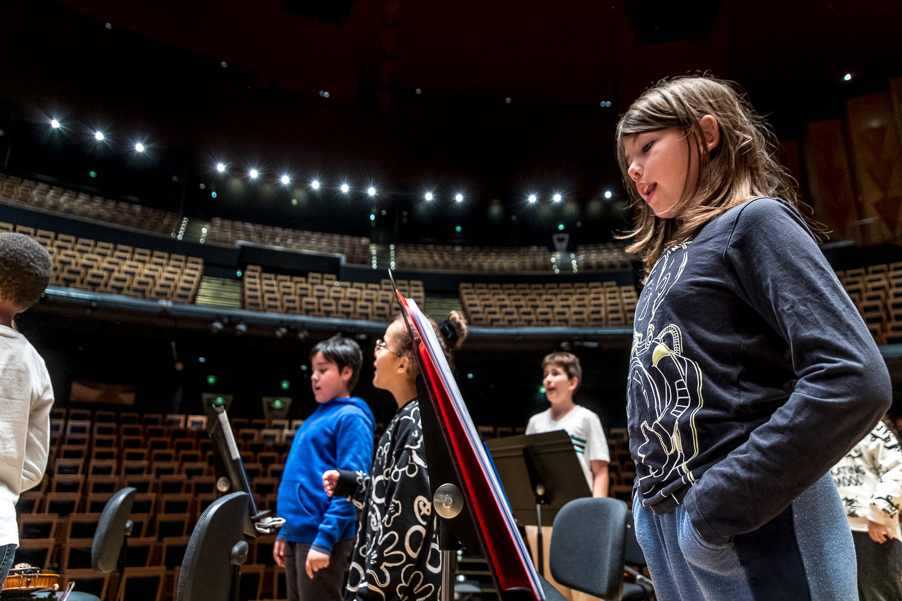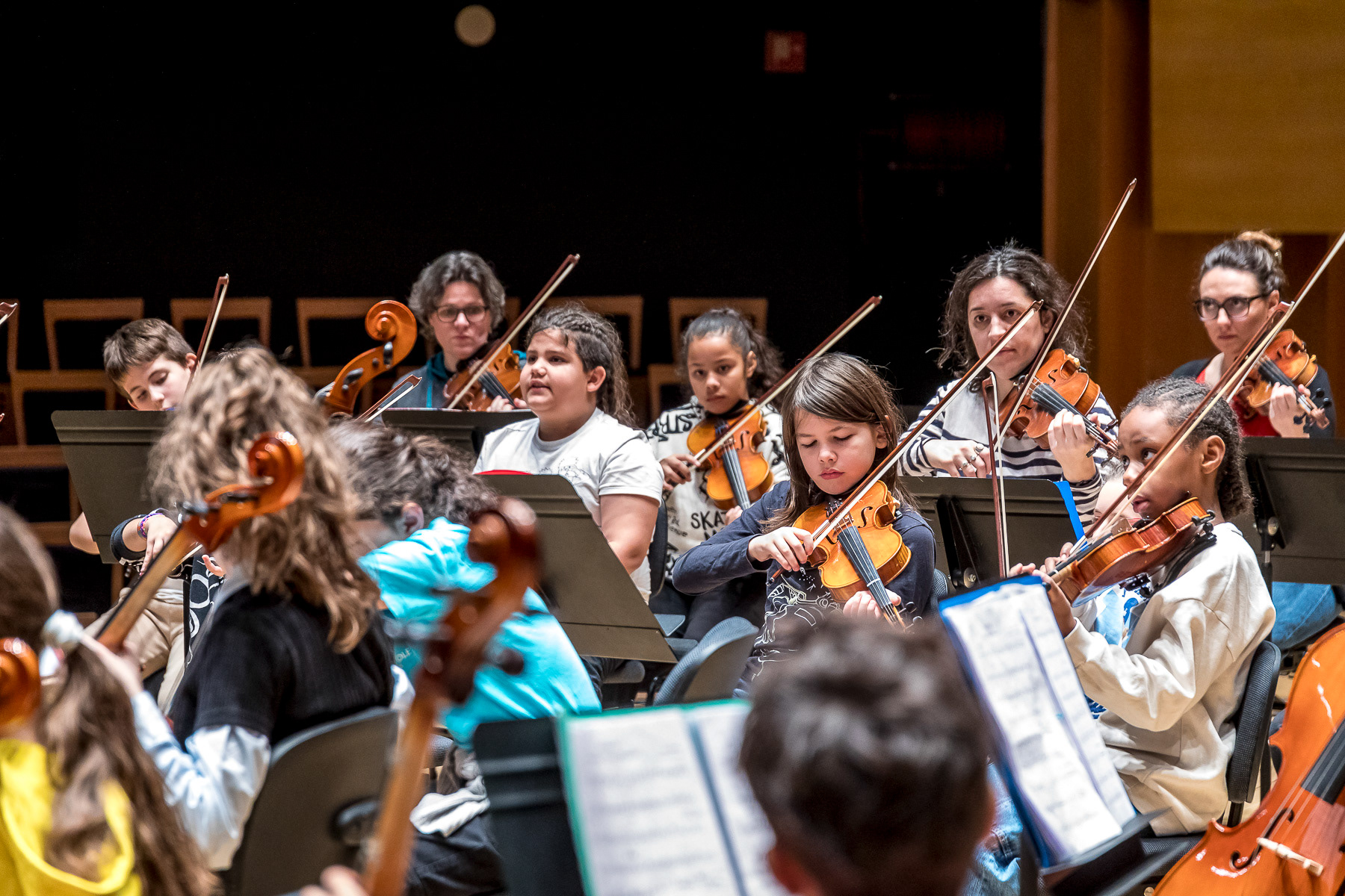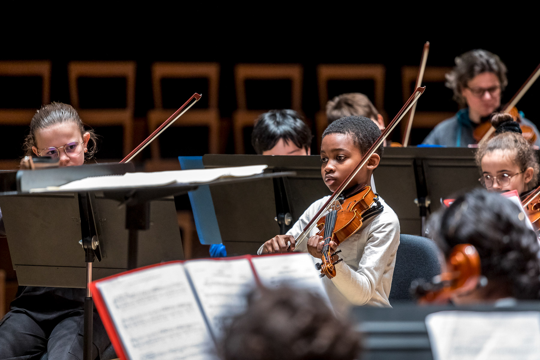 Reportage photo sur les coulisses d'une répétition à l'auditorium de Lyon des enfants engagés dans le projet DEMOS avec un chef d'orchestre. Le dispositif vise rendre accessible la pratique musicale en orchestre à des enfants issus de milieux défavorisés et traditionnellement éloignés de la musique "classique" - Auditorium de Lyon, France