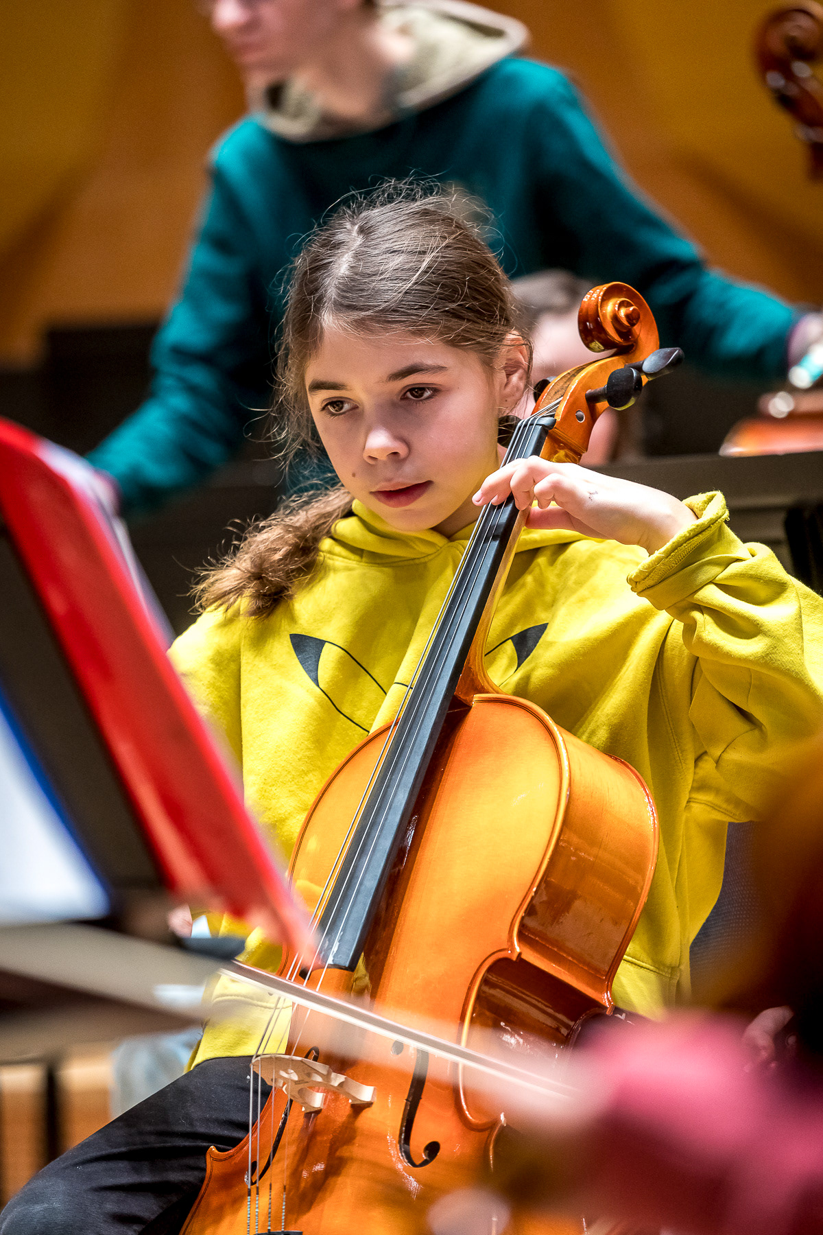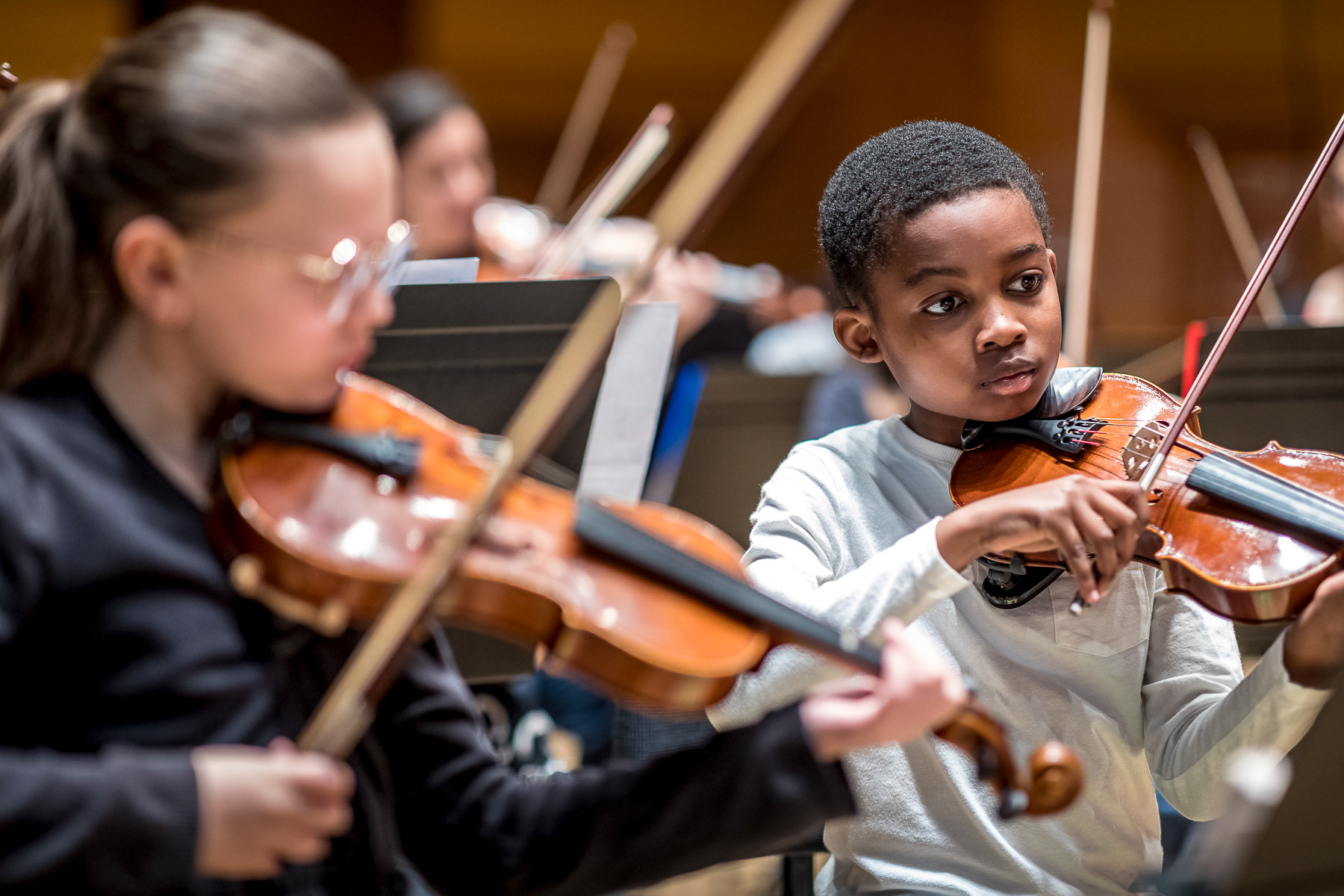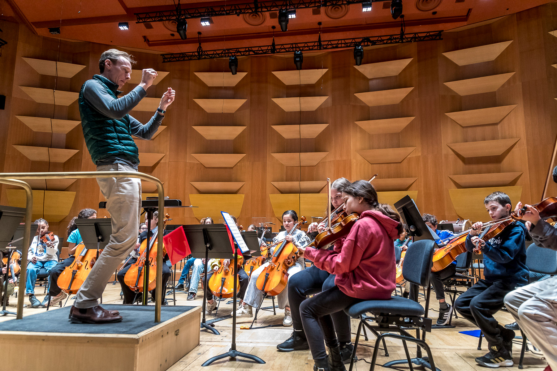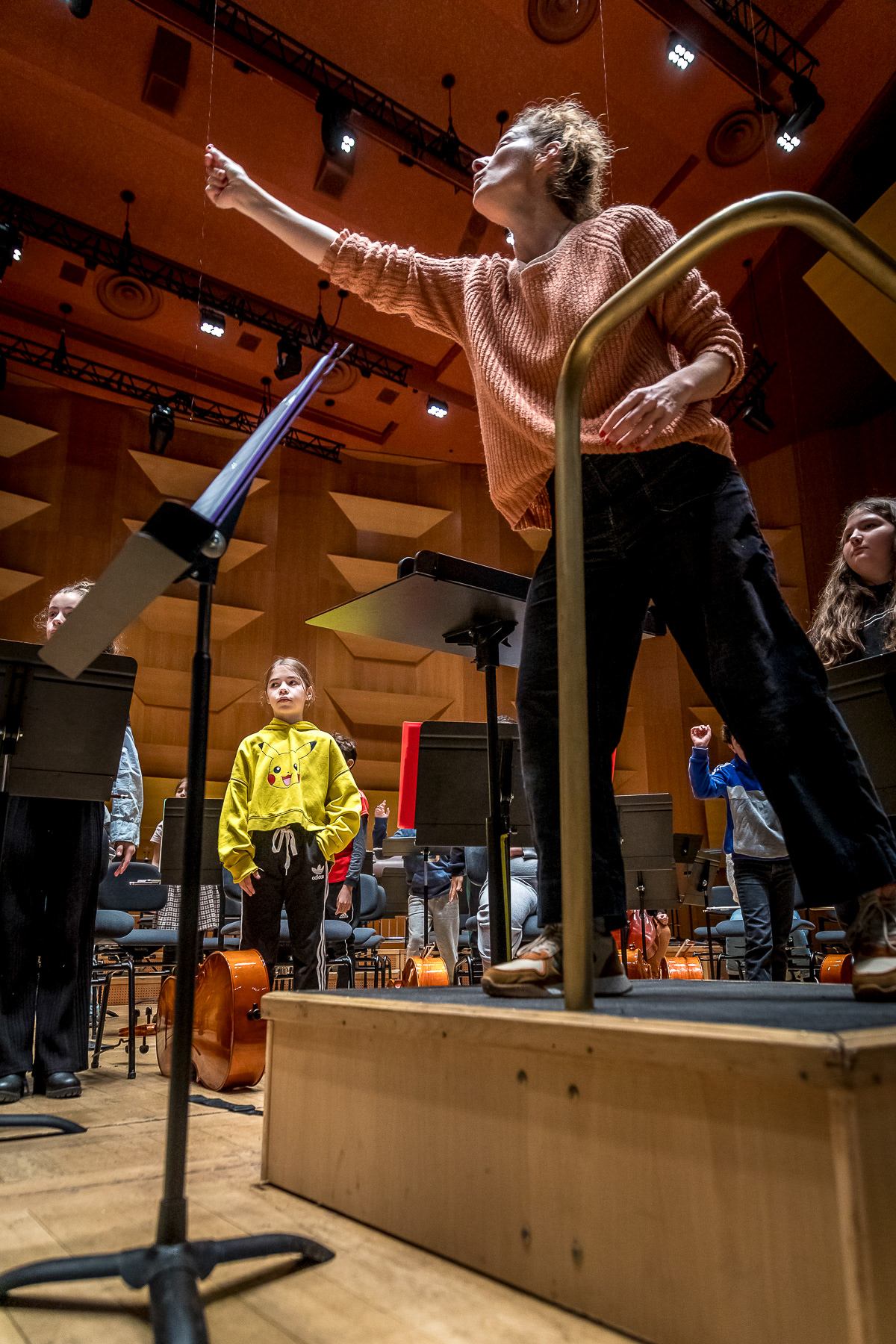 Reportage photo sur les coulisses d'une répétition à l'auditorium de Lyon des enfants engagés dans le projet DEMOS avec un chef d'orchestre. Le dispositif vise rendre accessible la pratique musicale en orchestre à des enfants issus de milieux défavorisés et traditionnellement éloignés de la musique "classique" - Auditorium de Lyon, France