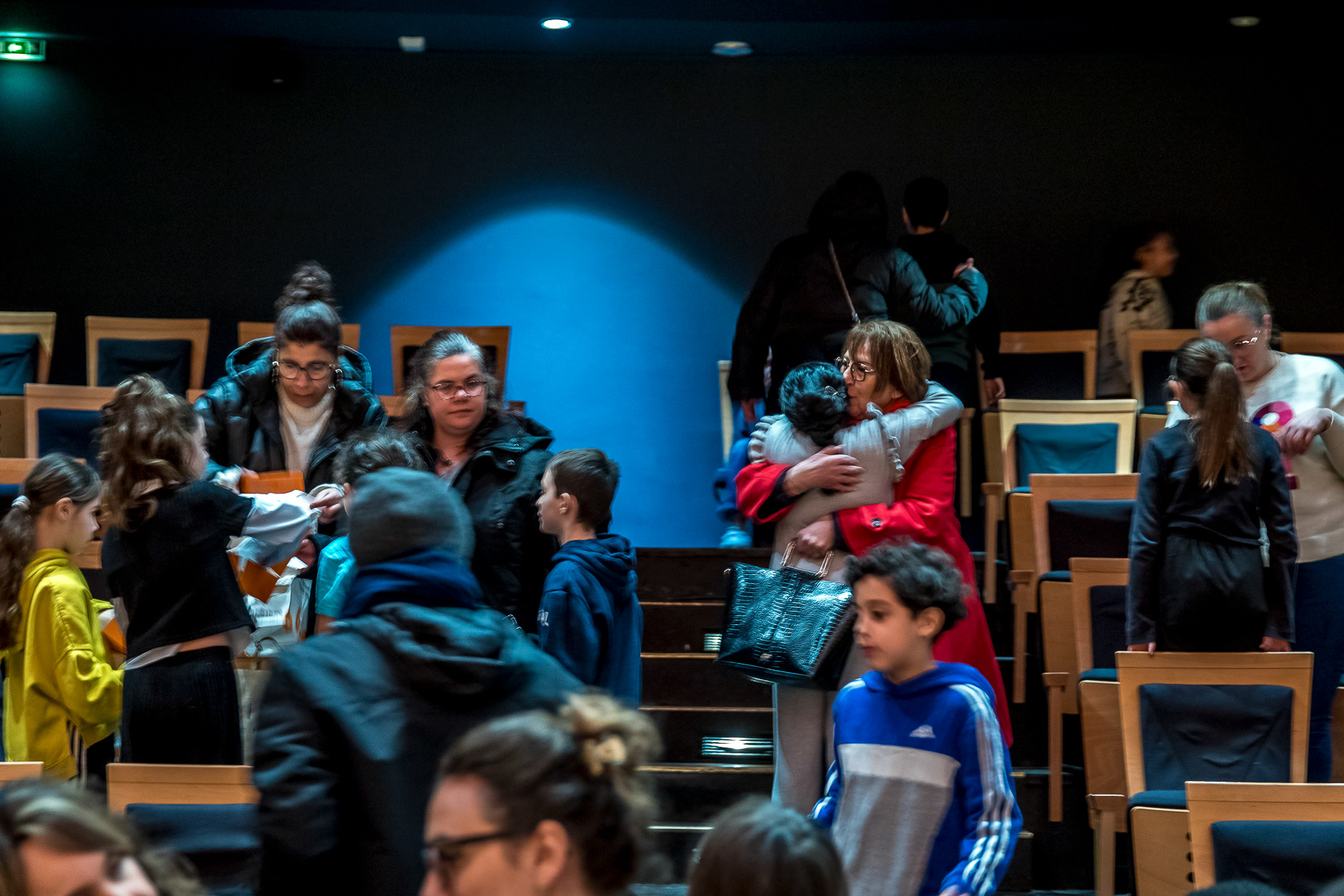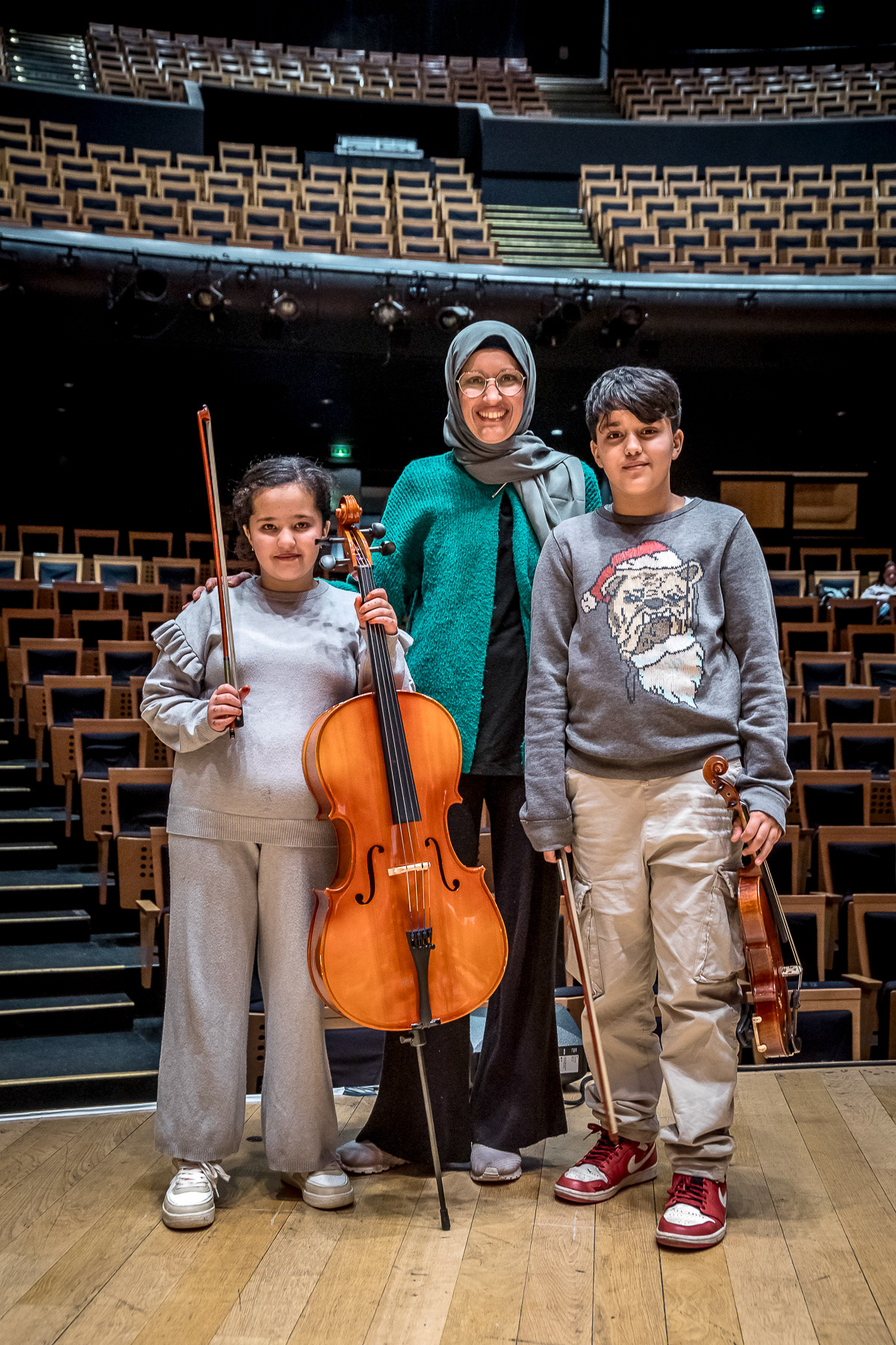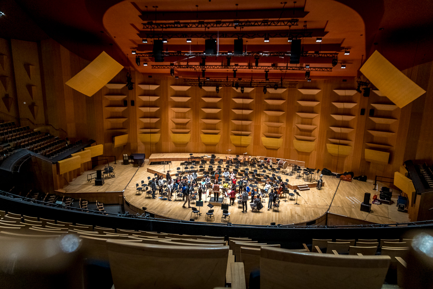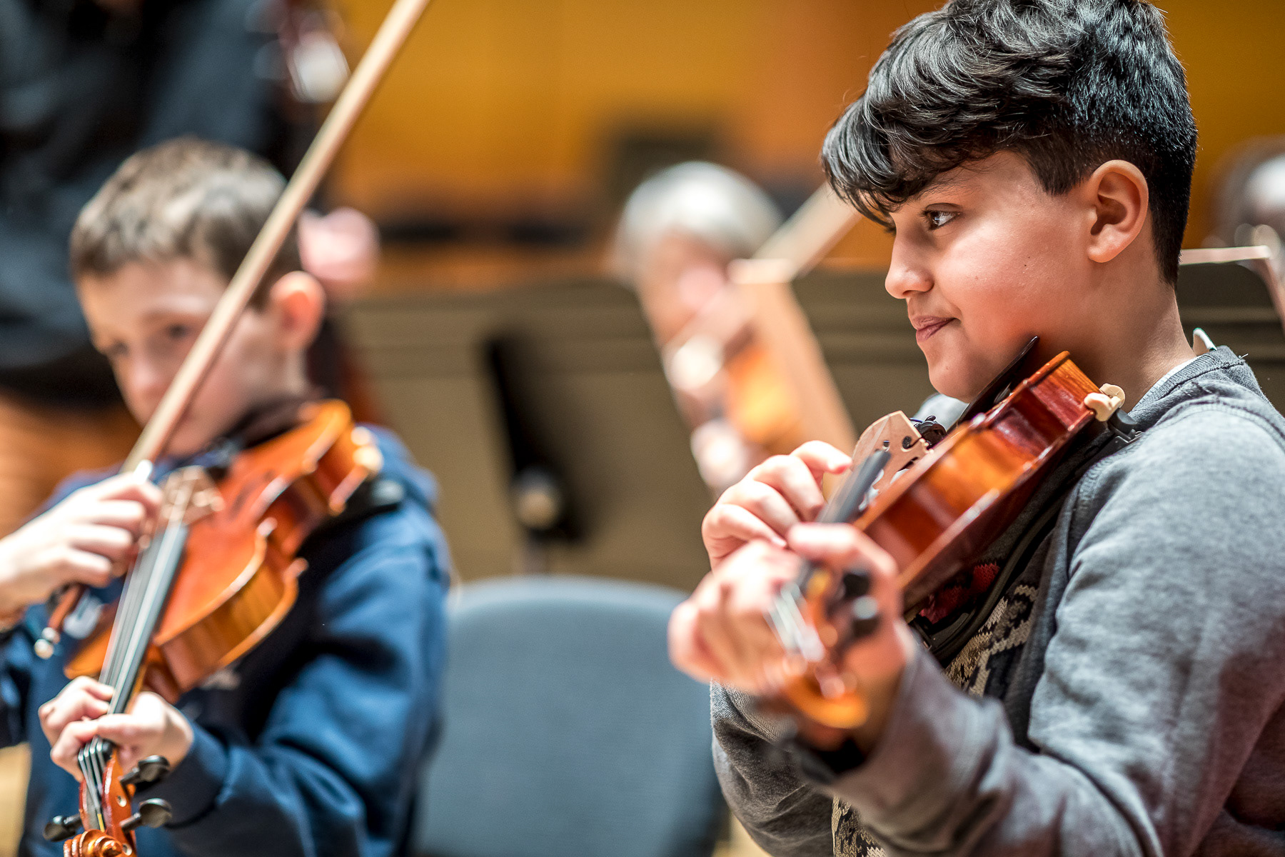 Reportage photo sur les coulisses d'une répétition à l'auditorium de Lyon des enfants engagés dans le projet DEMOS avec un chef d'orchestre. Le dispositif vise rendre accessible la pratique musicale en orchestre à des enfants issus de milieux défavorisés et traditionnellement éloignés de la musique "classique" - Auditorium de Lyon, France