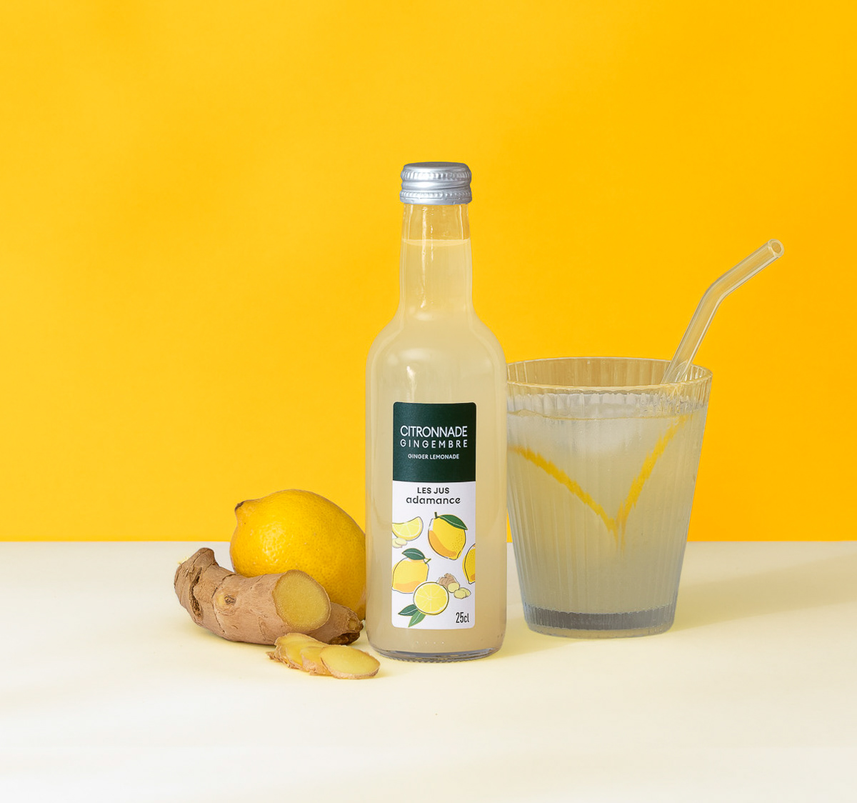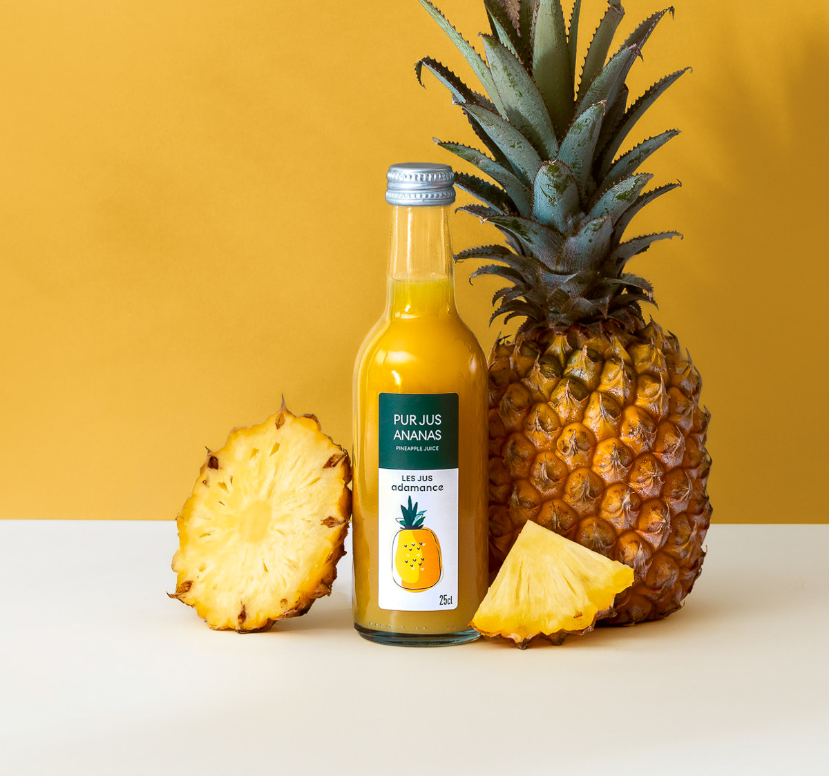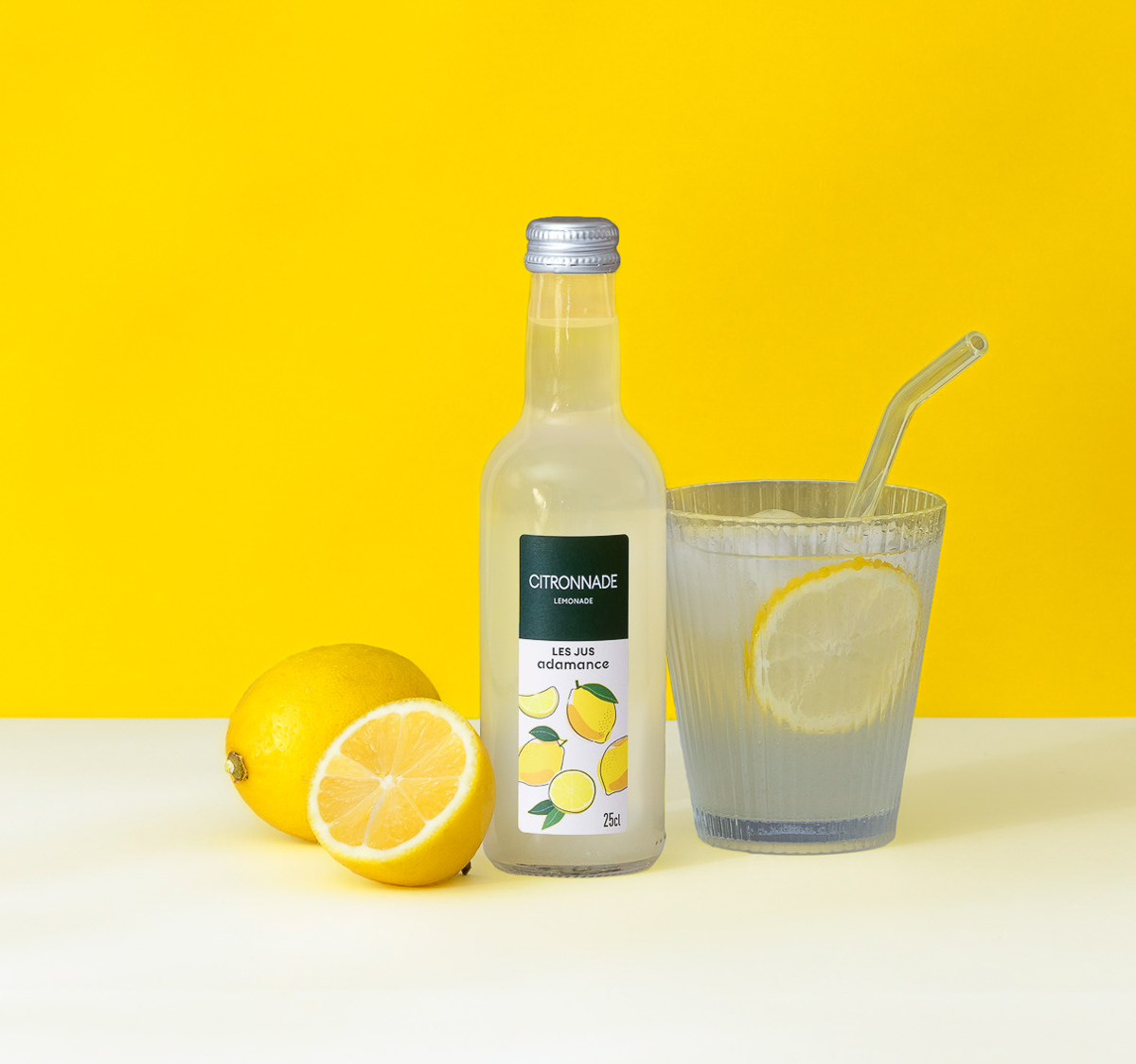 Shooting photo de packshot en studio d'une gamme complète de bouteilles de jus de fruit, mises en scènes au côté des fruits bruts avec une DA estivale et colorée - Pierre-Bénite, Grand Lyon, France