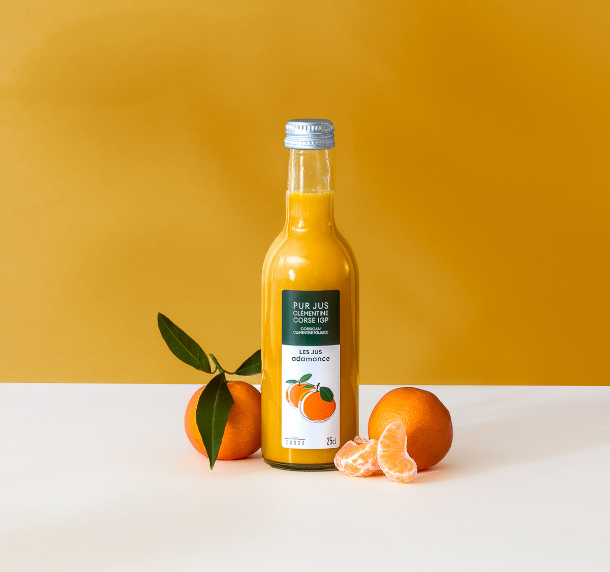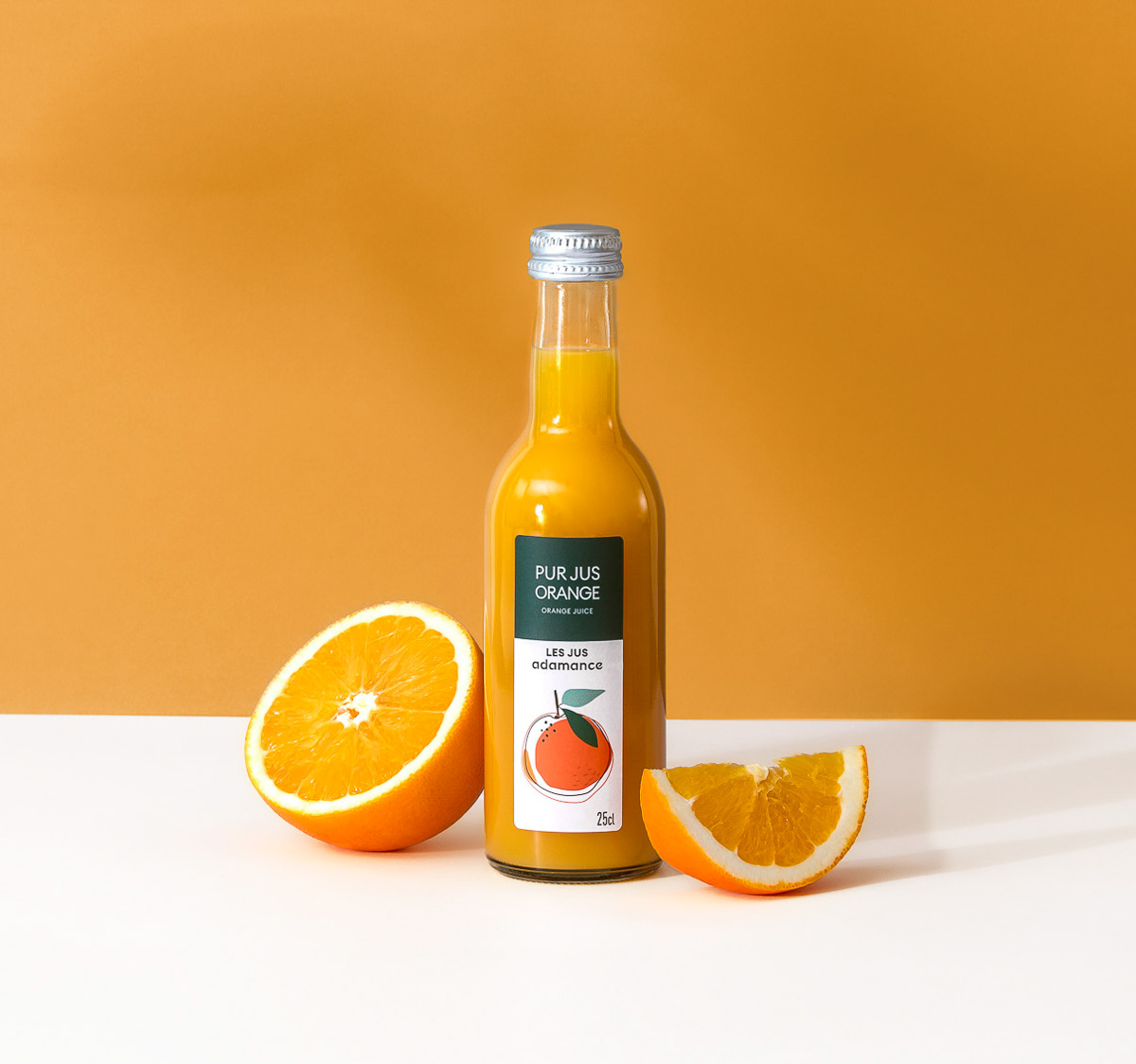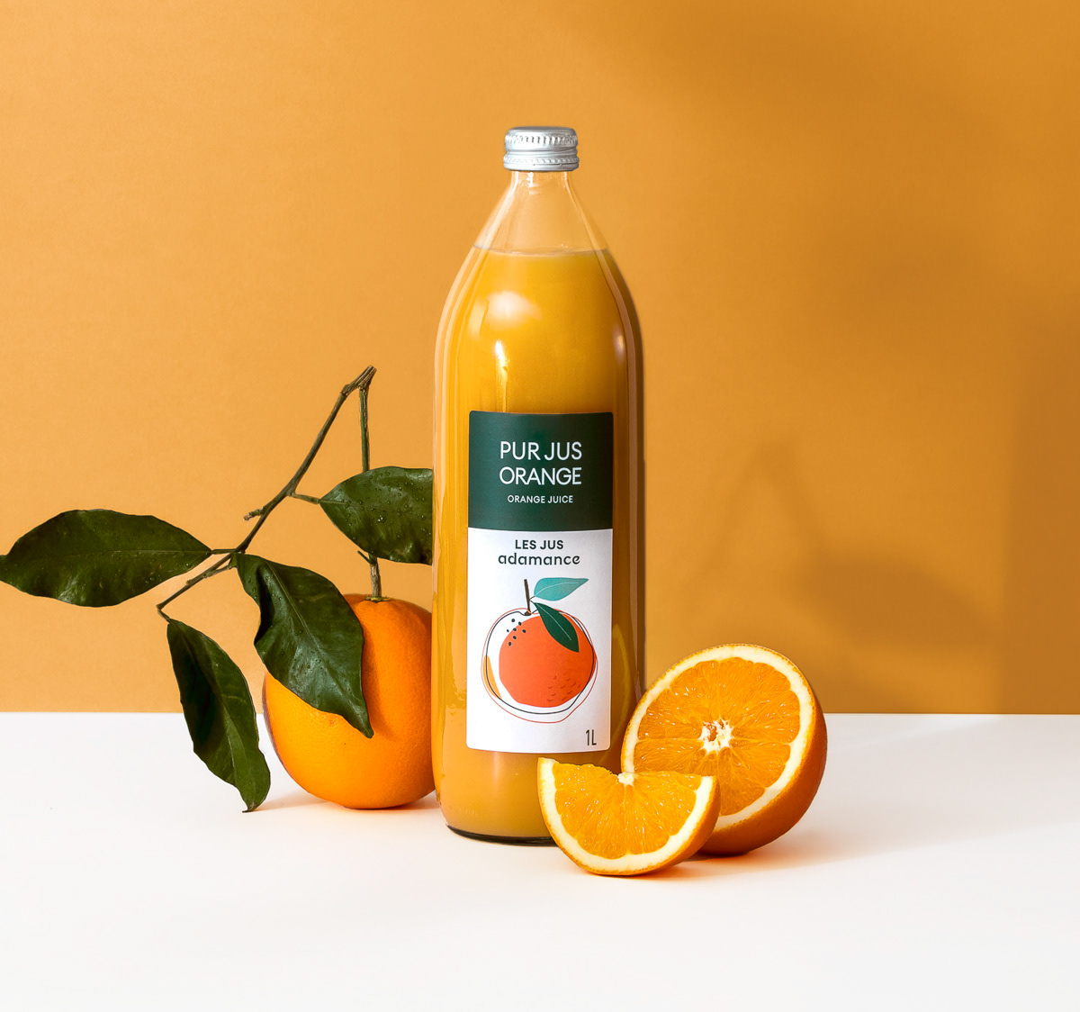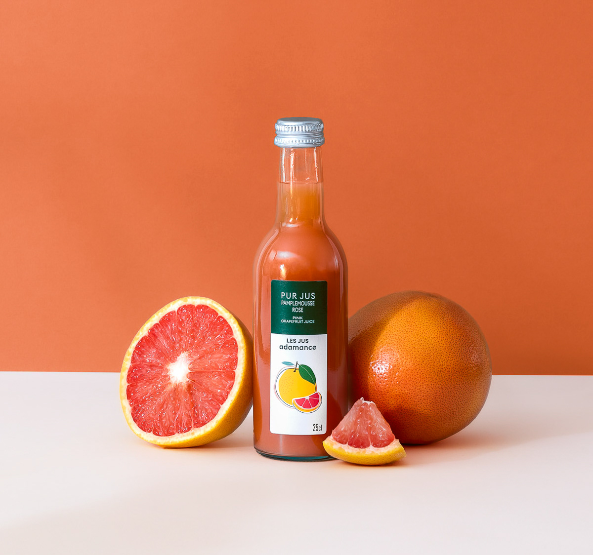 Shooting photo de packshot en studio d'une gamme complète de bouteilles de jus de fruit, mises en scènes au côté des fruits bruts avec une DA estivale et colorée - Pierre-Bénite, Grand Lyon, France