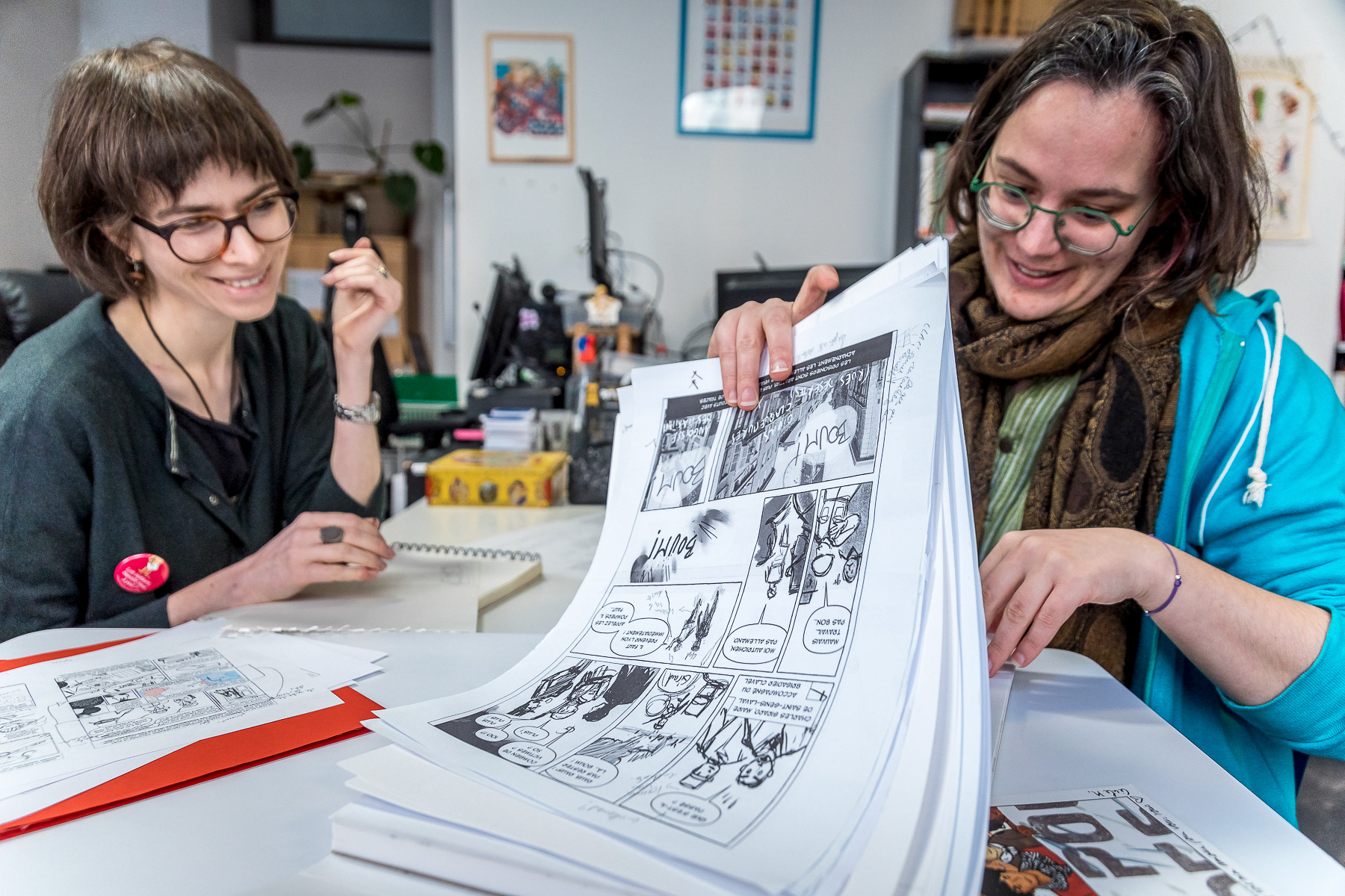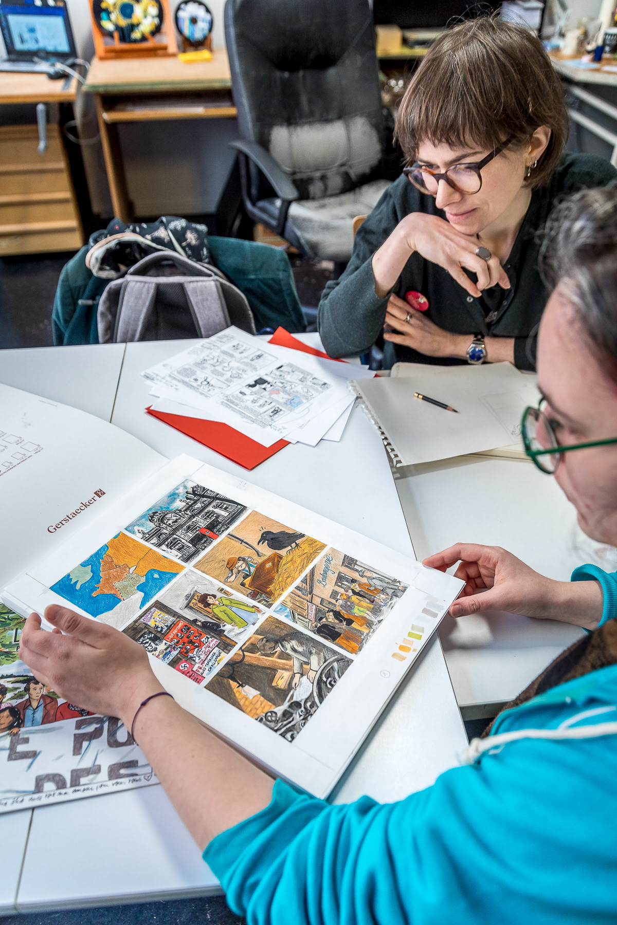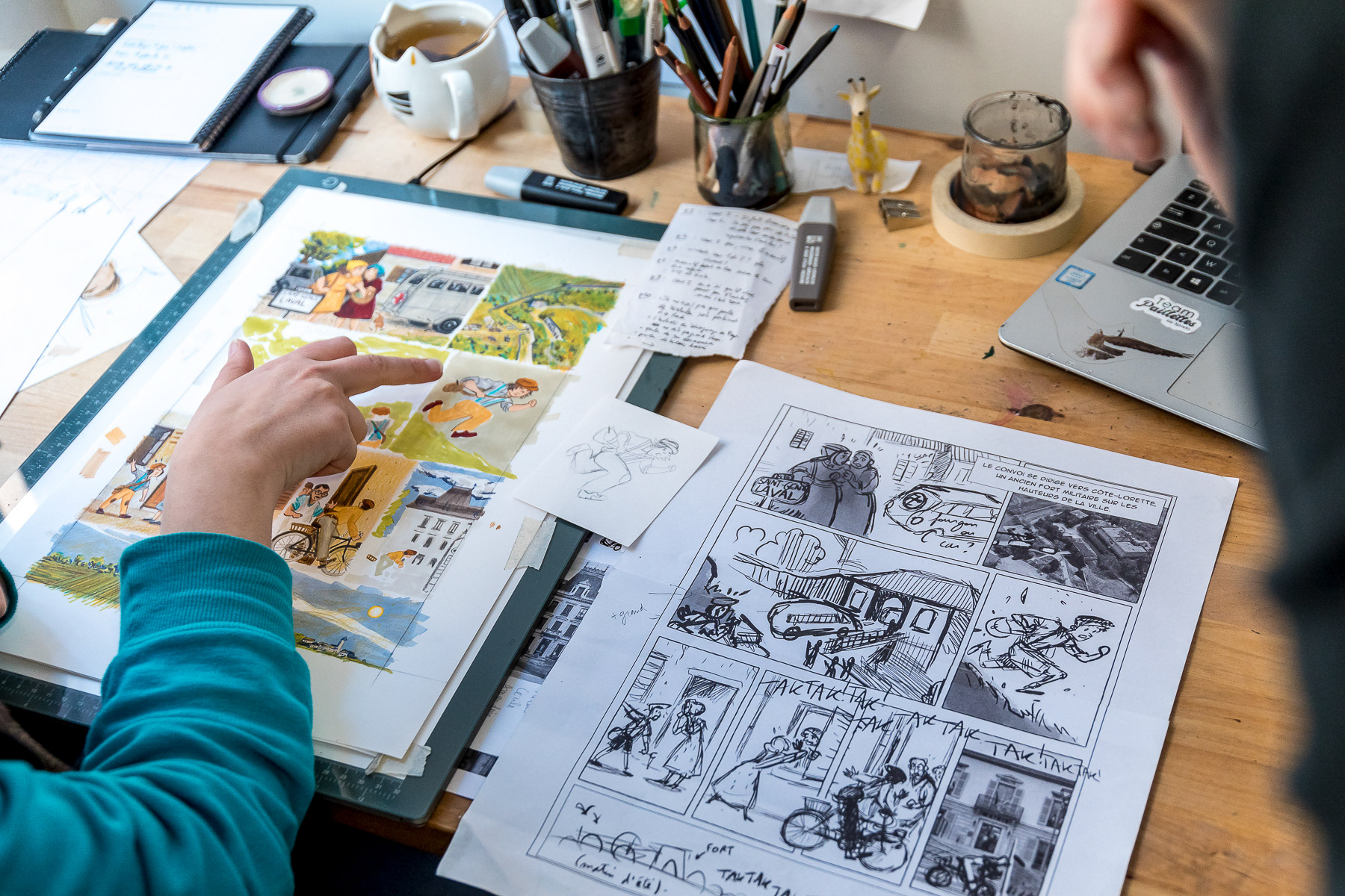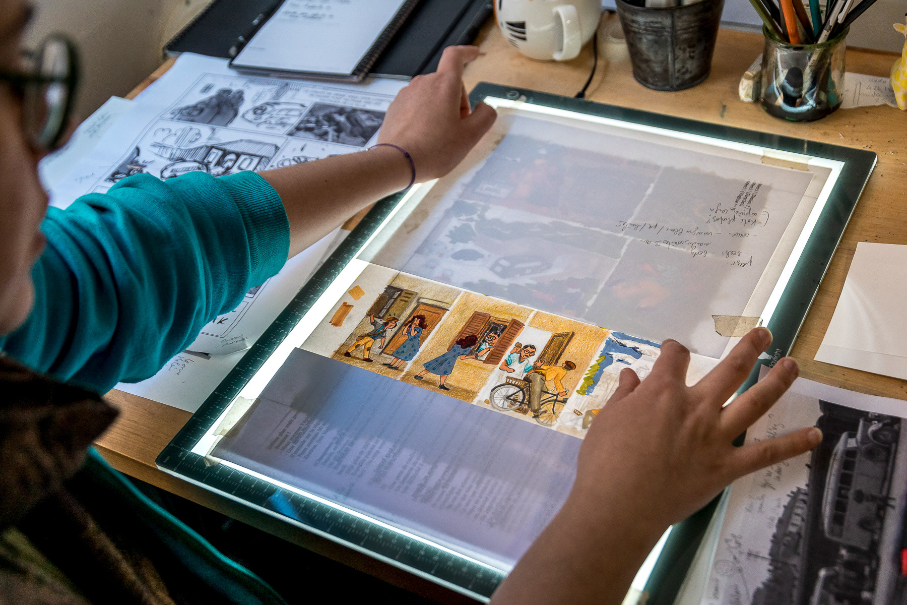 Reportage photo sur une illustratrice et une autrice durant des étapes de finalisation d'une bande destinée historique sur le massacre du Fort de Côte Lorette - Lyon, France
