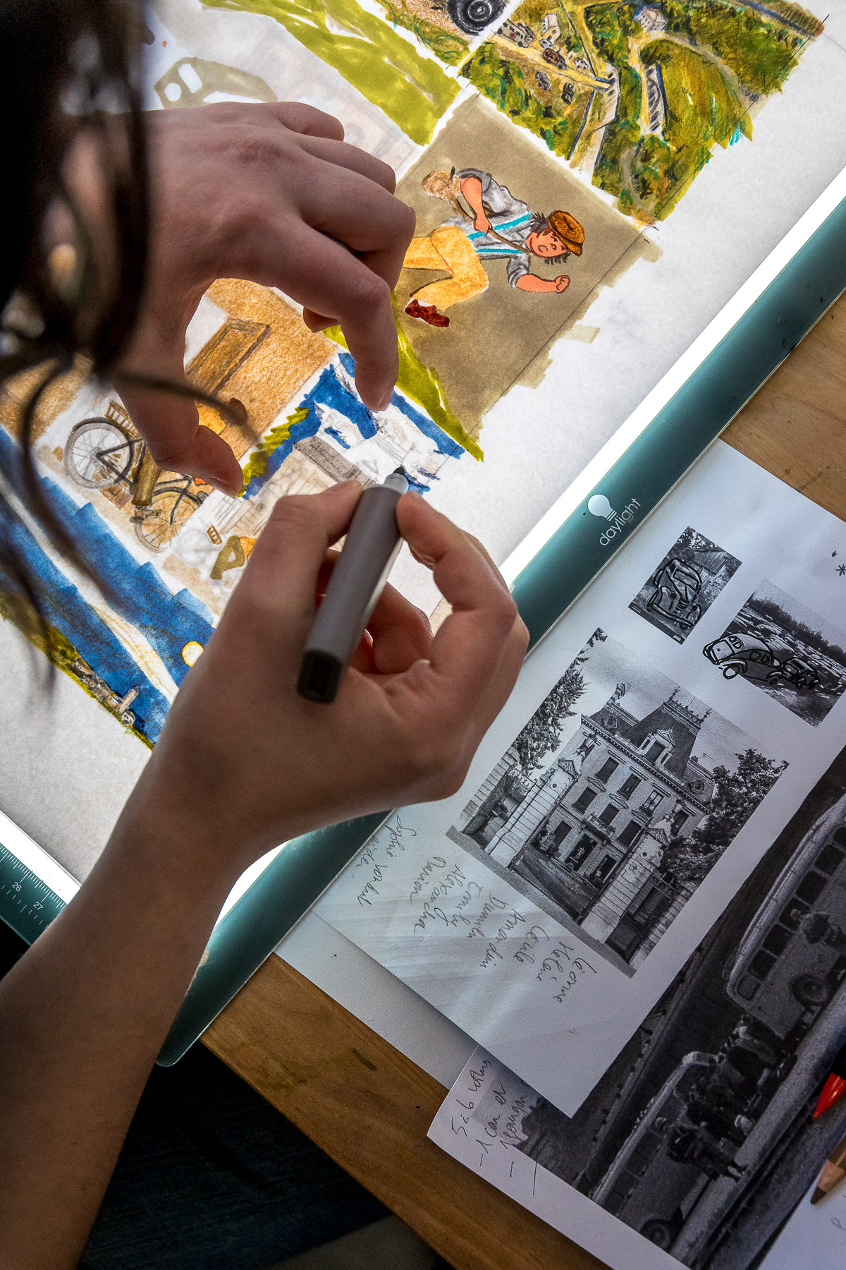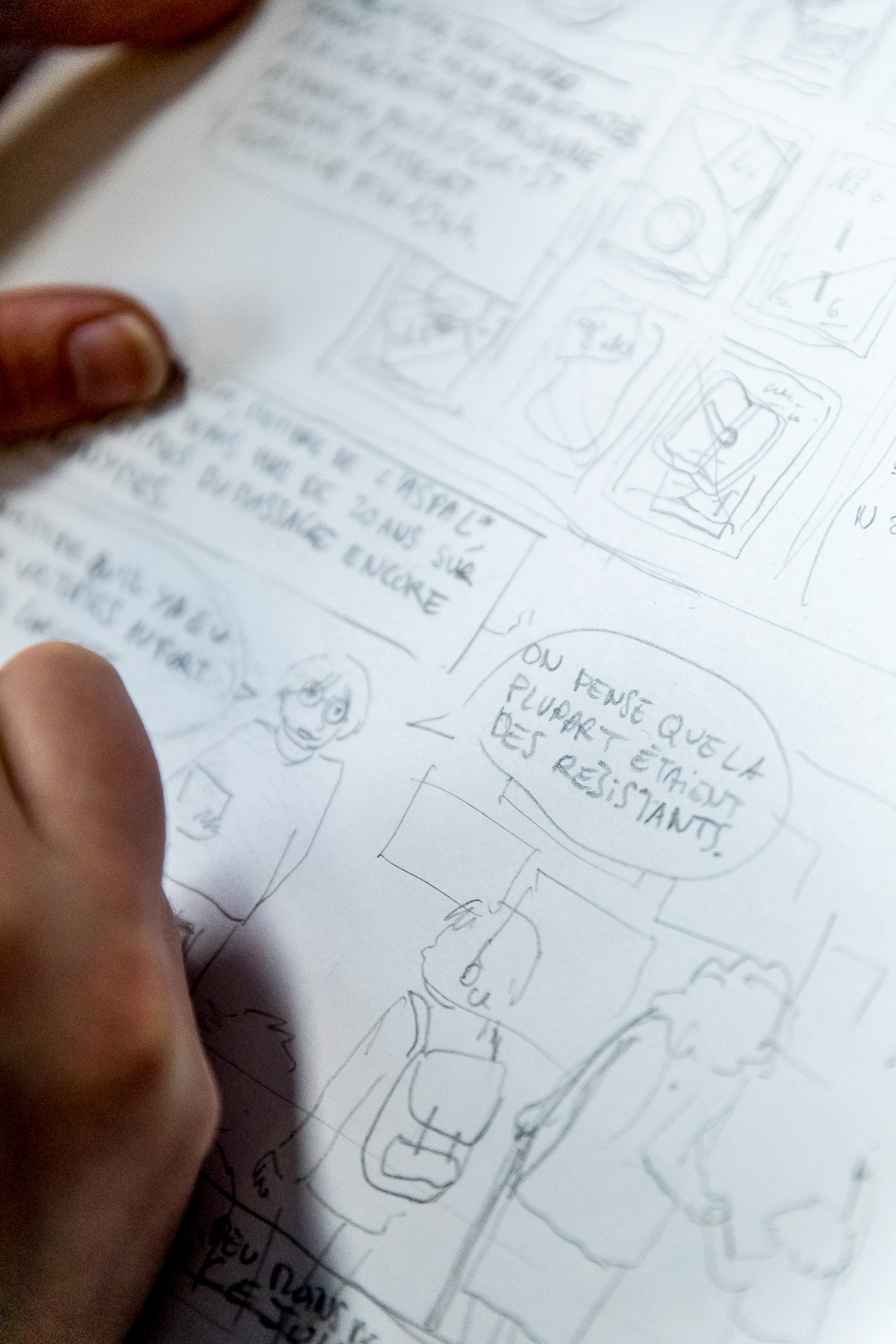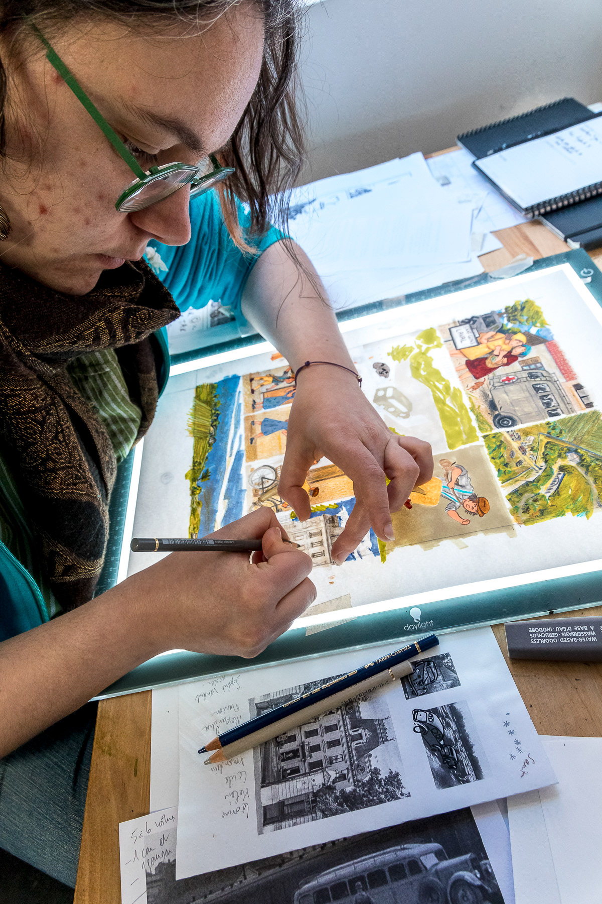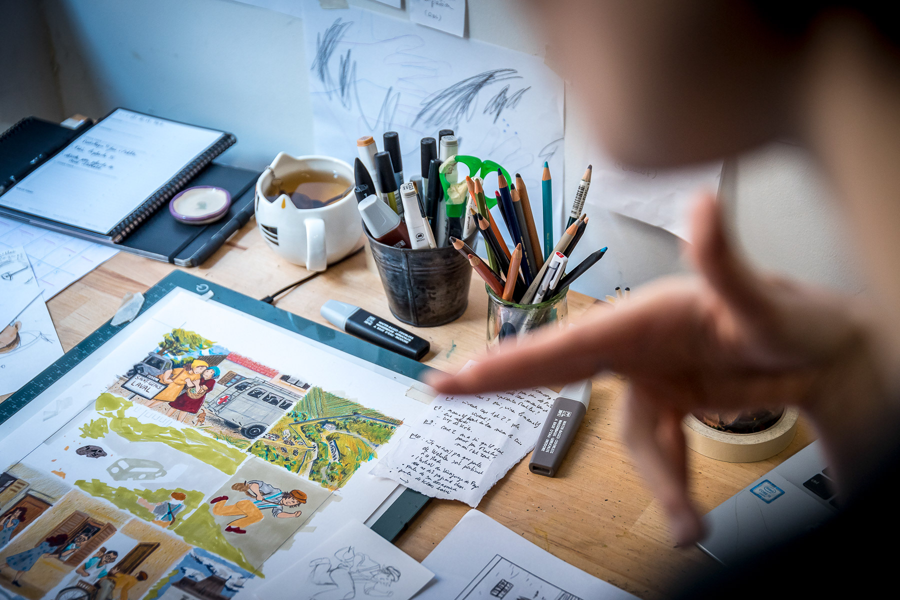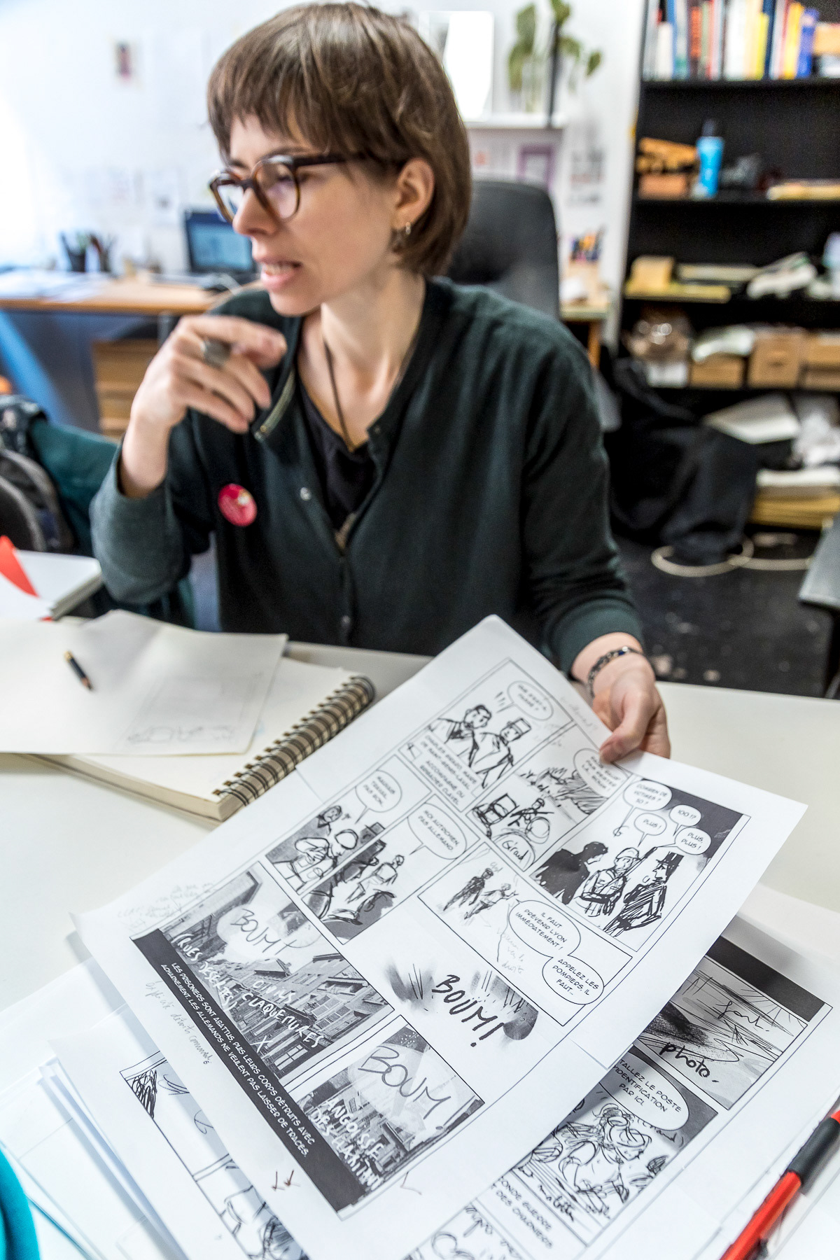 Reportage photo sur une illustratrice et une autrice durant des étapes de finalisation d'une bande destinée historique sur le massacre du Fort de Côte Lorette - Lyon, France