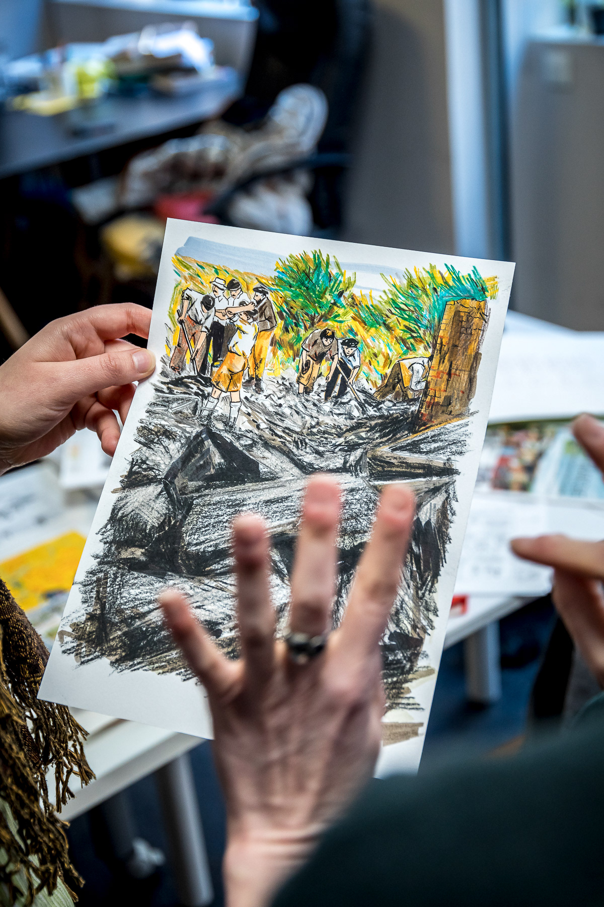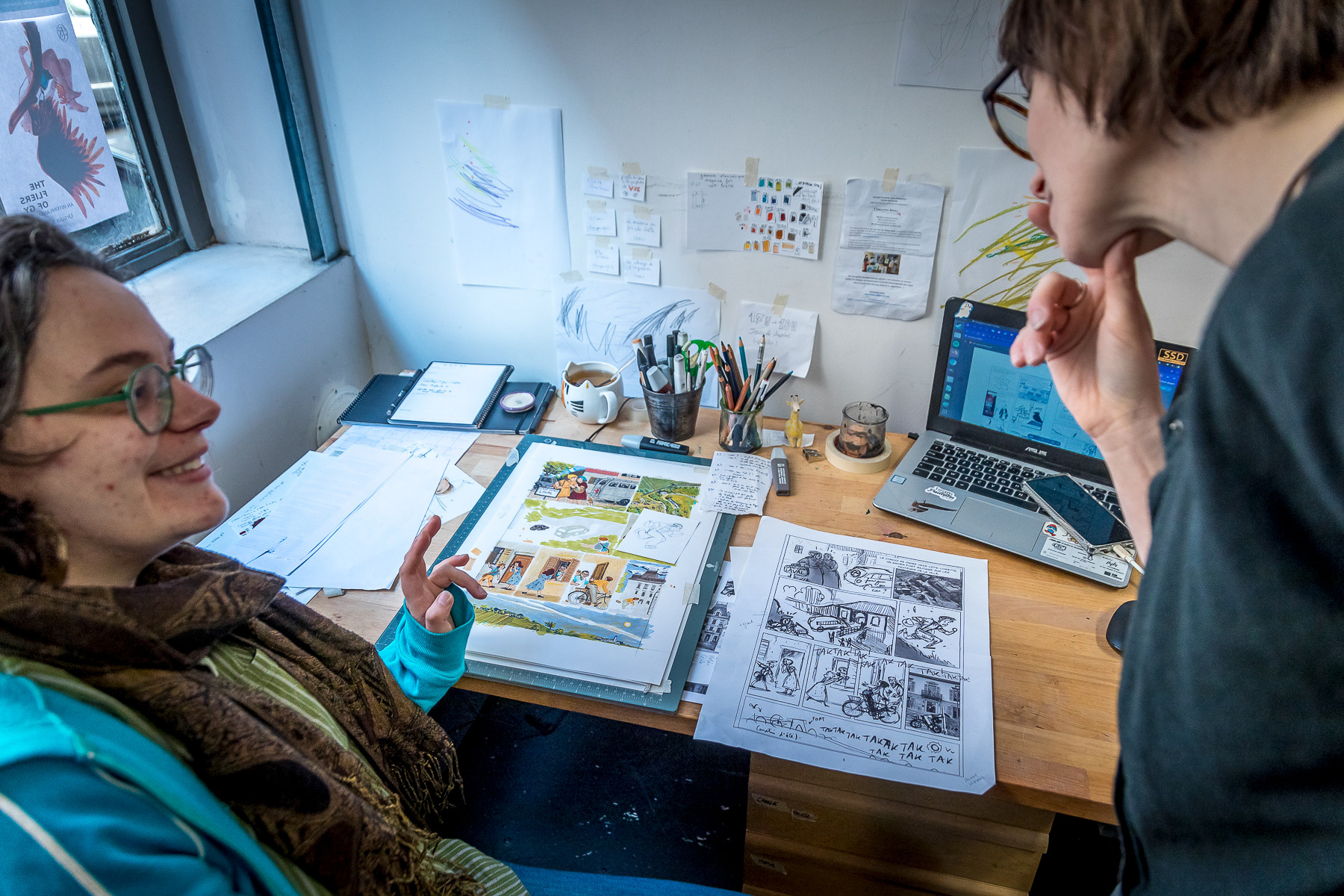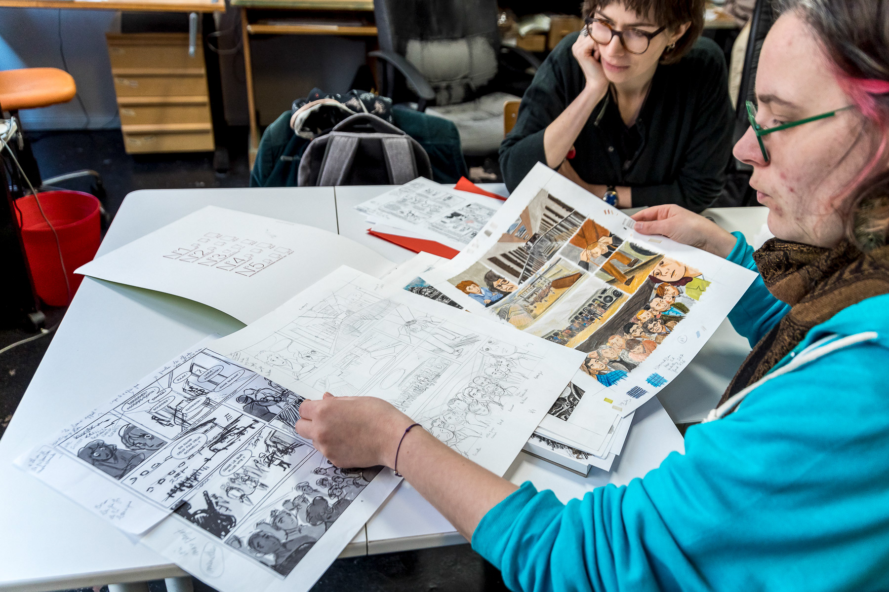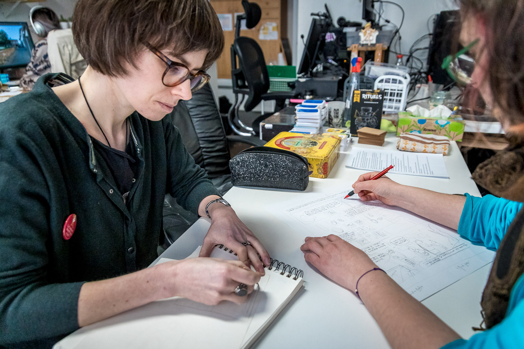 Reportage photo sur une illustratrice et une autrice durant des étapes de finalisation d'une bande destinée historique sur le massacre du Fort de Côte Lorette - Lyon, France