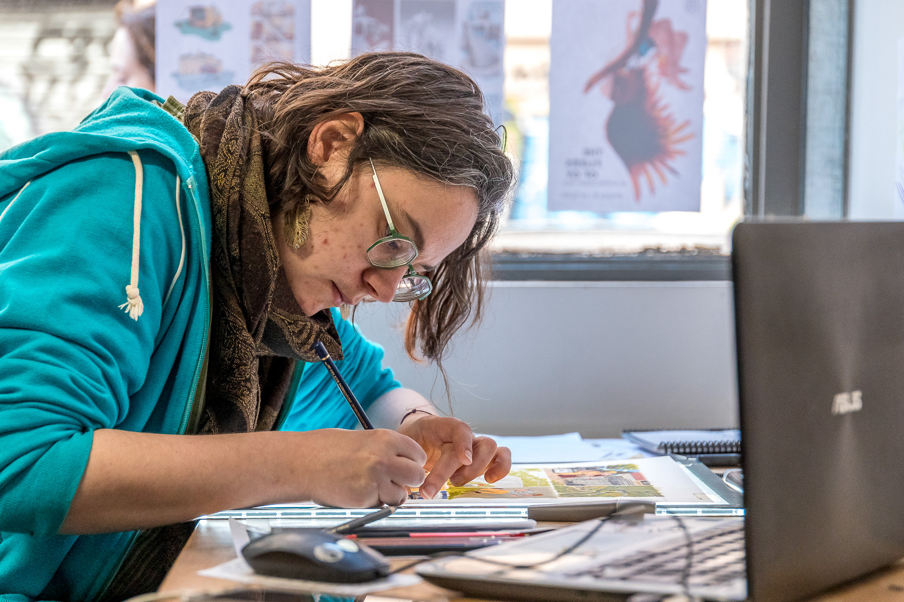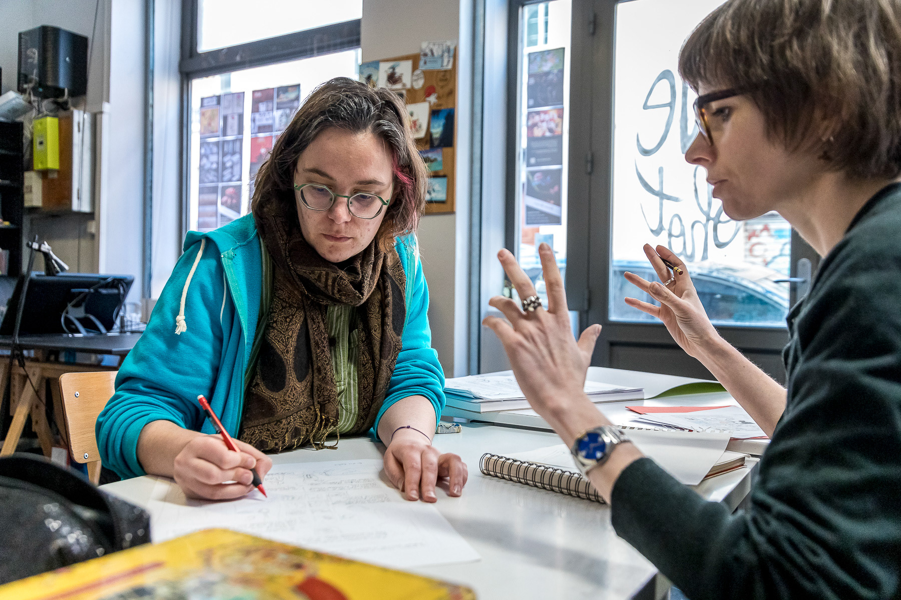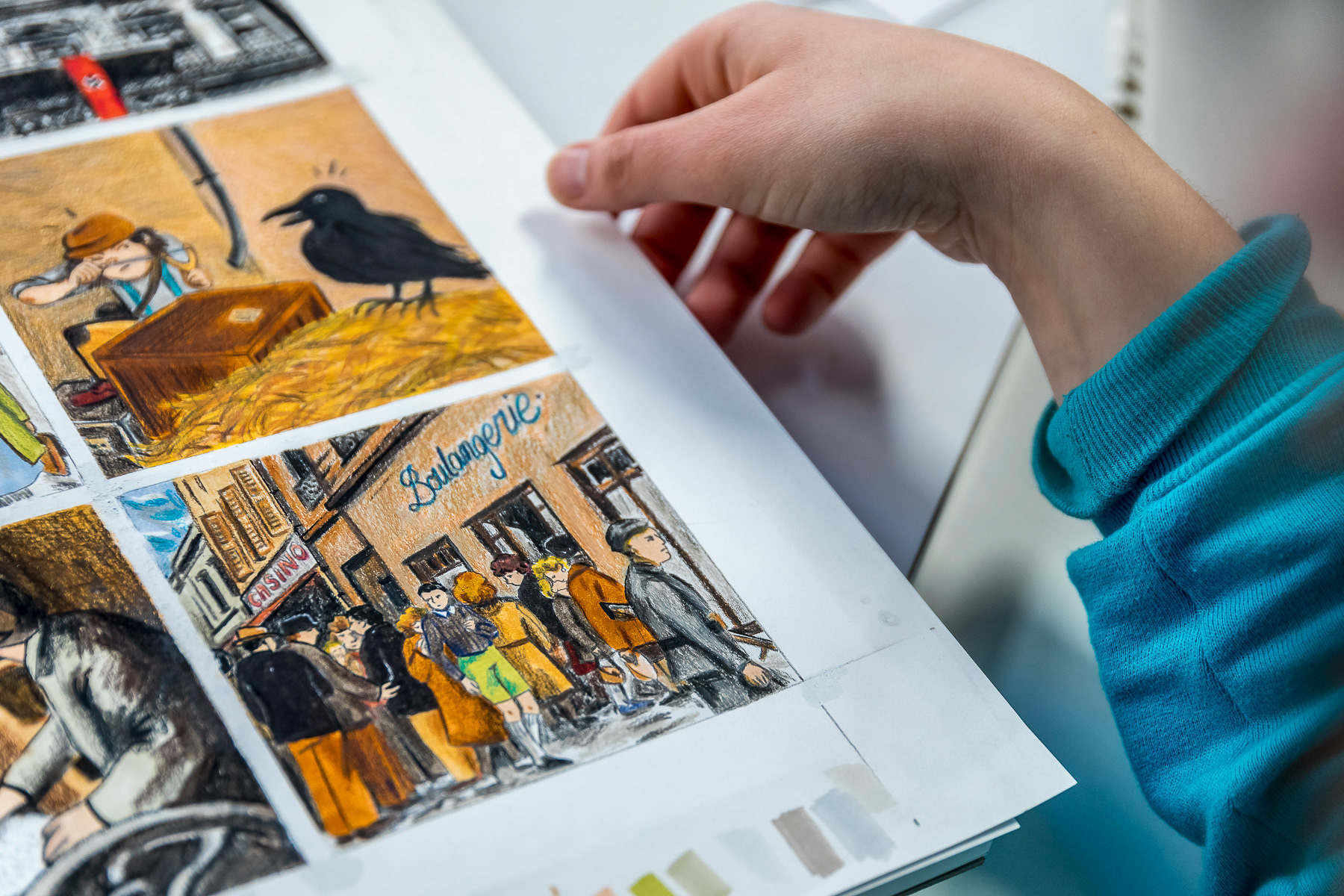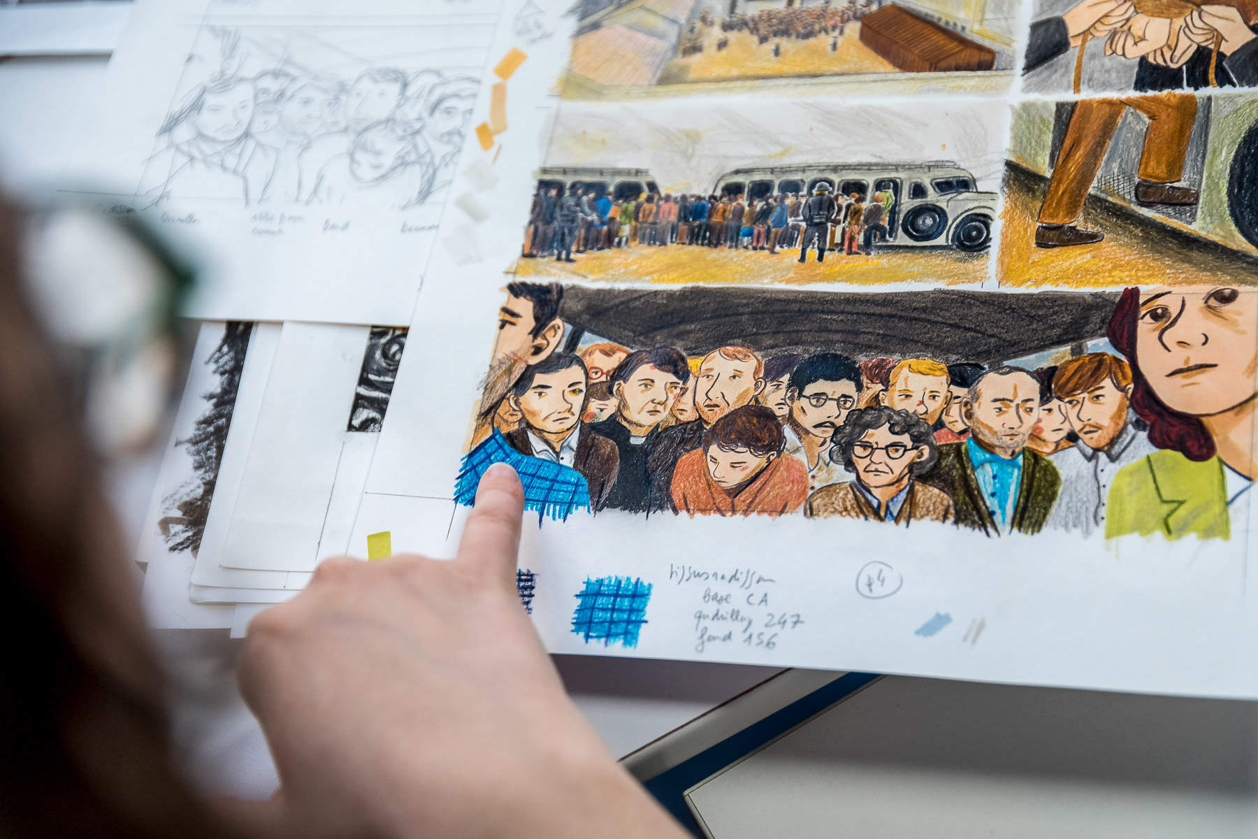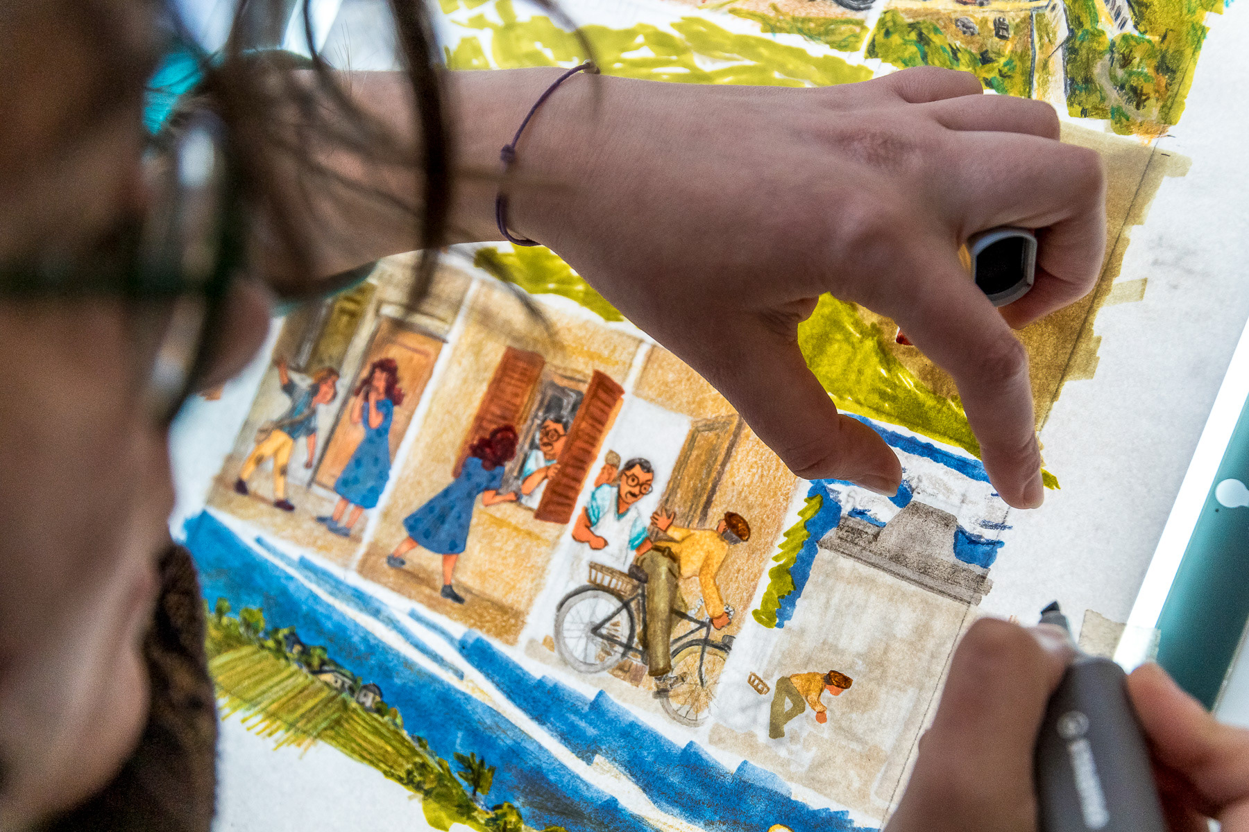 Reportage photo sur une illustratrice et une autrice durant des étapes de finalisation d'une bande destinée historique sur le massacre du Fort de Côte Lorette - Lyon, France