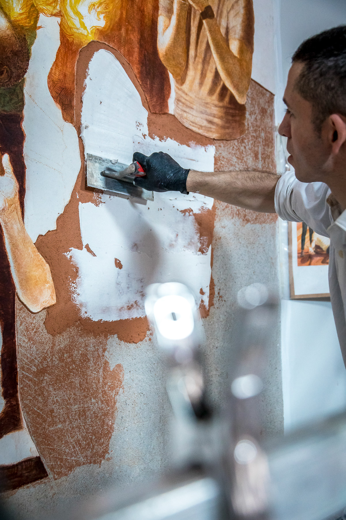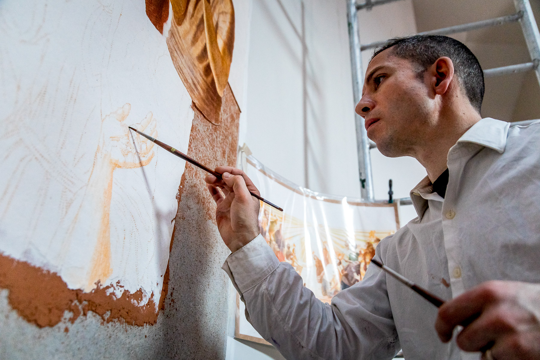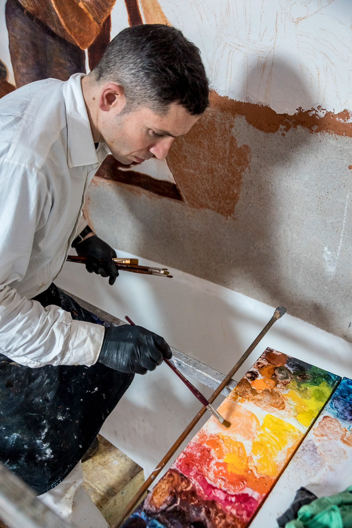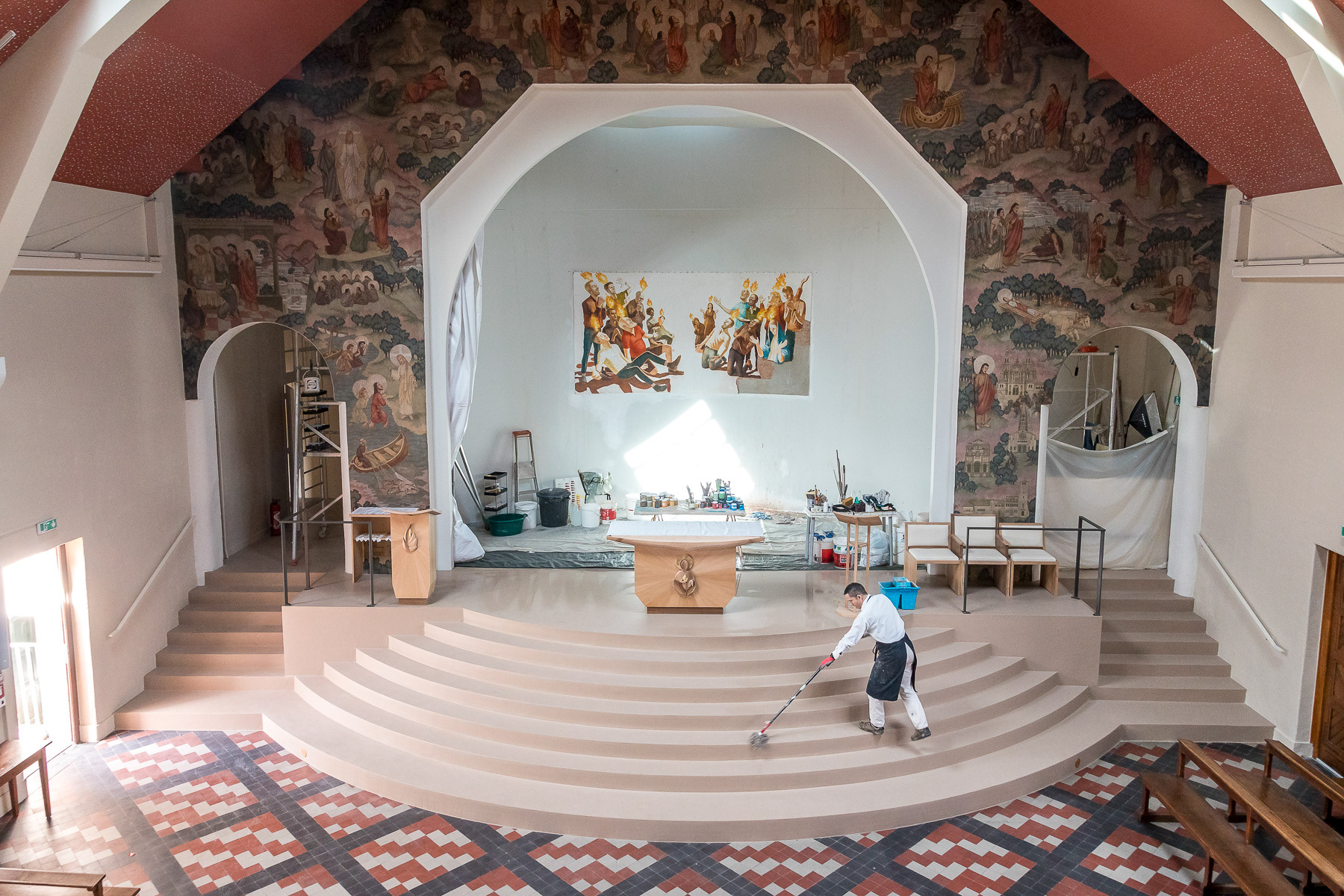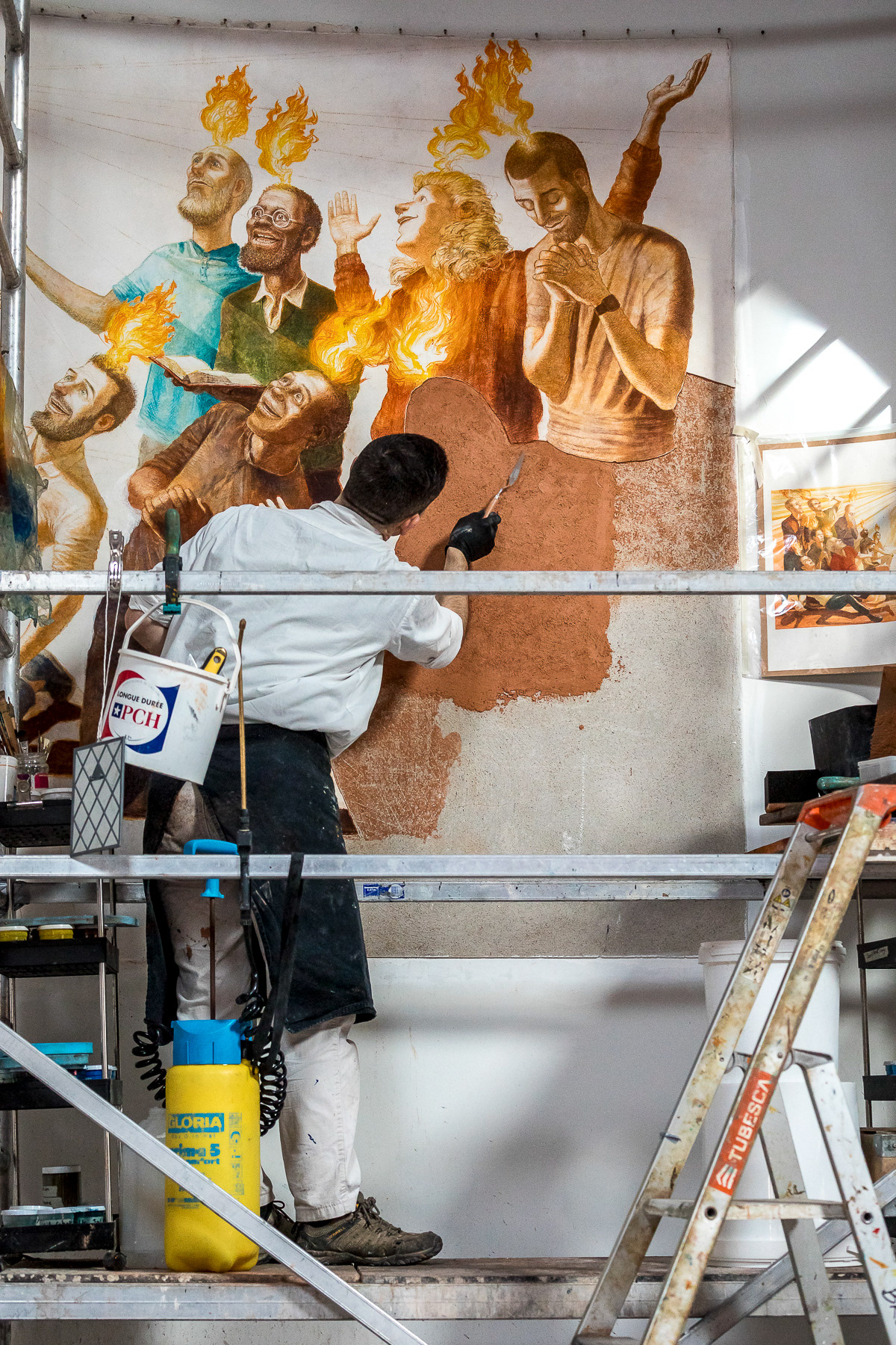 Reportage photo réalisé sur plusieurs jours pour suivre quelques étapes de la réalisation d'une fresque monumentale à la chaux,dans une église lyonnaise, par un artiste maitrisant cette technique rare et spécifique - Lyon, France