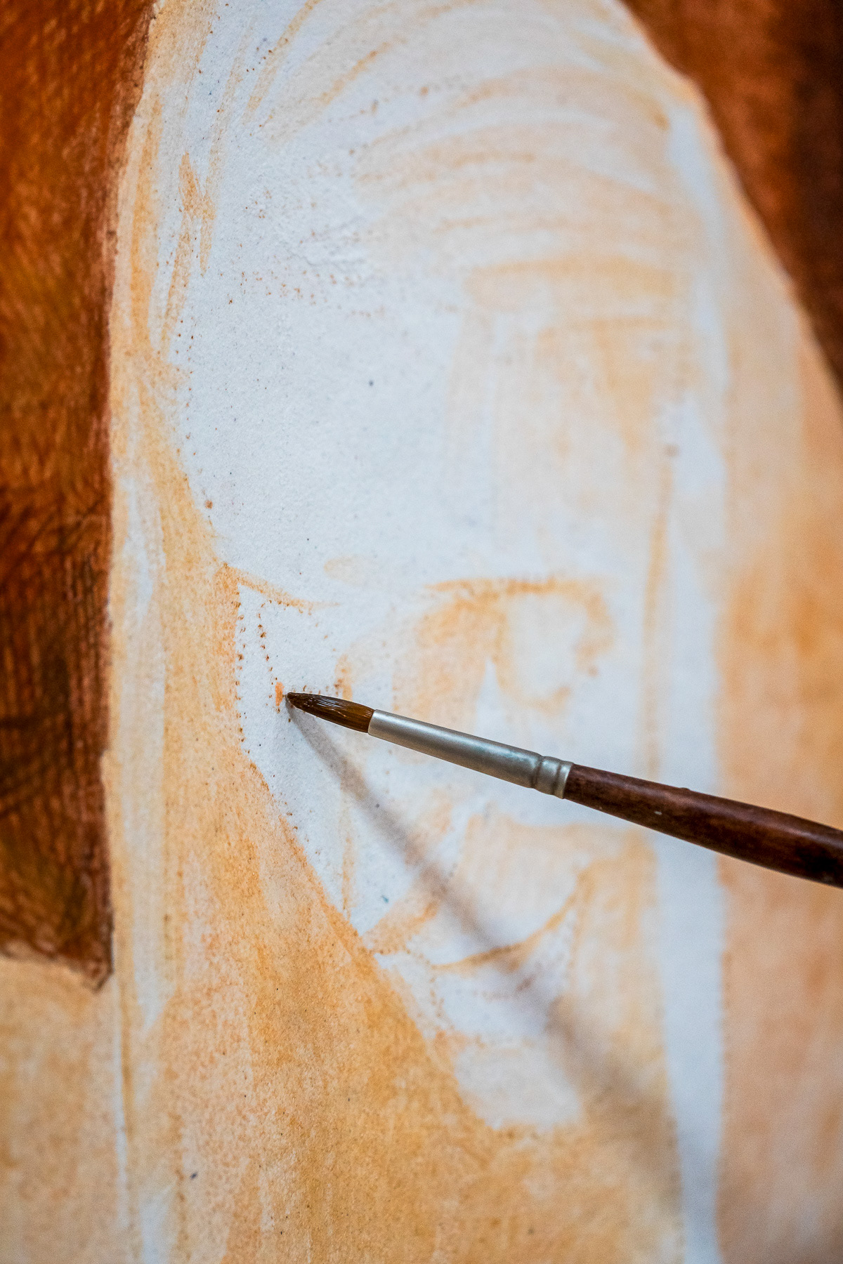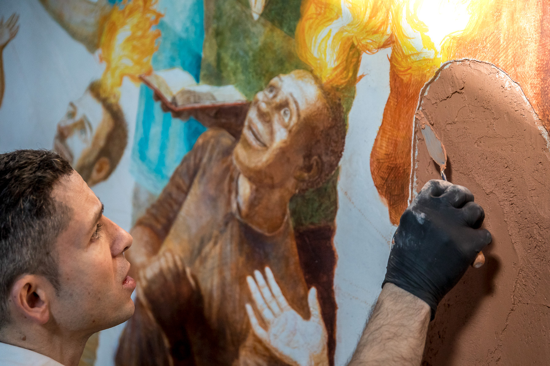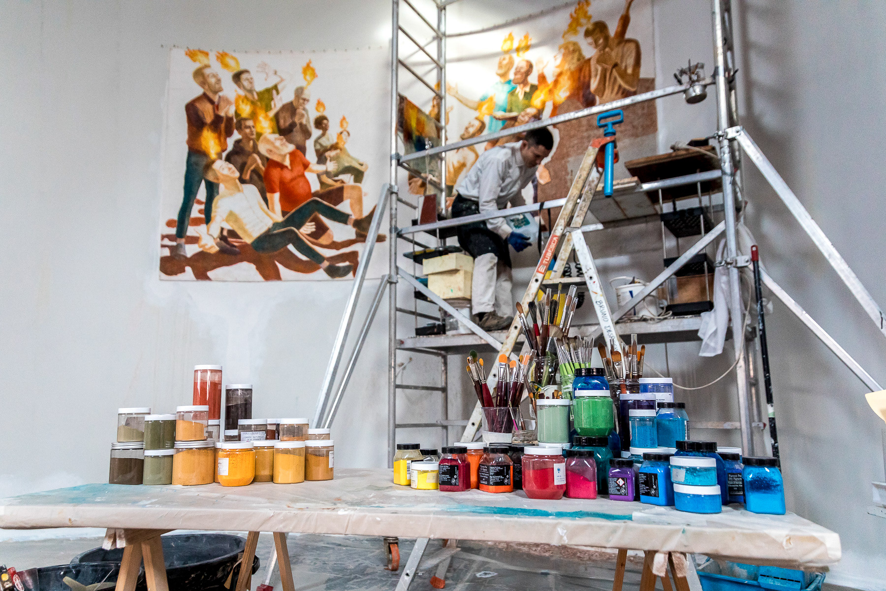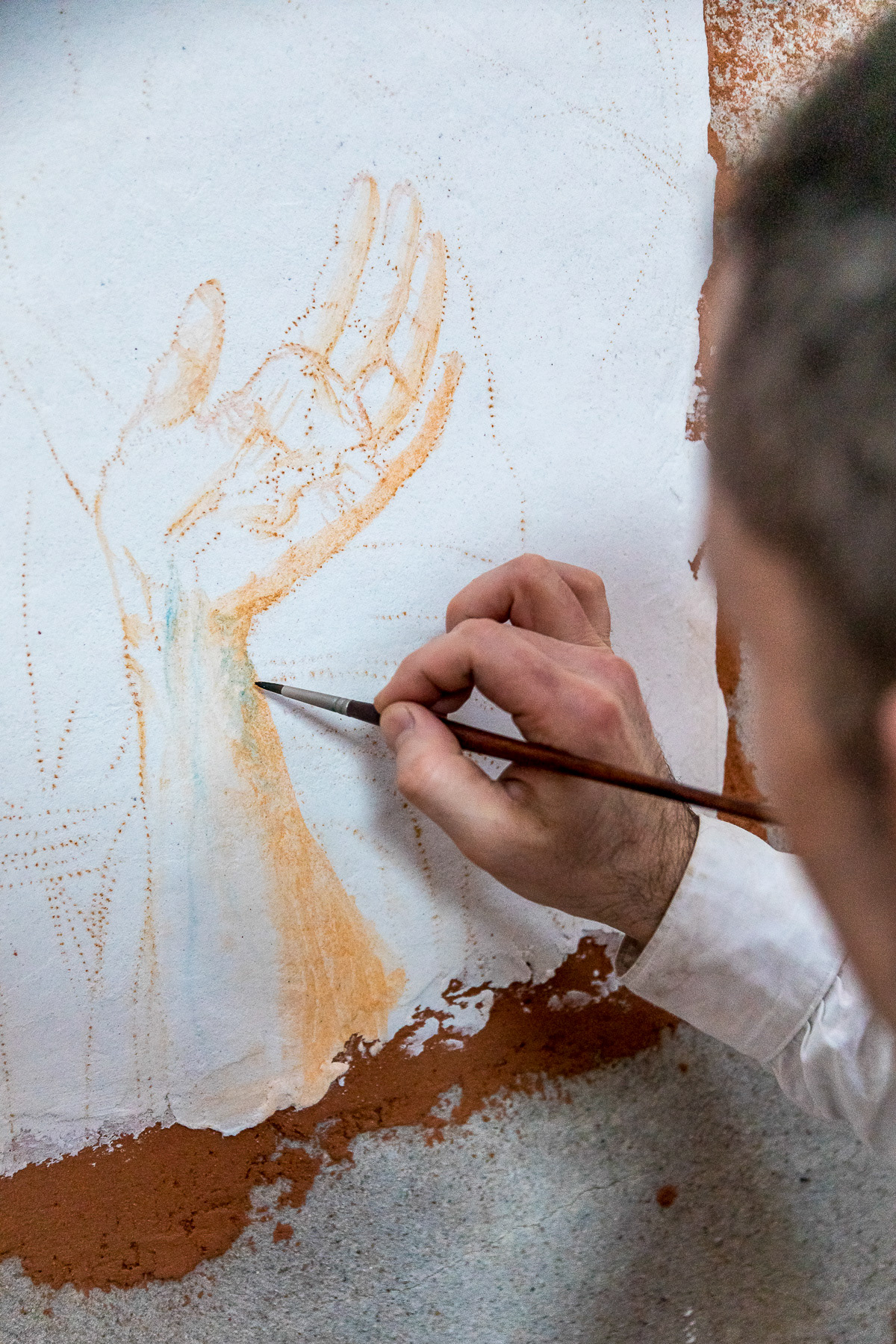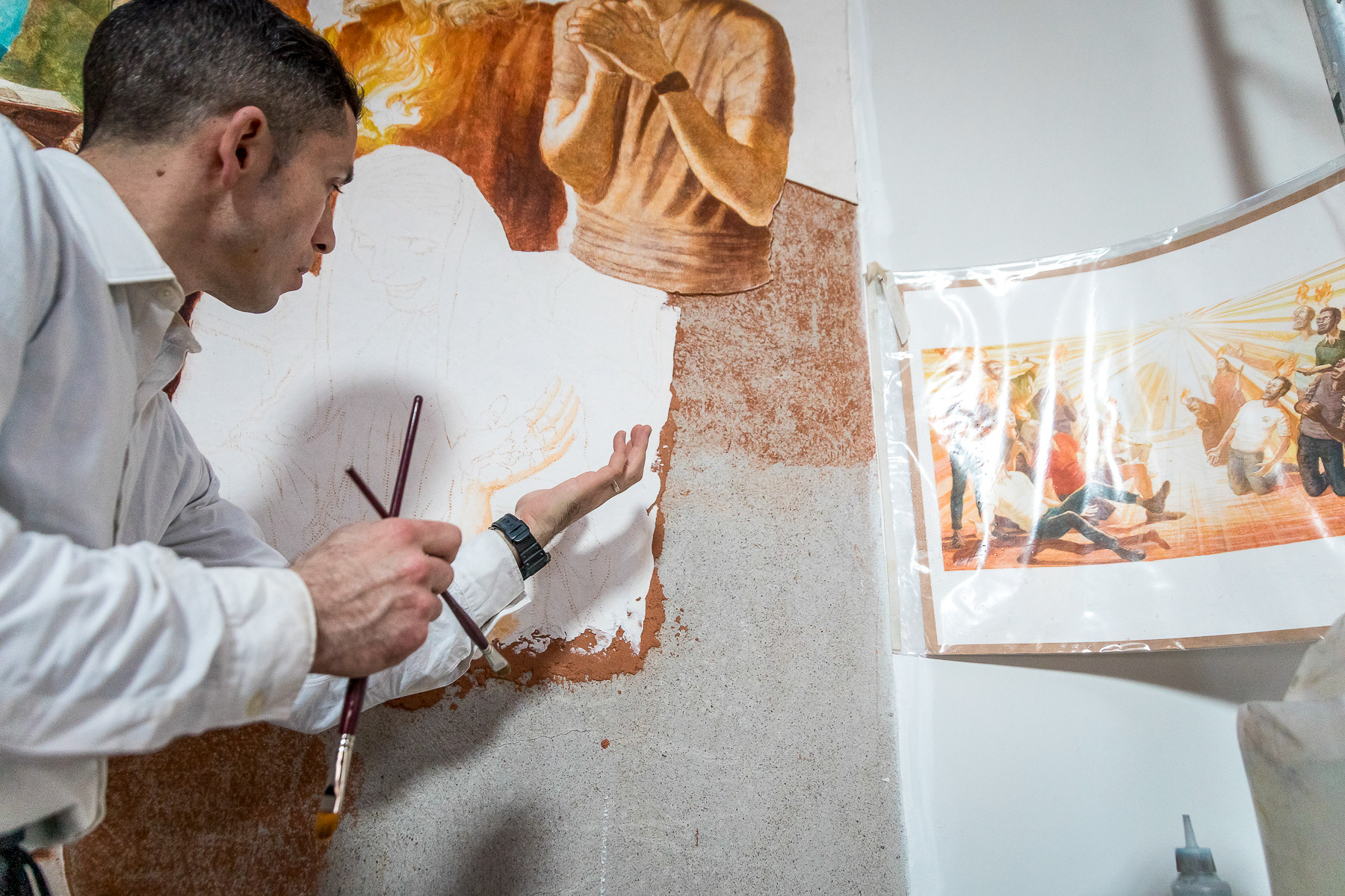 Reportage photo réalisé sur plusieurs jours pour suivre quelques étapes de la réalisation d'une fresque monumentale à la chaux,dans une église lyonnaise, par un artiste maitrisant cette technique rare et spécifique - Lyon, France