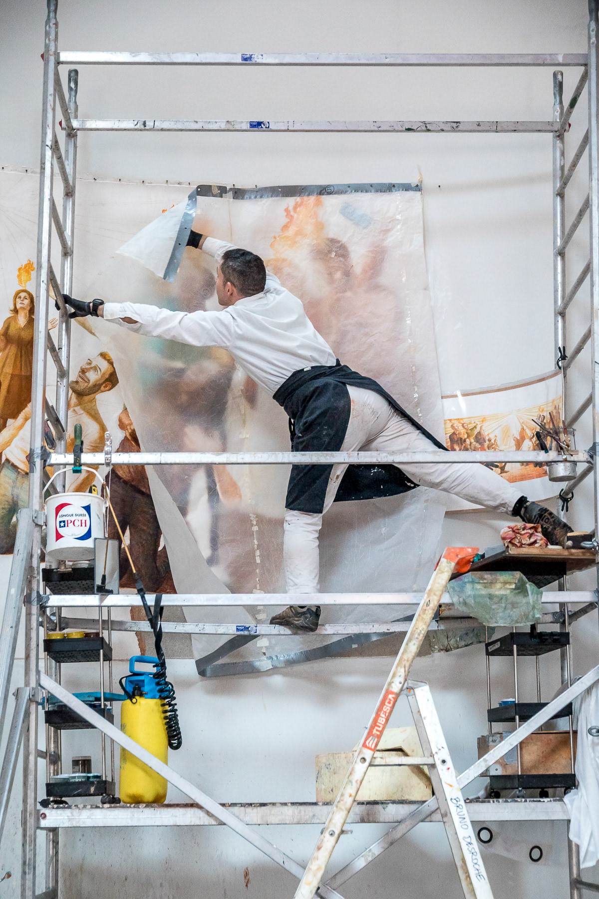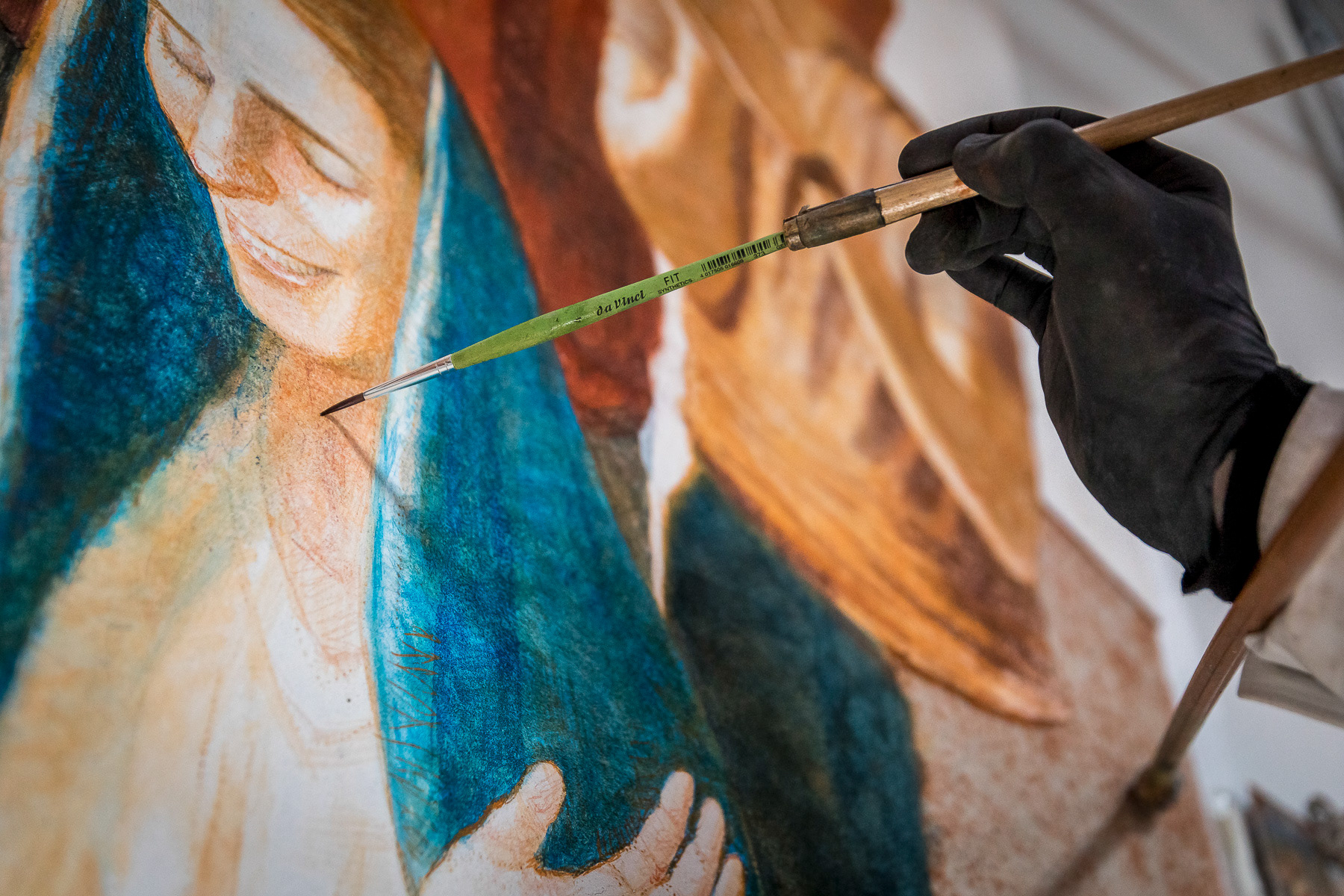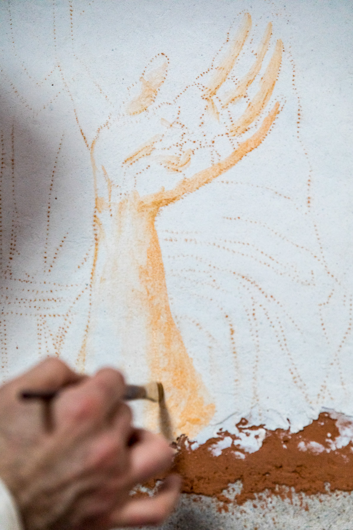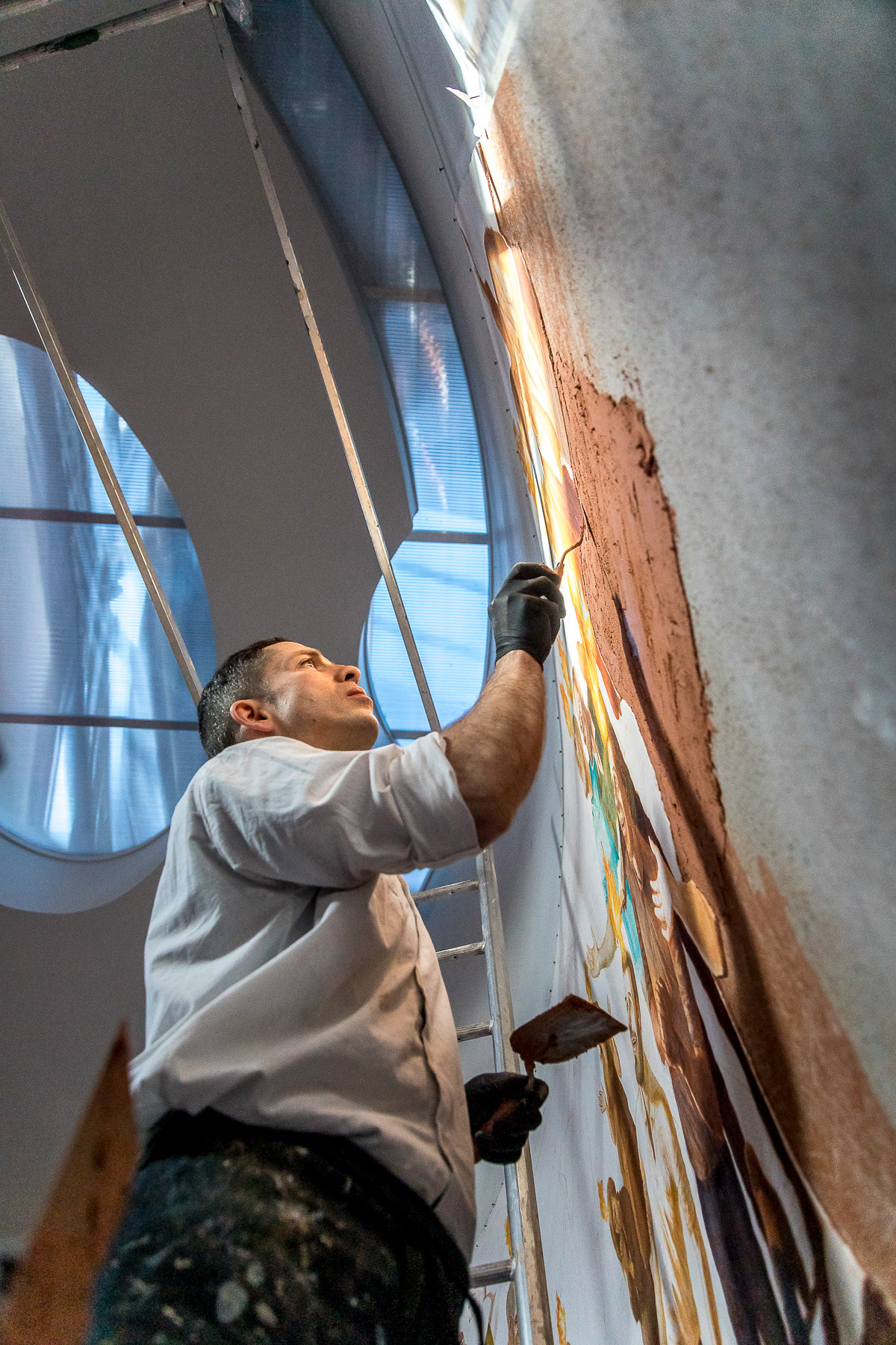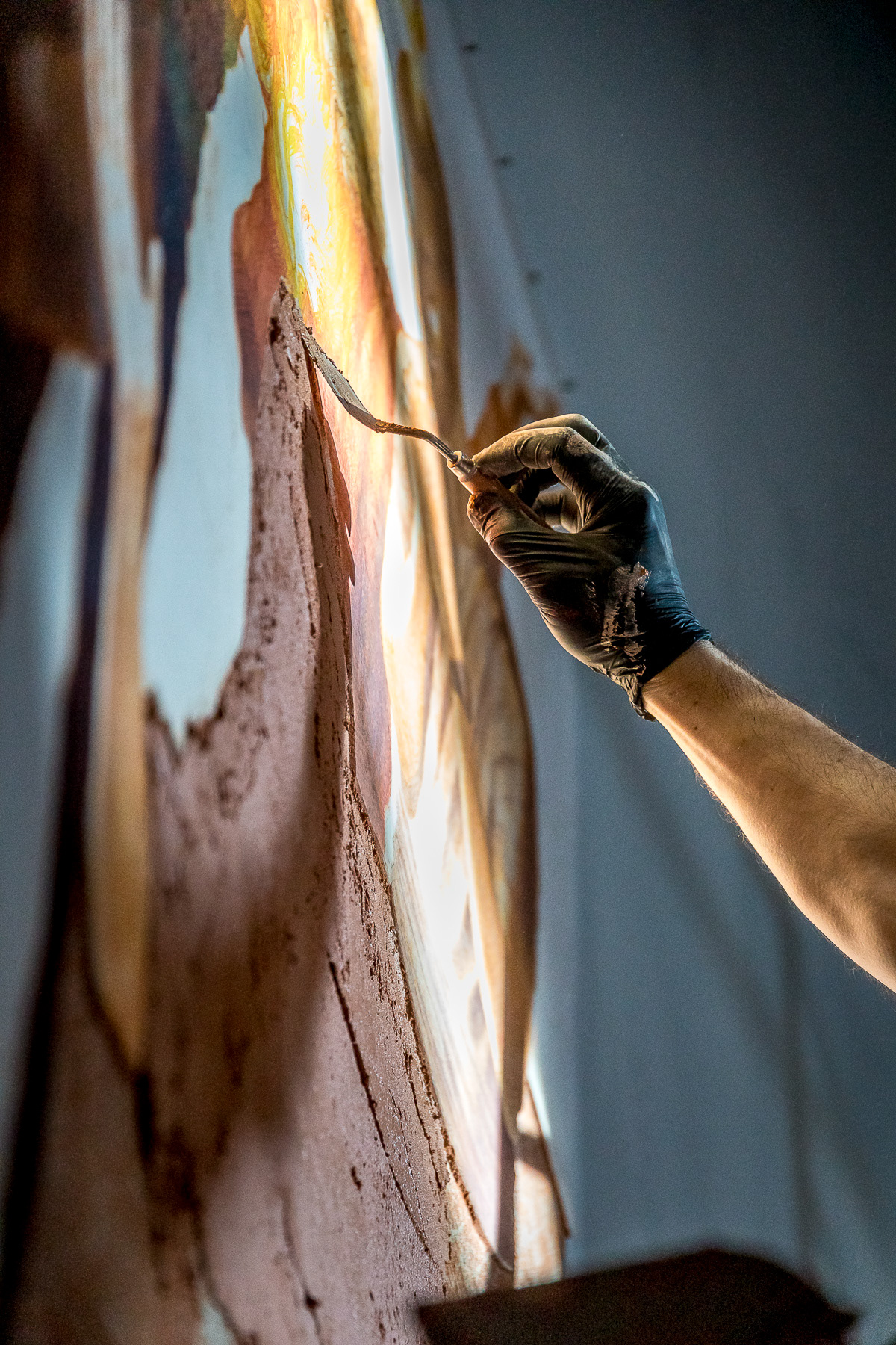 Reportage photo réalisé sur plusieurs jours pour suivre quelques étapes de la réalisation d'une fresque monumentale à la chaux,dans une église lyonnaise, par un artiste maitrisant cette technique rare et spécifique - Lyon, France