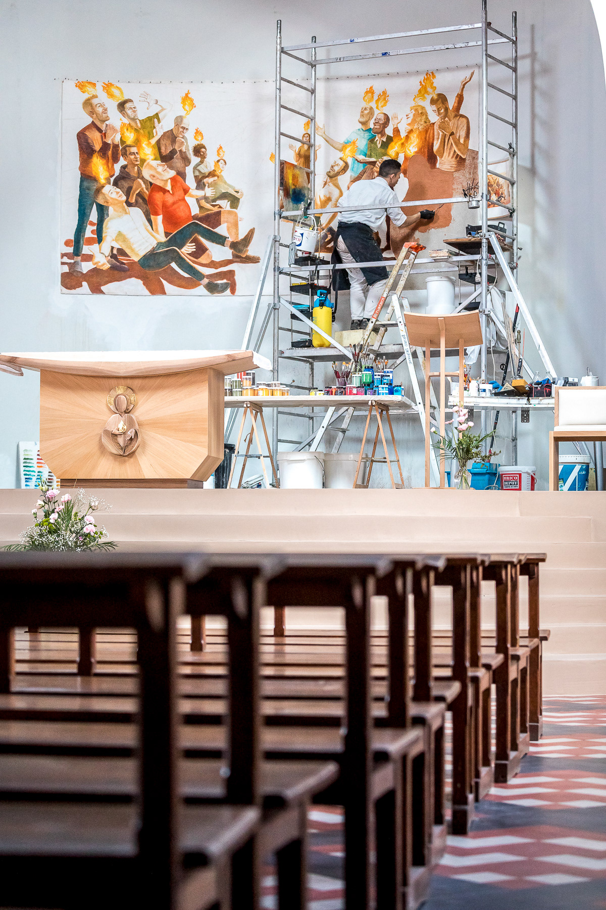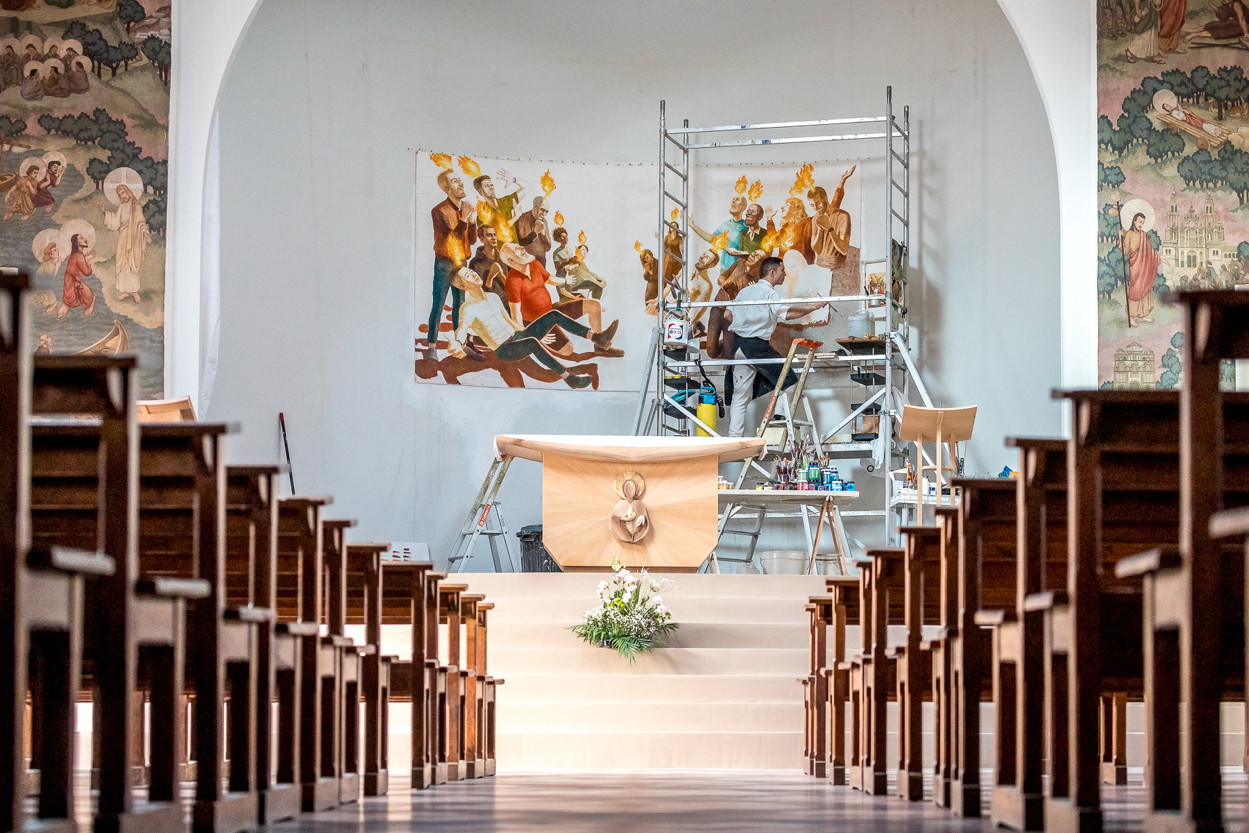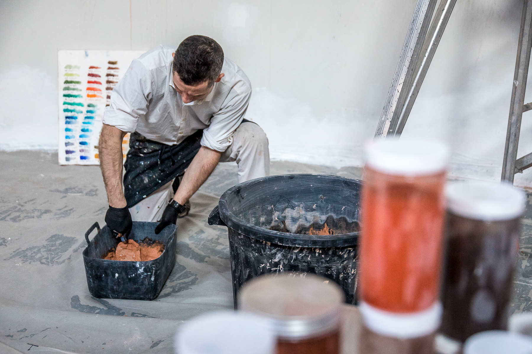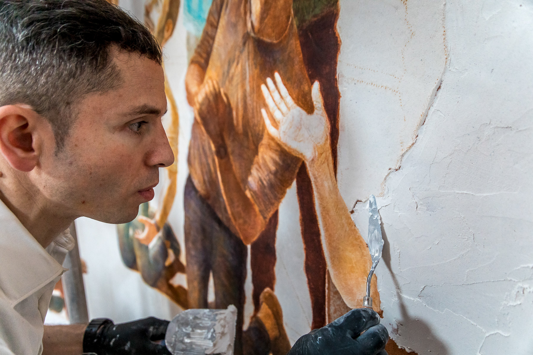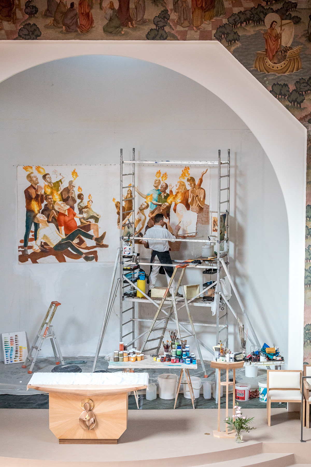 Reportage photo réalisé sur plusieurs jours pour suivre quelques étapes de la réalisation d'une fresque monumentale à la chaux,dans une église lyonnaise, par un artiste maitrisant cette technique rare et spécifique - Lyon, France