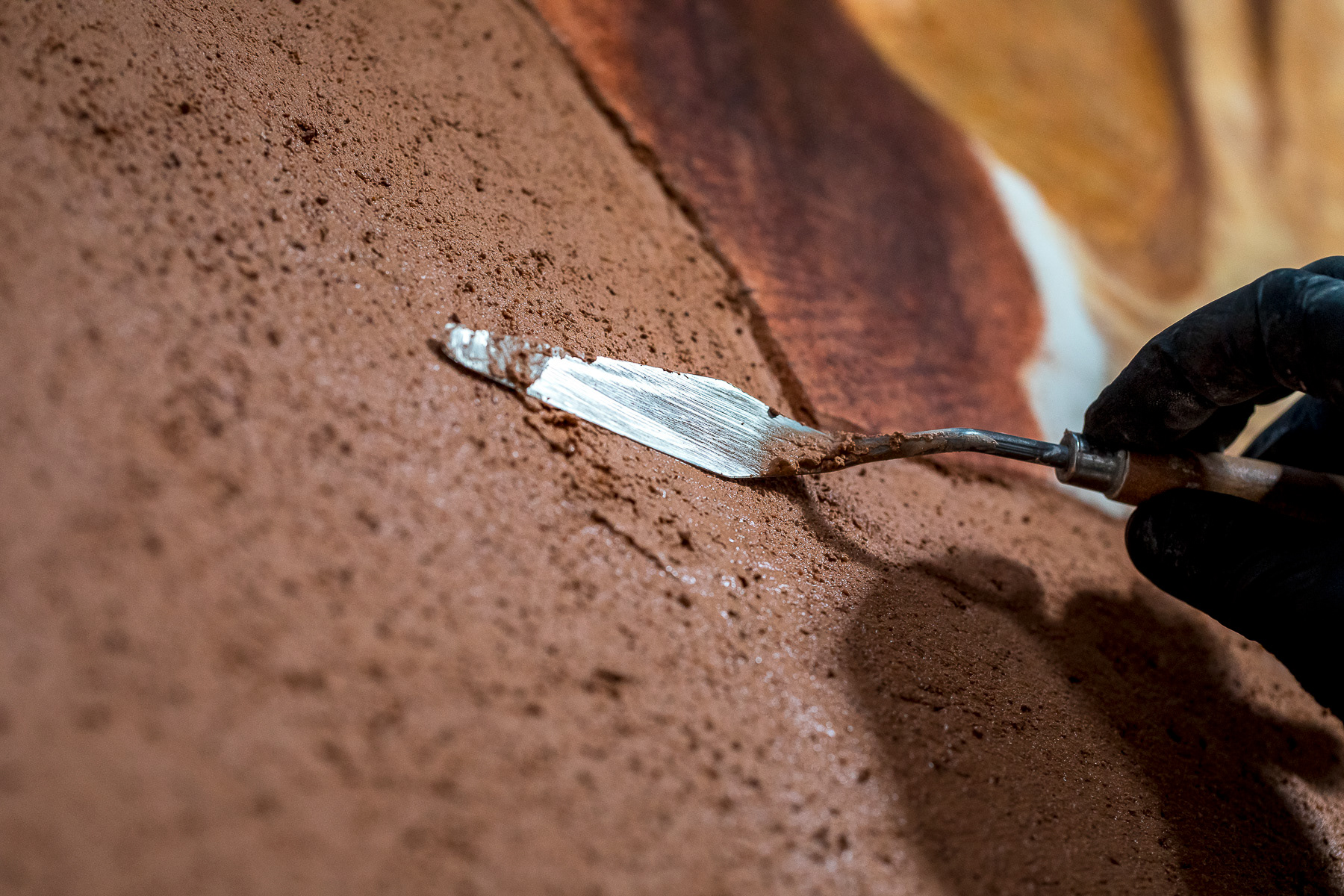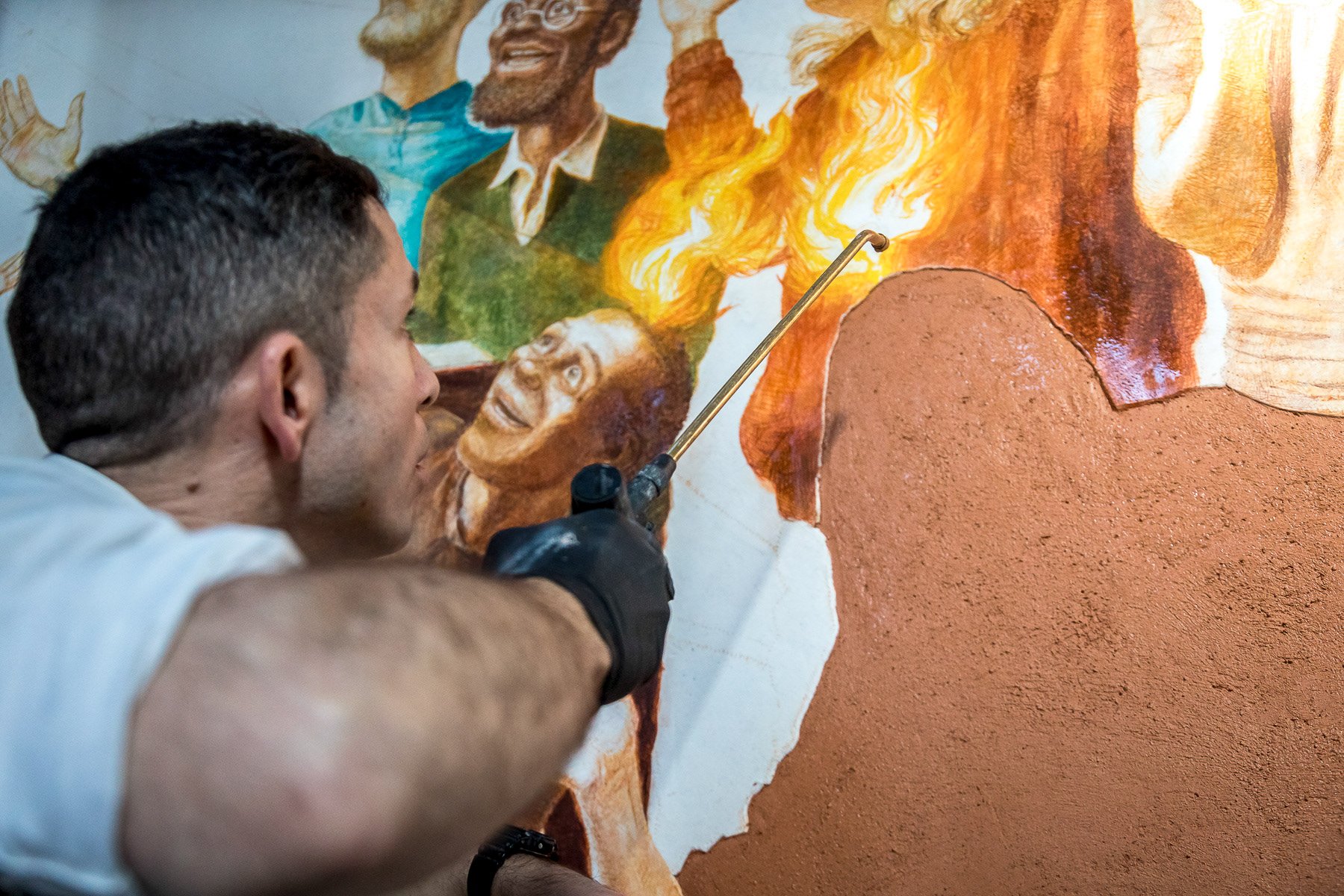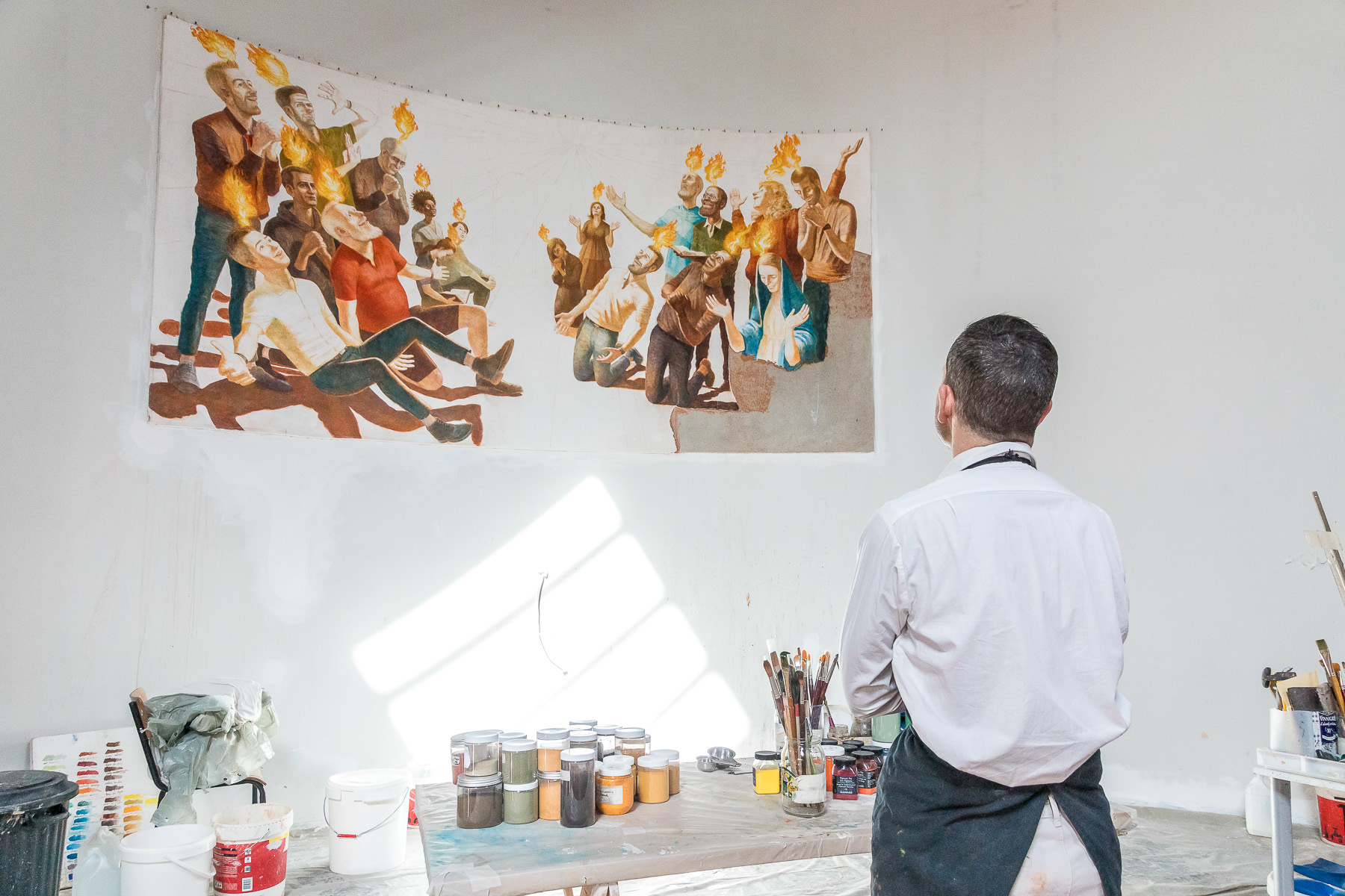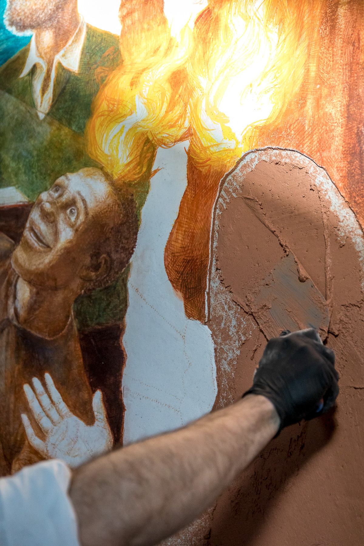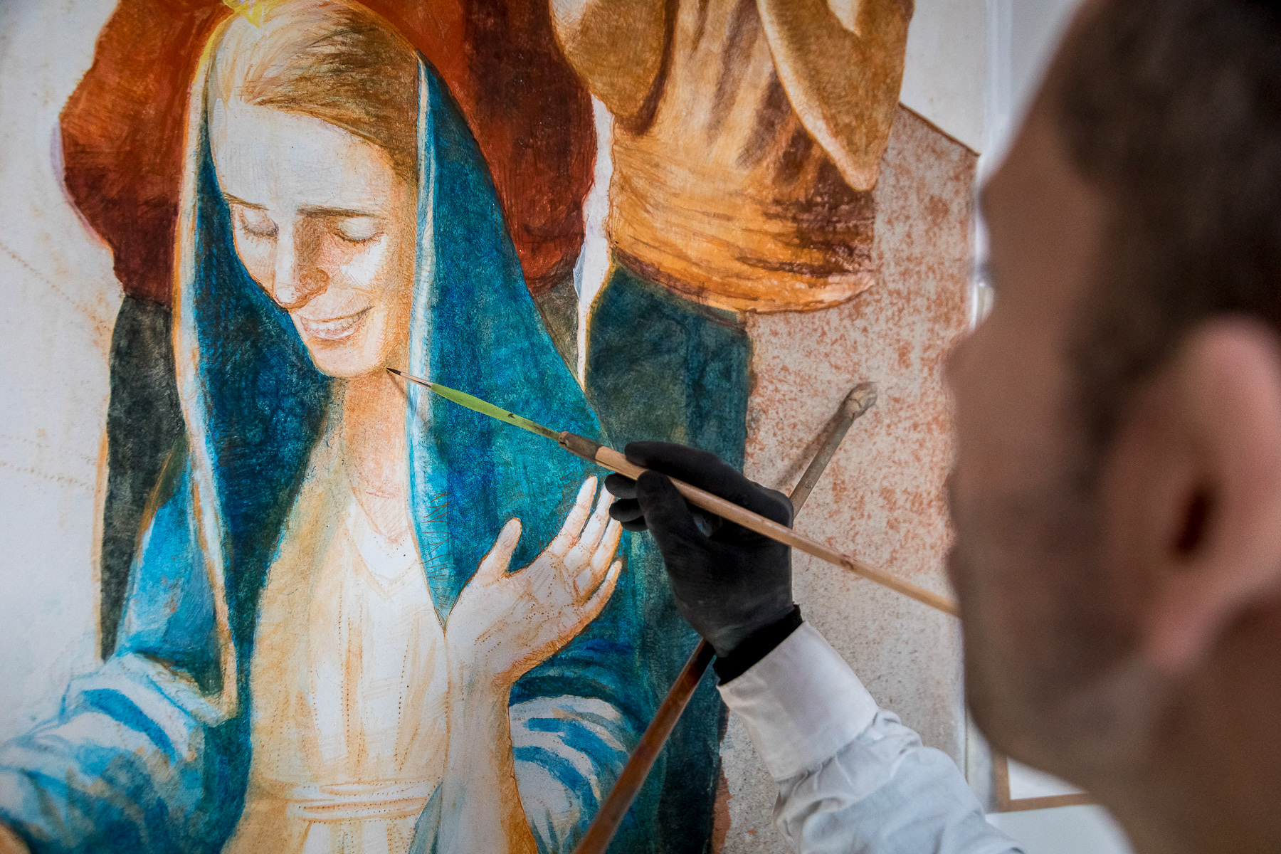Reportage photo réalisé sur plusieurs jours pour suivre quelques étapes de la réalisation d'une fresque monumentale à la chaux,dans une église lyonnaise, par un artiste maitrisant cette technique rare et spécifique - Lyon, France