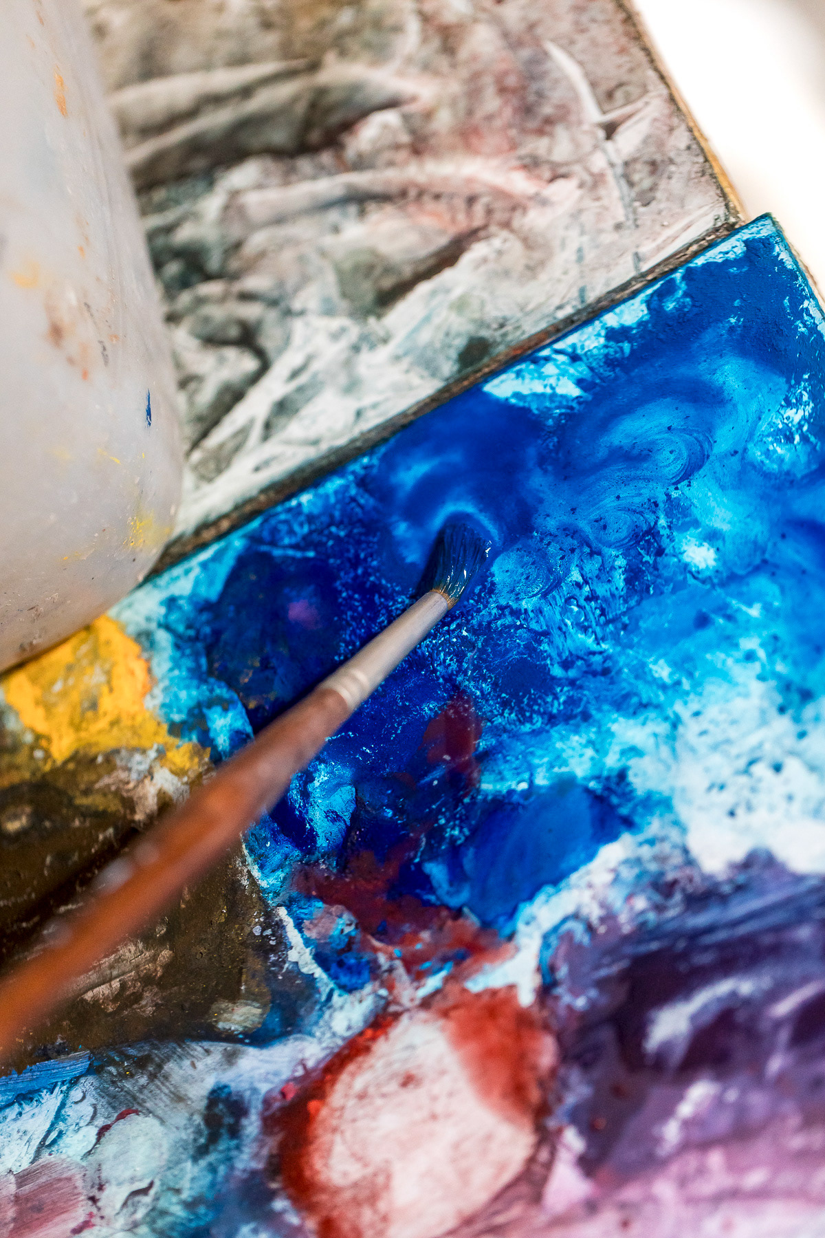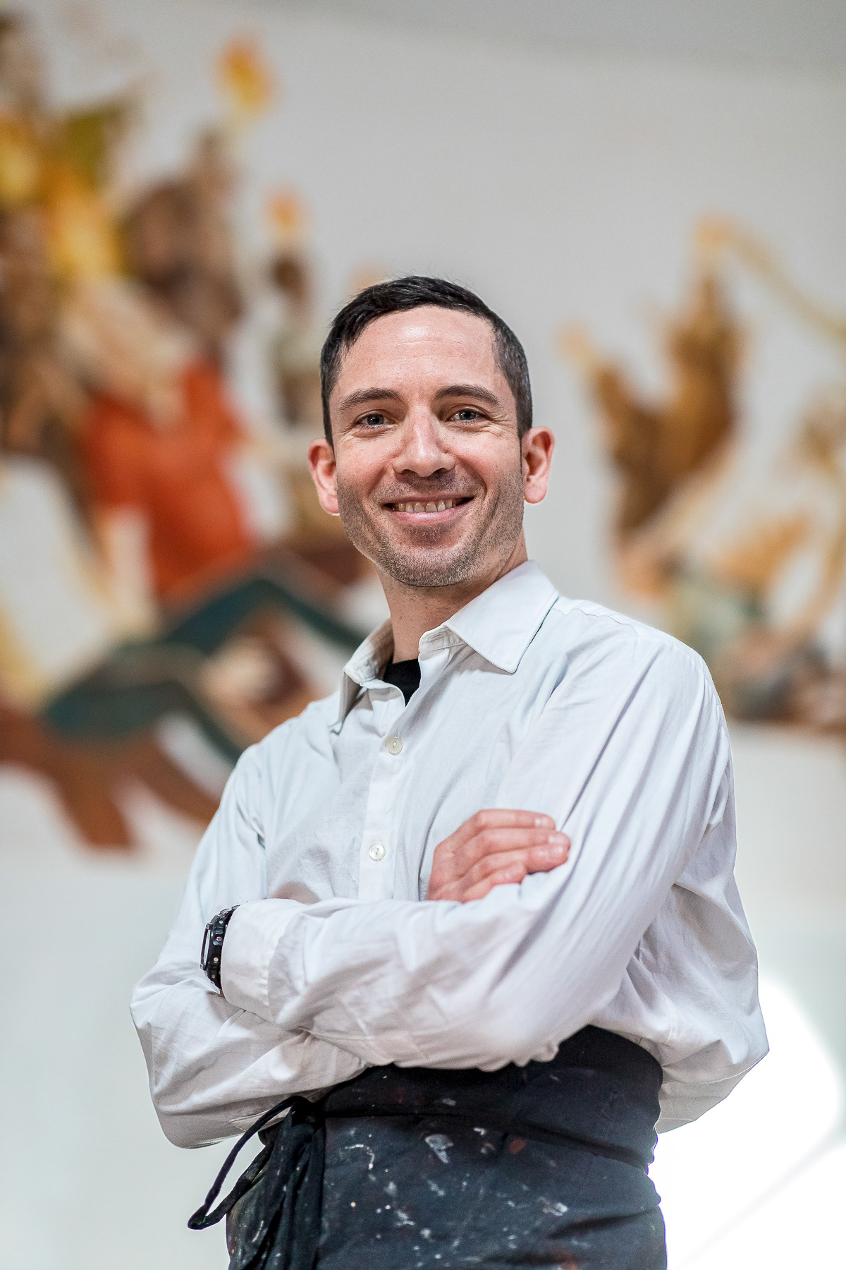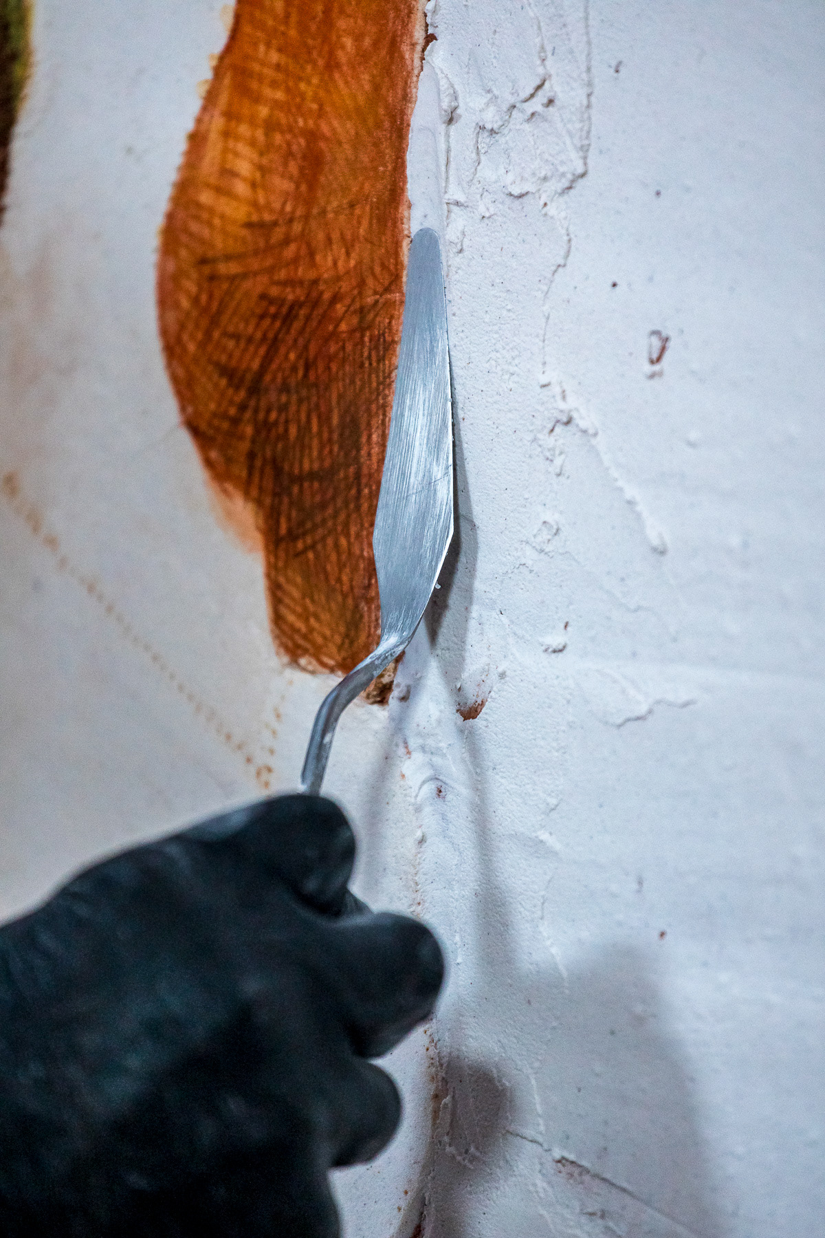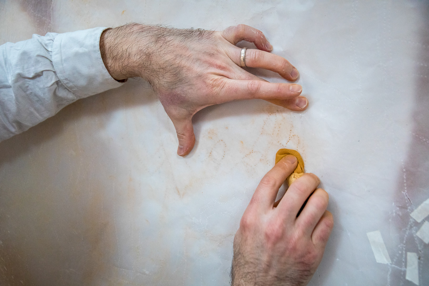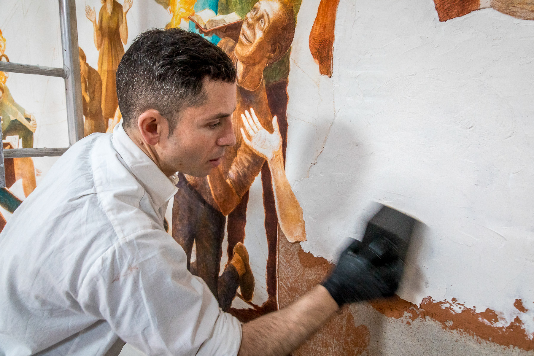 Reportage photo réalisé sur plusieurs jours pour suivre quelques étapes de la réalisation d'une fresque monumentale à la chaux,dans une église lyonnaise, par un artiste maitrisant cette technique rare et spécifique - Lyon, France