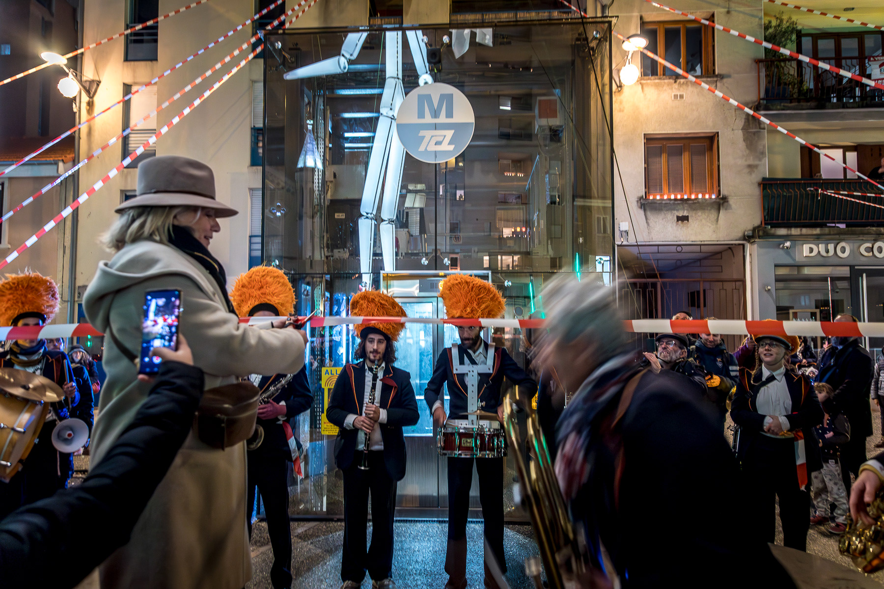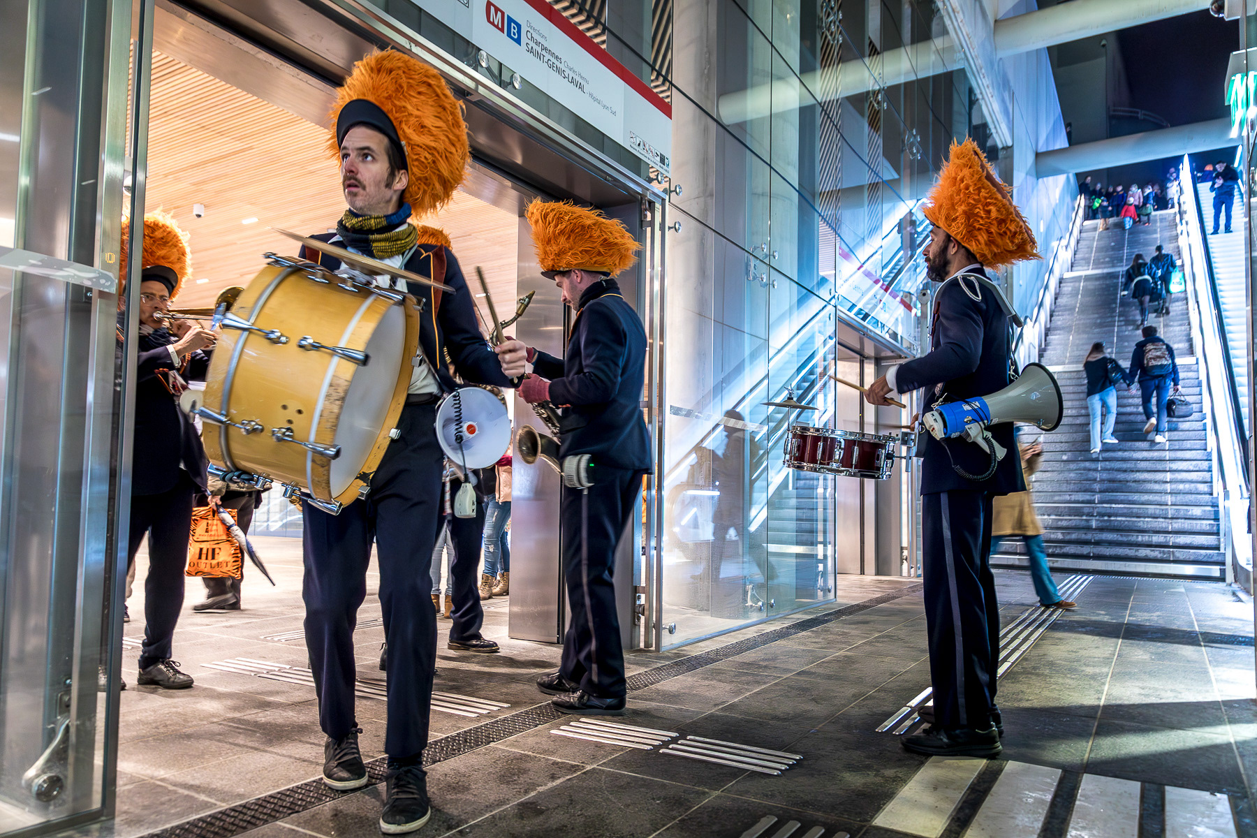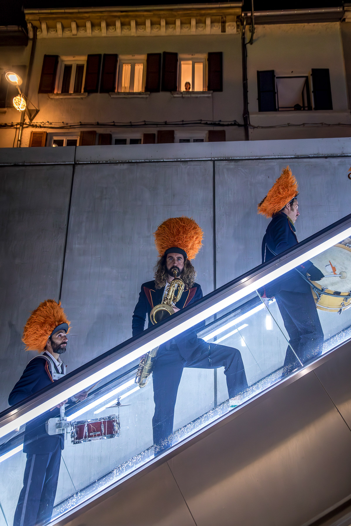 Suivi photographique de la répétition d'une fanfare amateur à travers la ville en vue du festival Les Météores - Saint-Genis-Laval, Grand Lyon, France