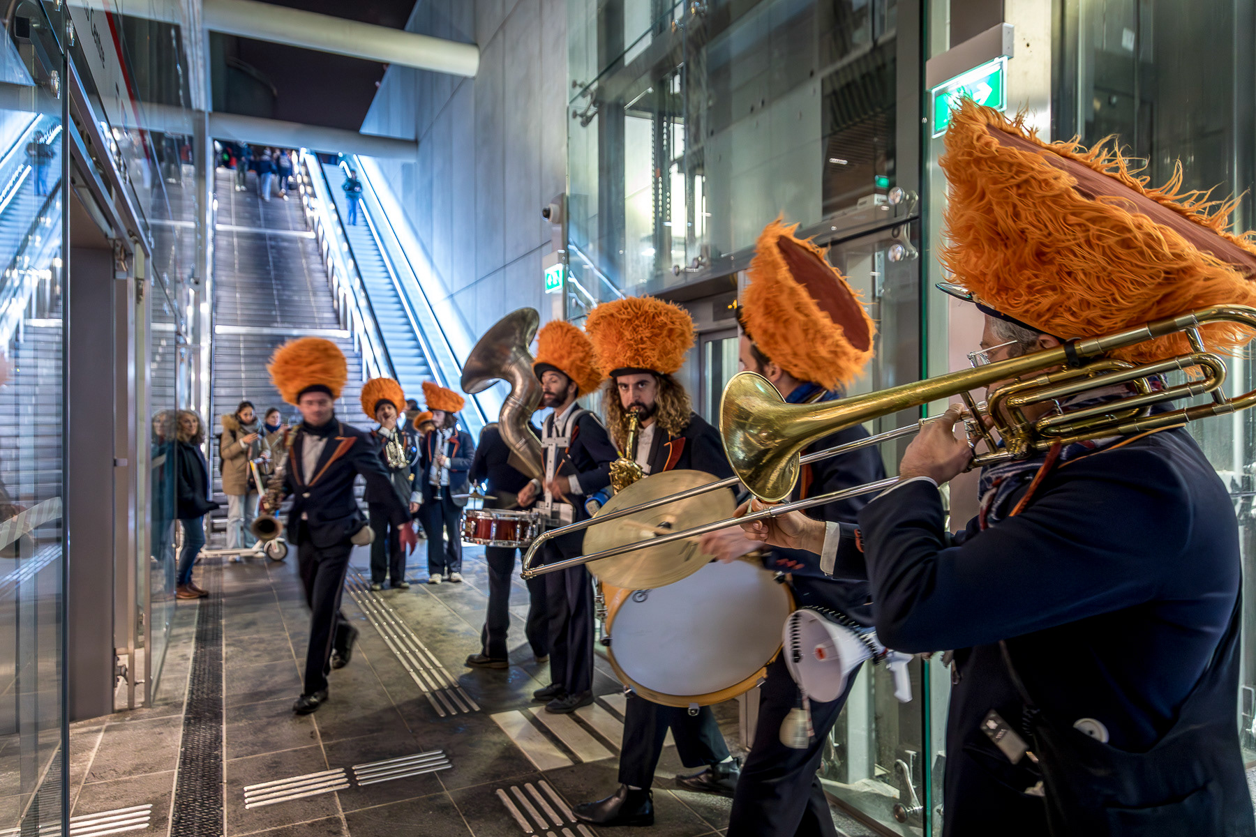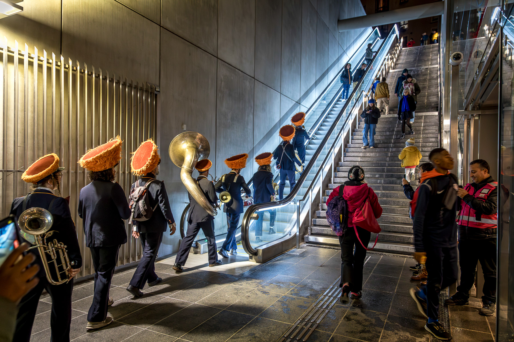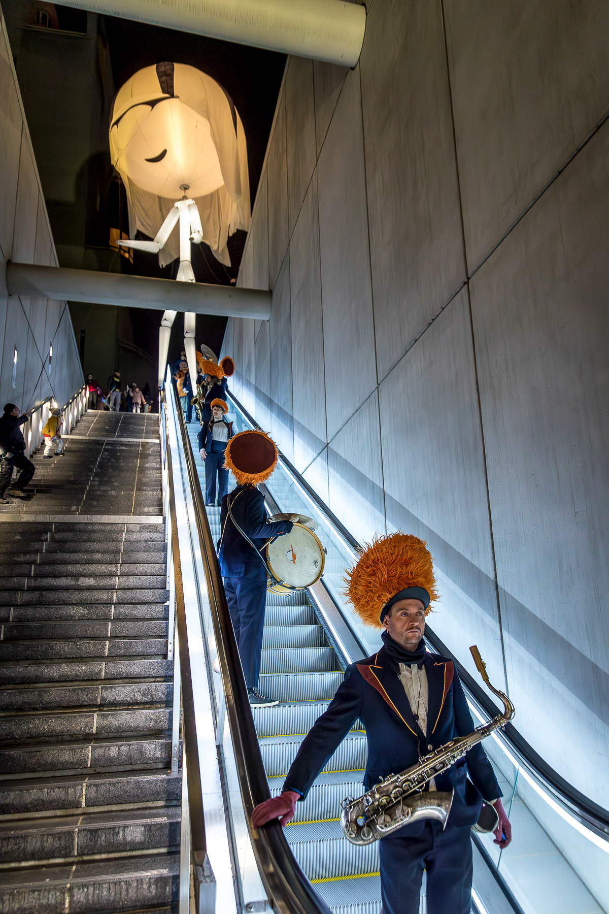 Suivi photographique de la répétition d'une fanfare amateur à travers la ville en vue du festival Les Météores - Saint-Genis-Laval, Grand Lyon, France
