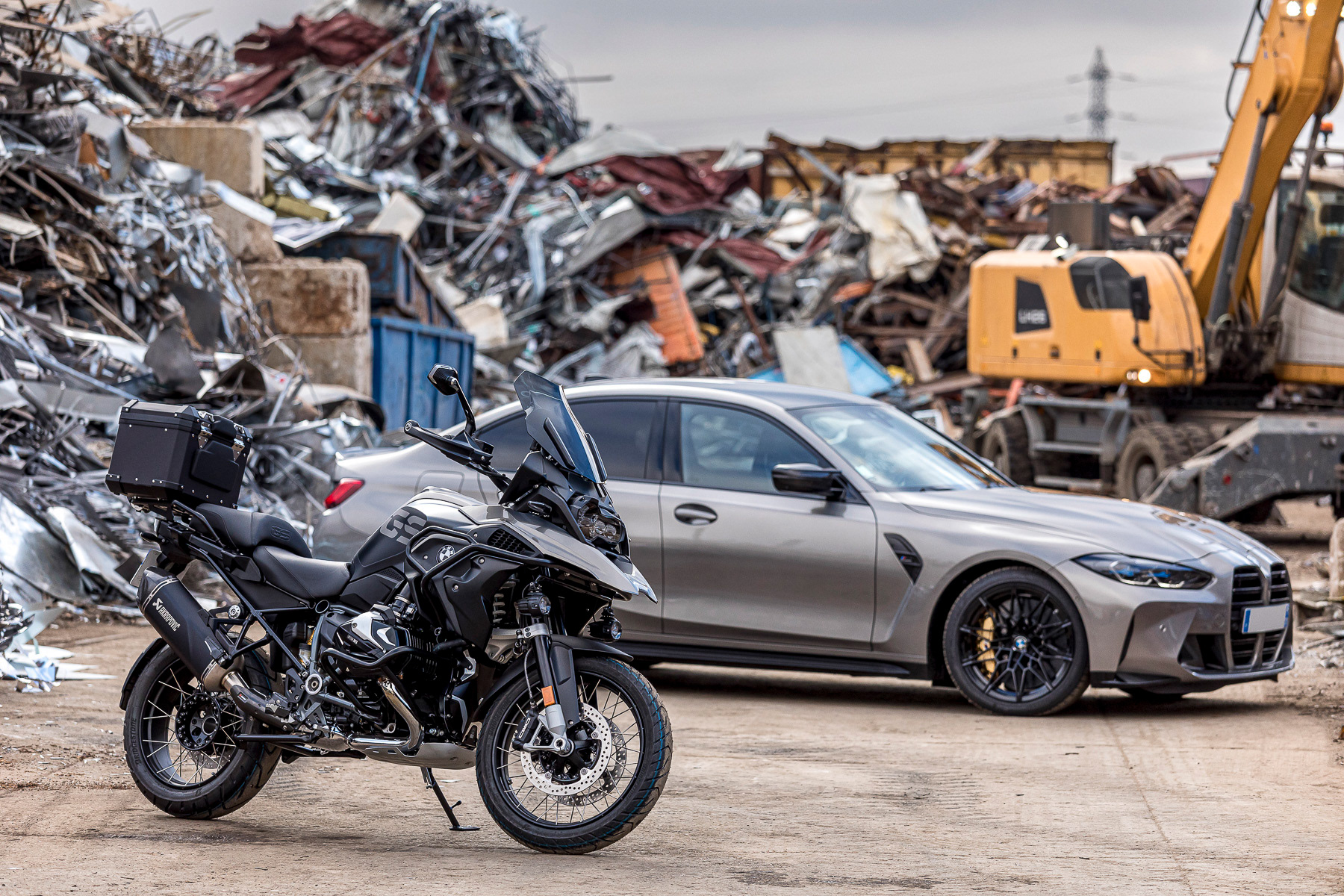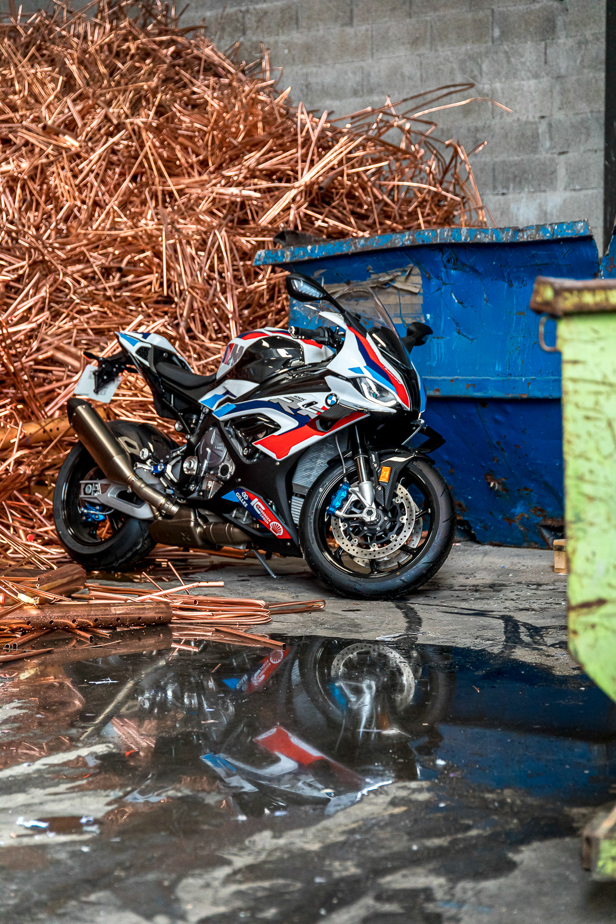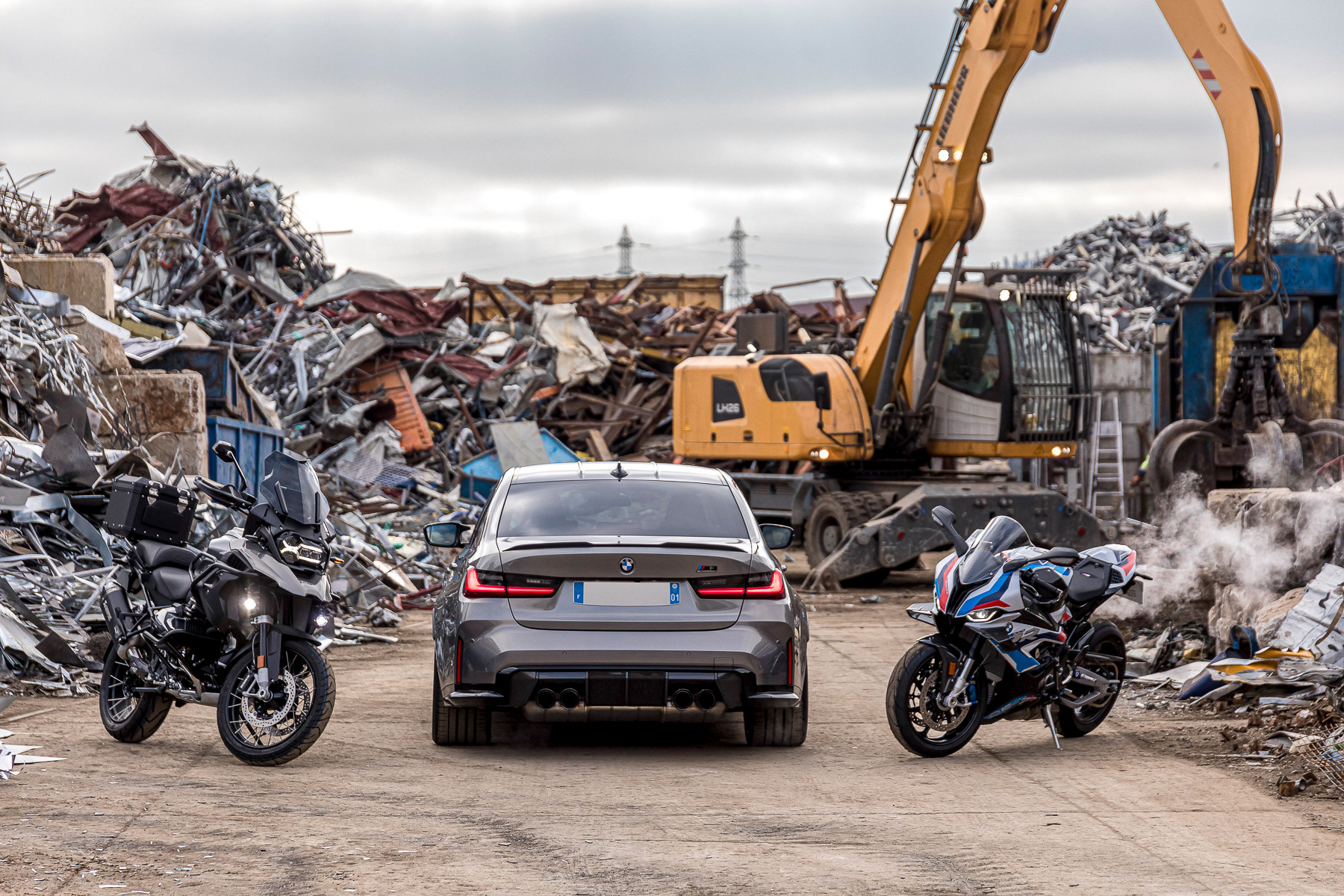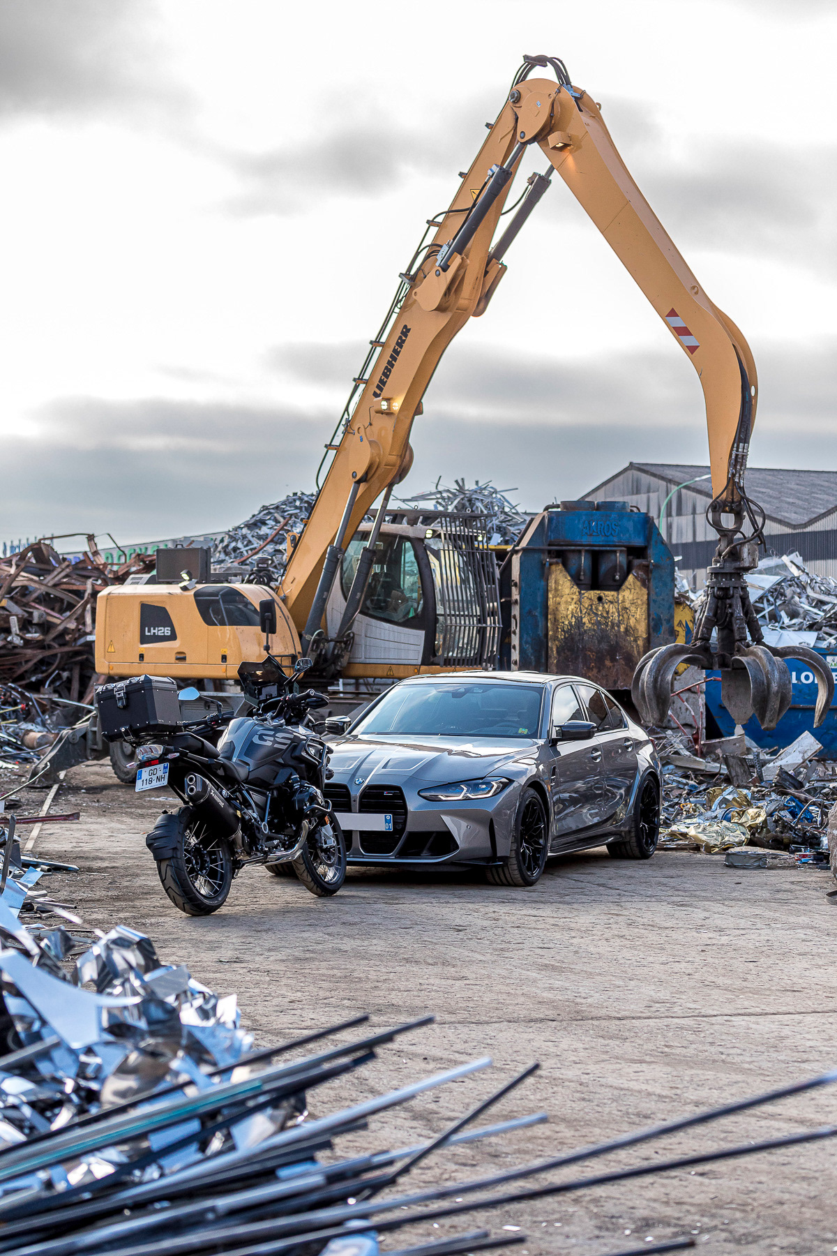 Shooting photo de deux motos et une voiture de sport BMW dans une recyclerie industrielle - Lyon, France