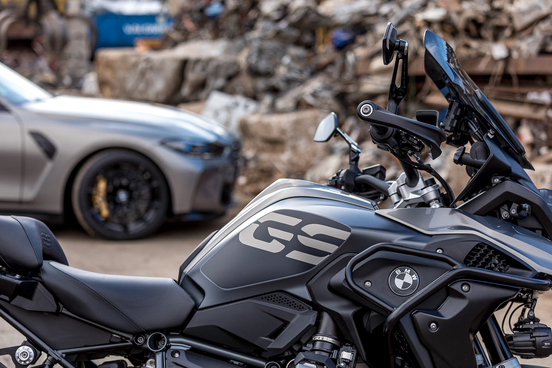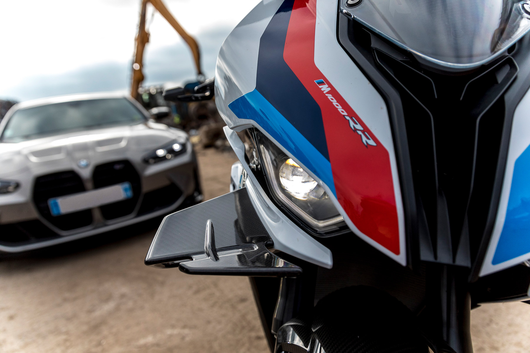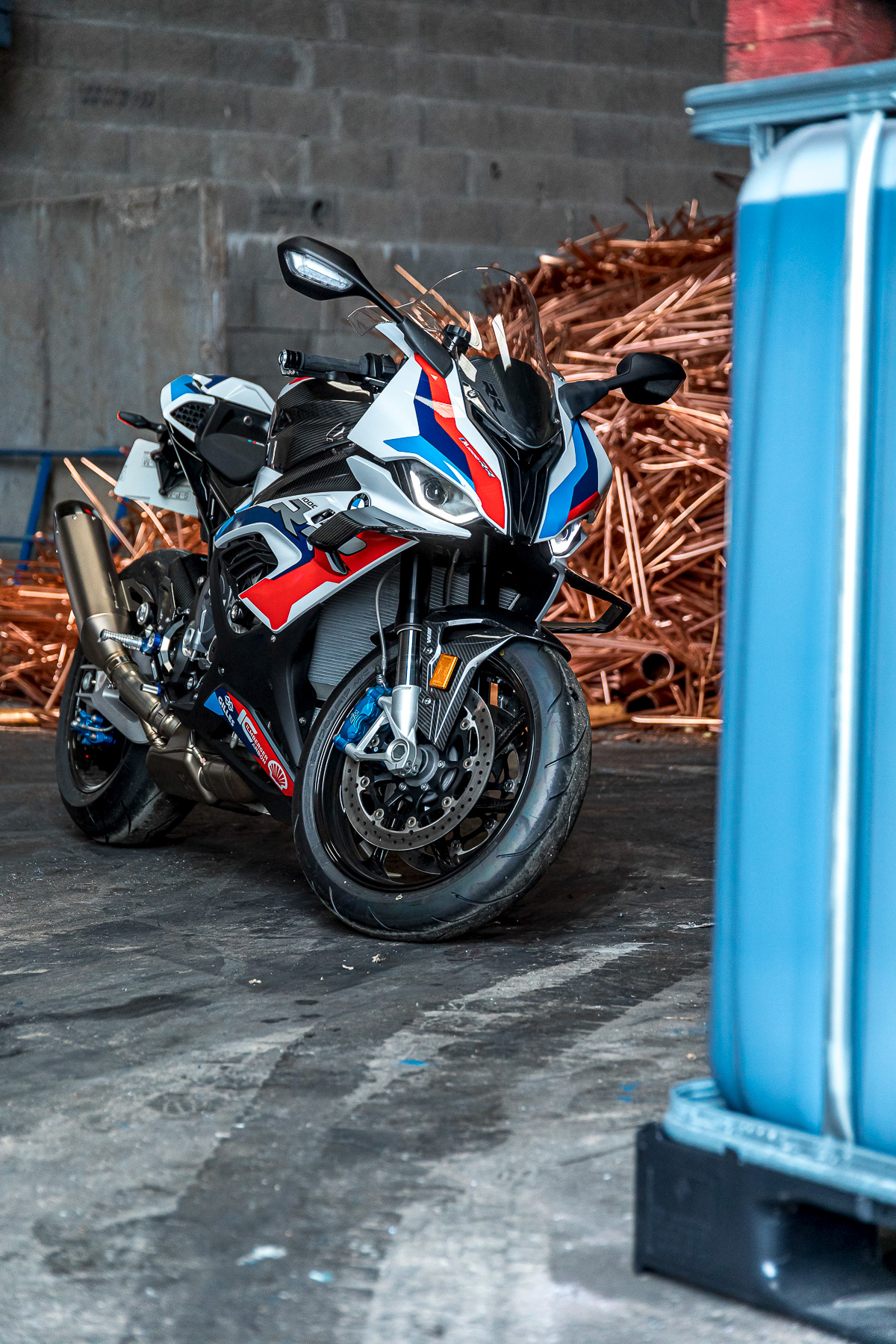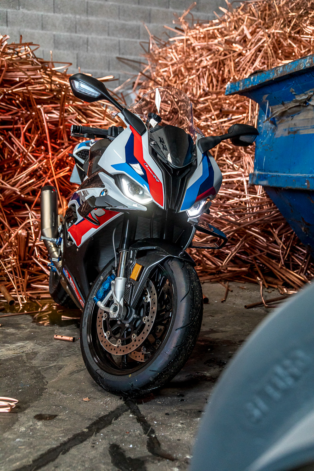 Shooting photo de deux motos et une voiture de sport BMW dans une recyclerie industrielle - Lyon, France