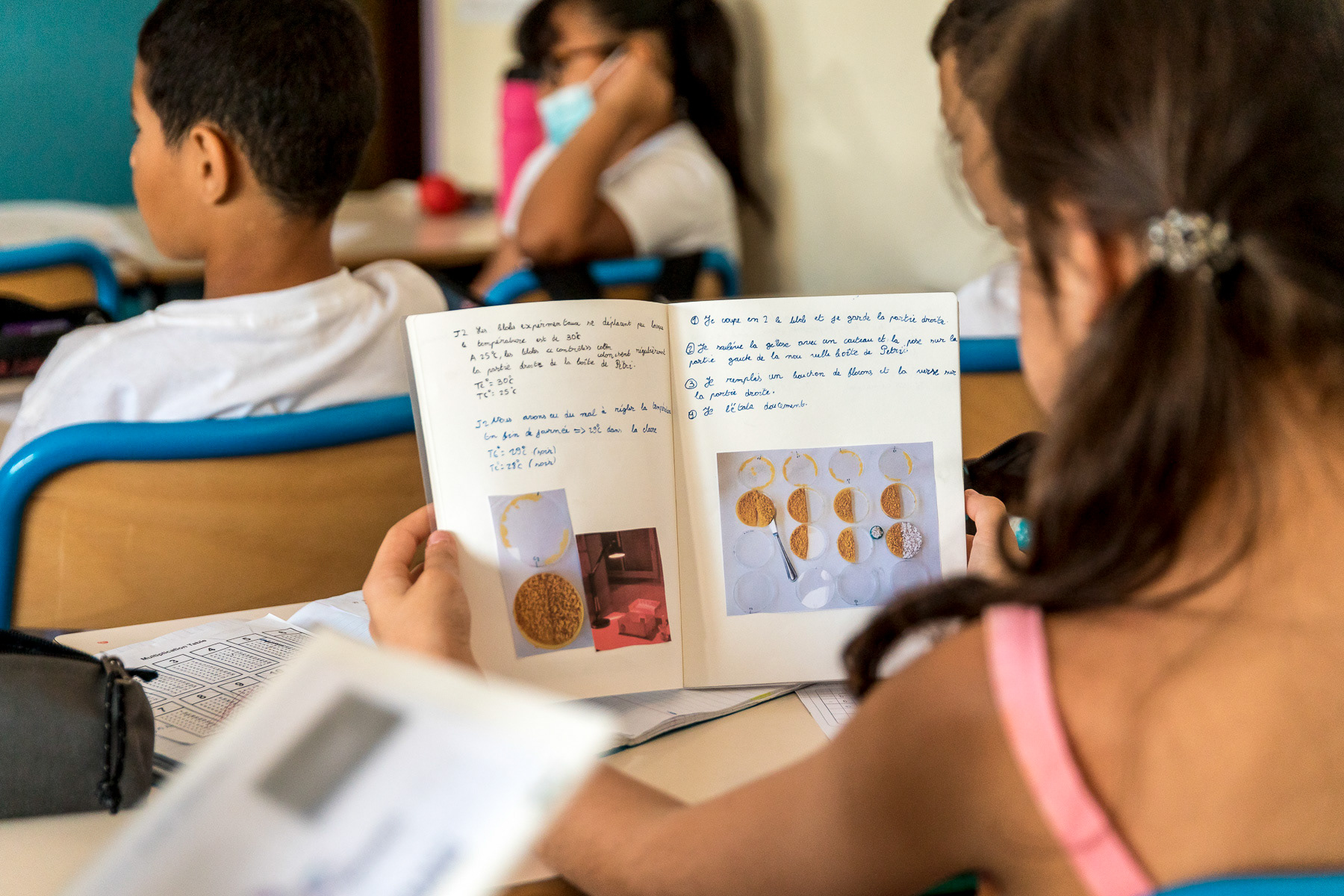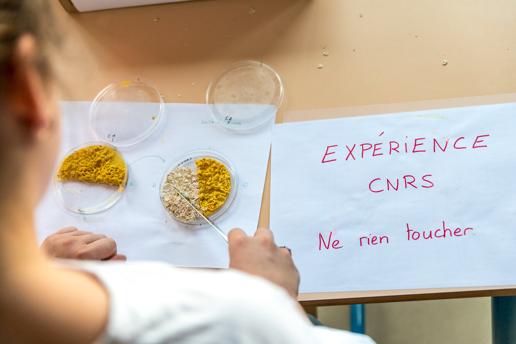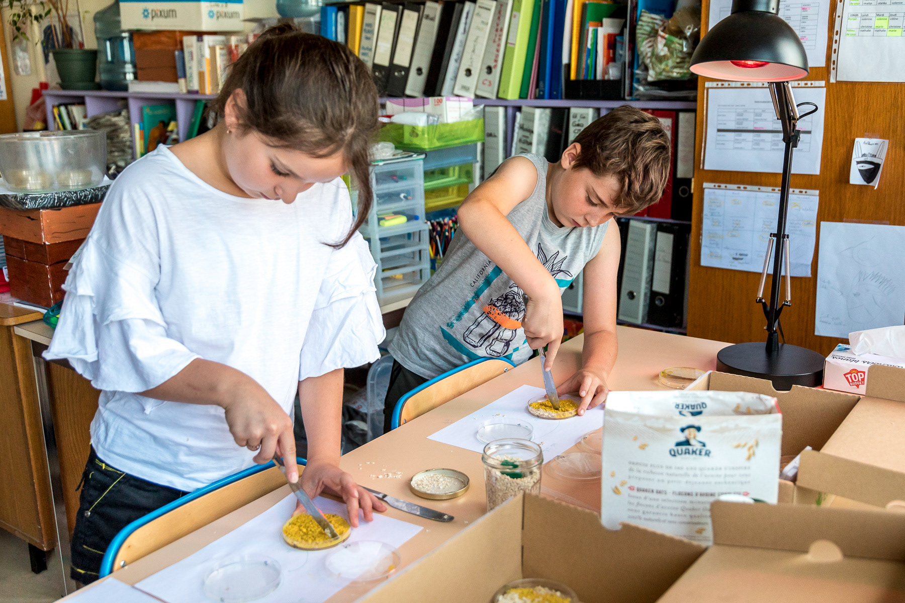 Reportage photo d'activités dans une classe de CP sur le blob, en collaboration avec le CNRS - Saint-Genis-Laval, Grand Lyon, France