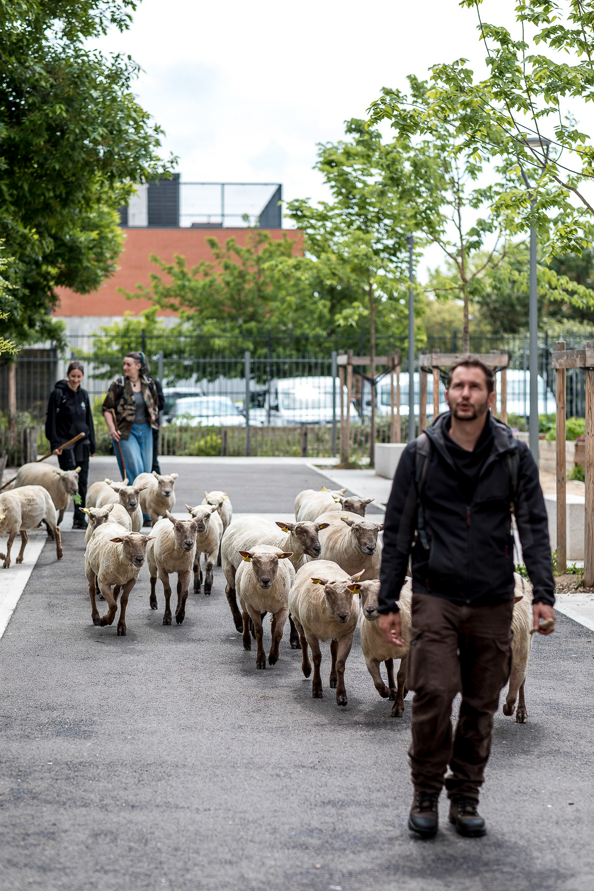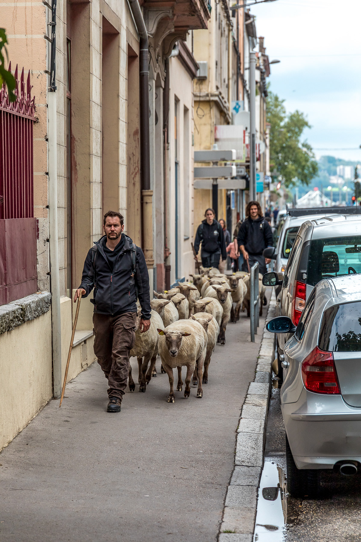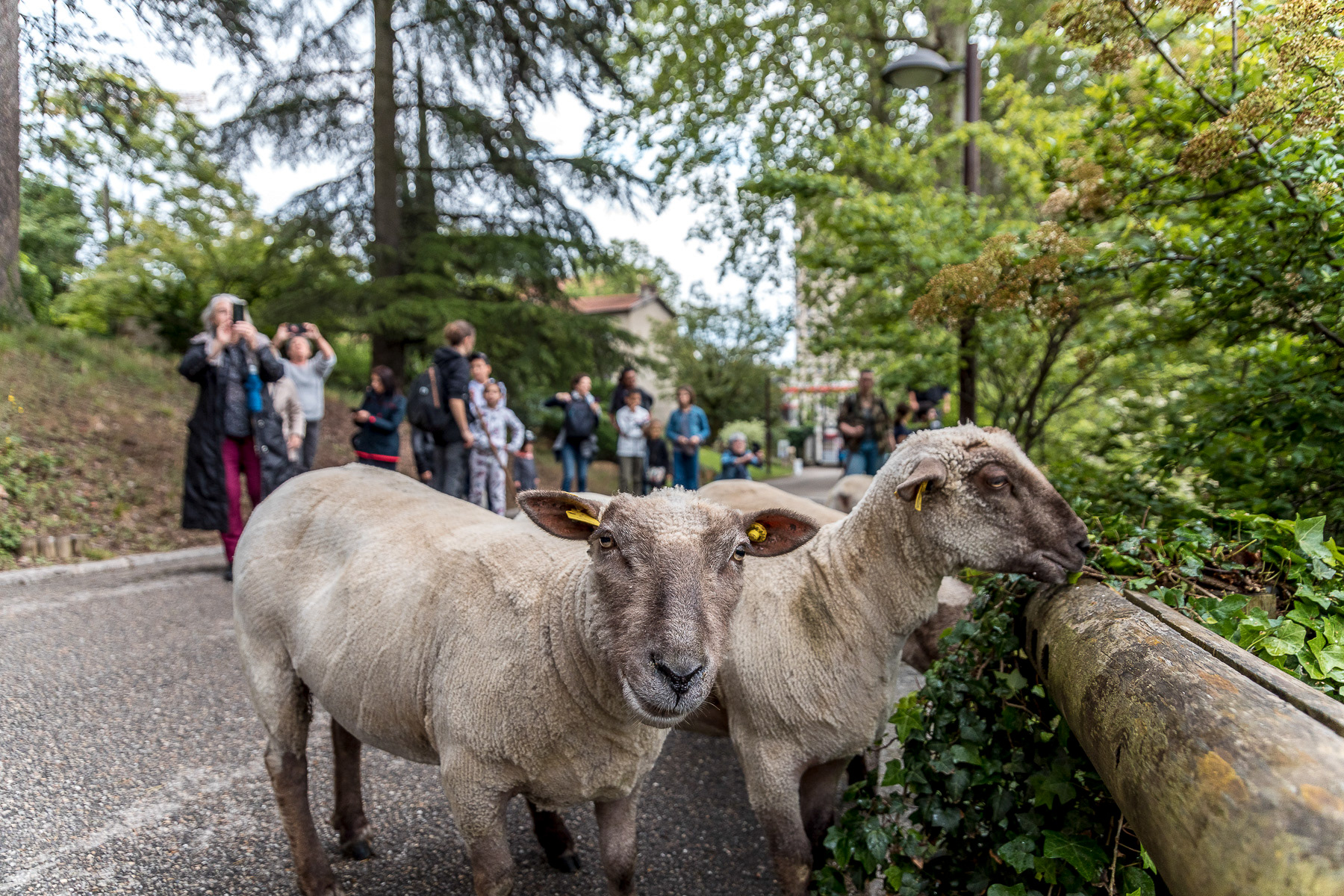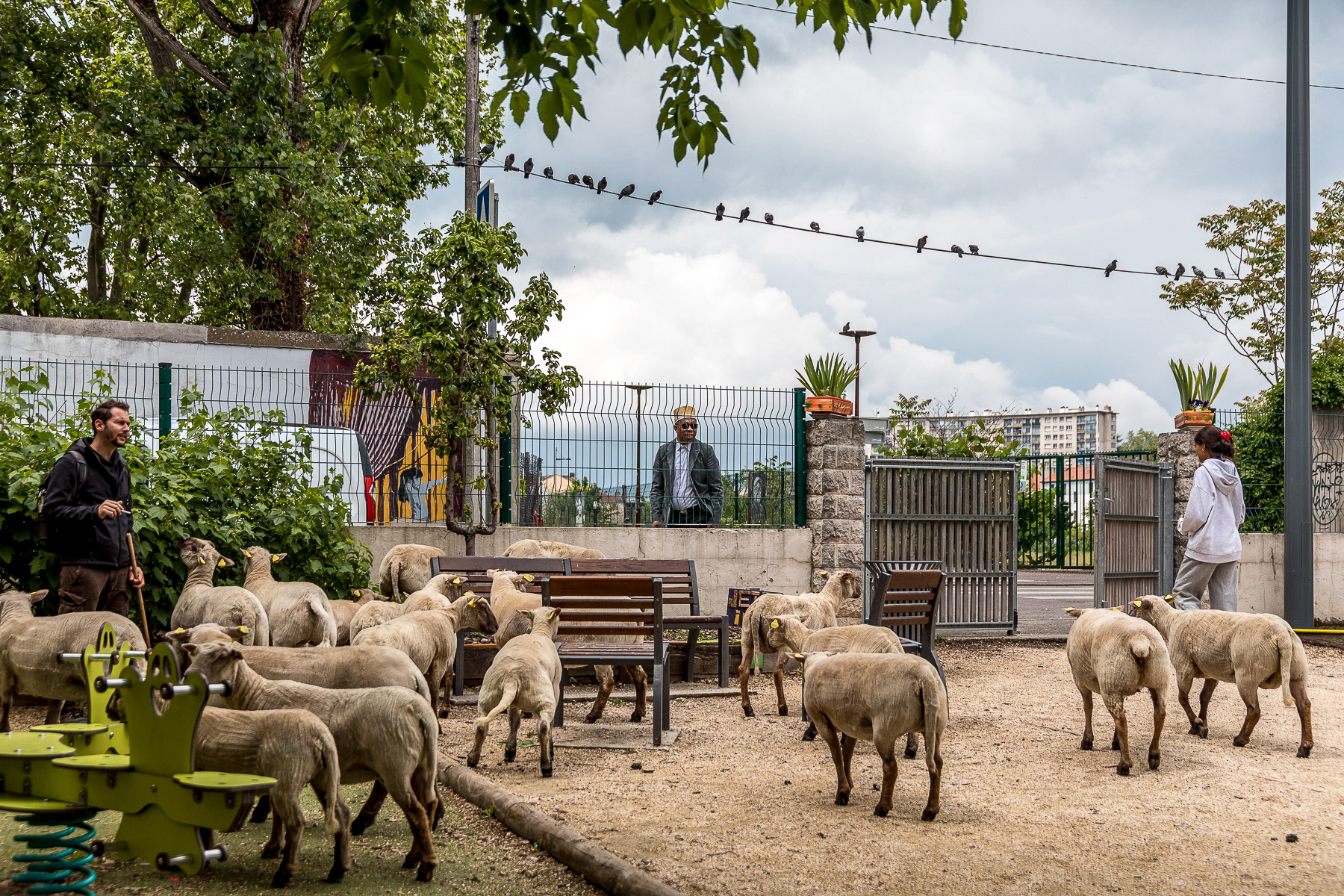 Reportage photo sur une promenade pastorale d'un troupeau de mouton en plein cœur d'une ville de banlieue en marge de la Fête de l'iris - Oullins, Métropole de Lyon, France