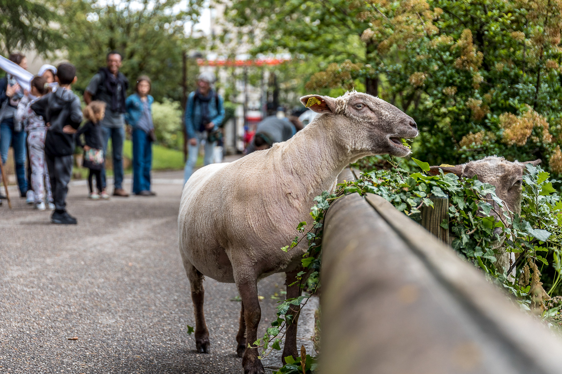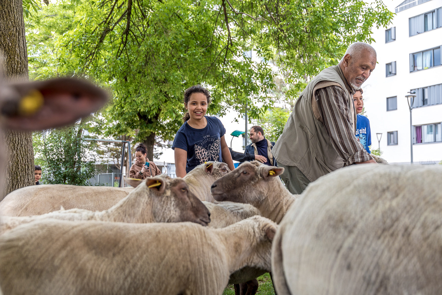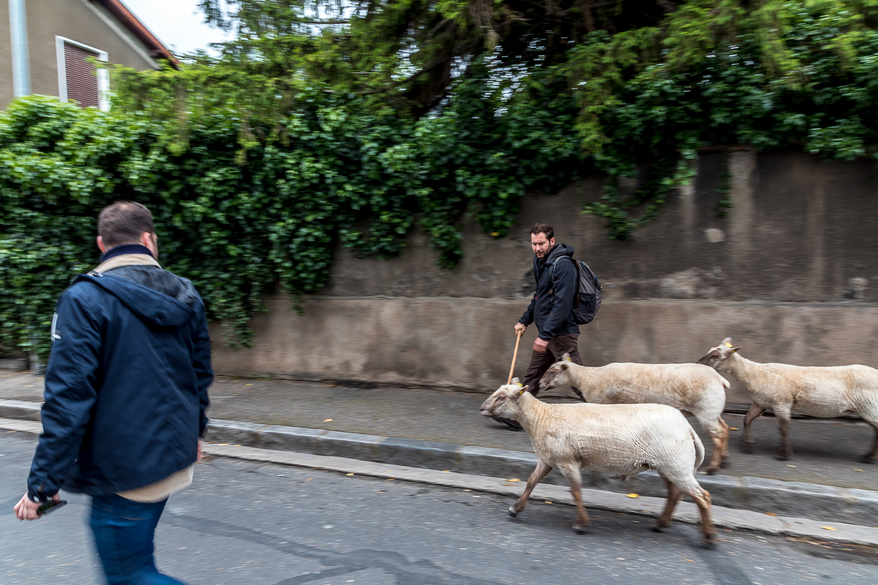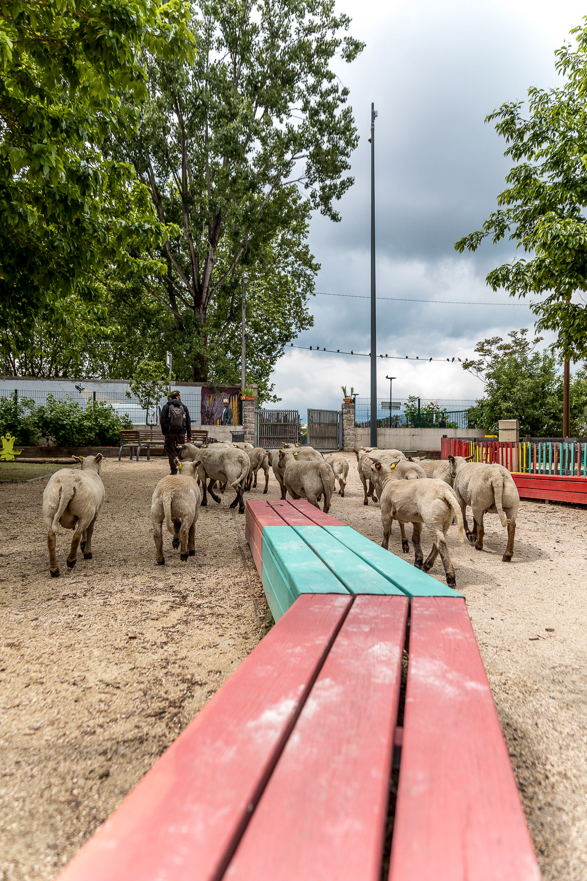 Reportage photo sur une promenade pastorale d'un troupeau de mouton en plein cœur d'une ville de banlieue en marge de la Fête de l'iris - Oullins, Métropole de Lyon, France