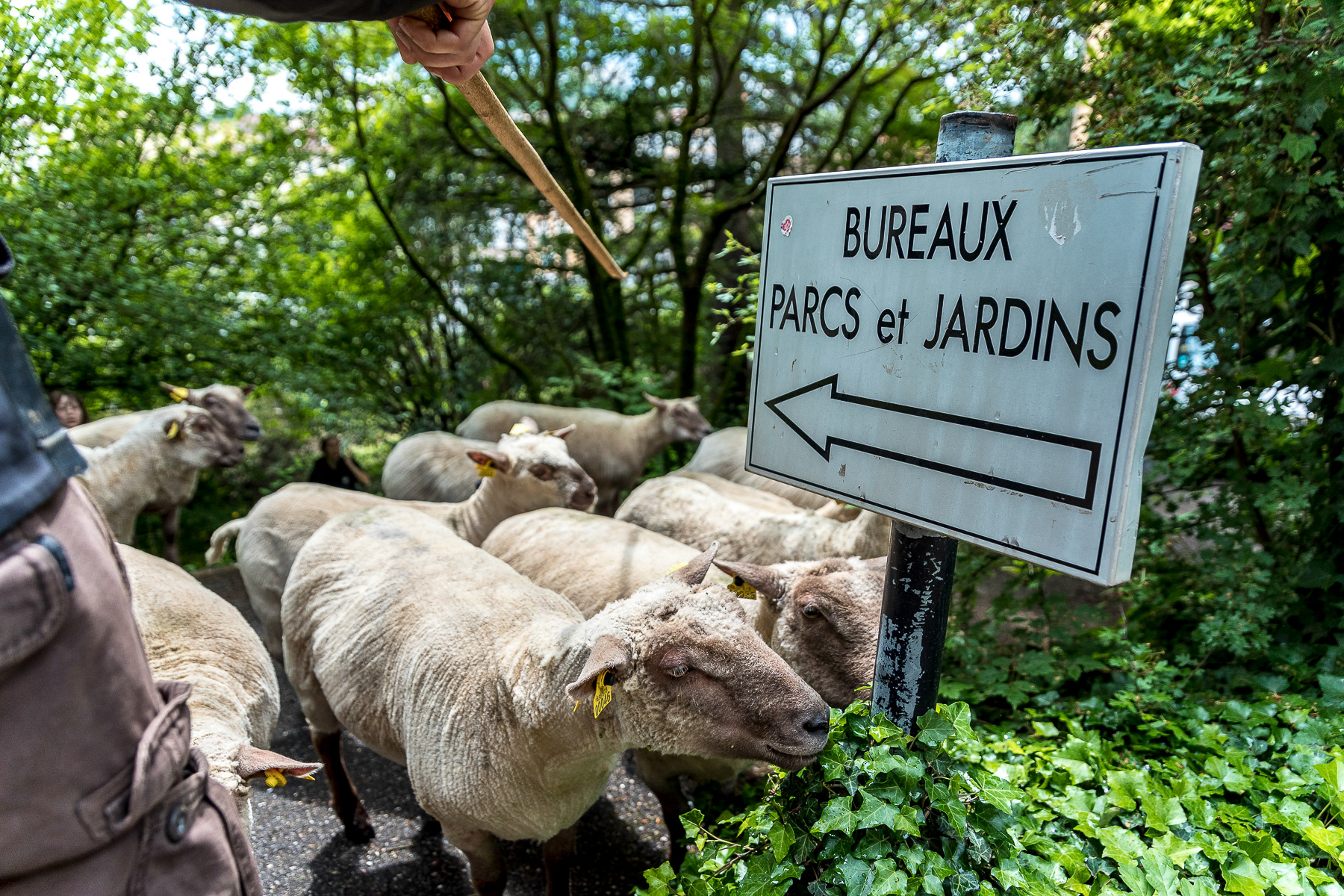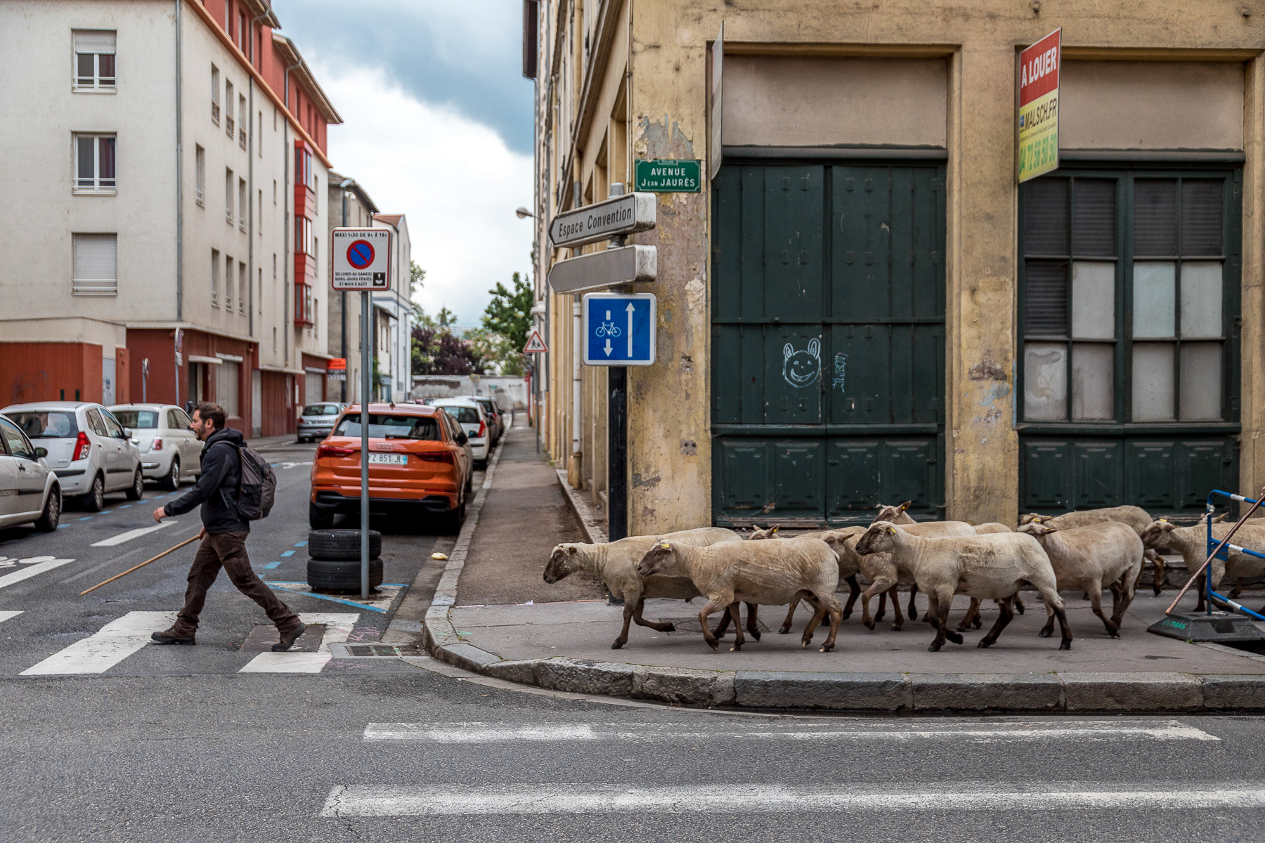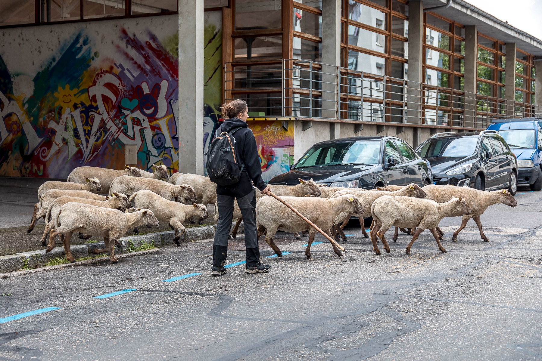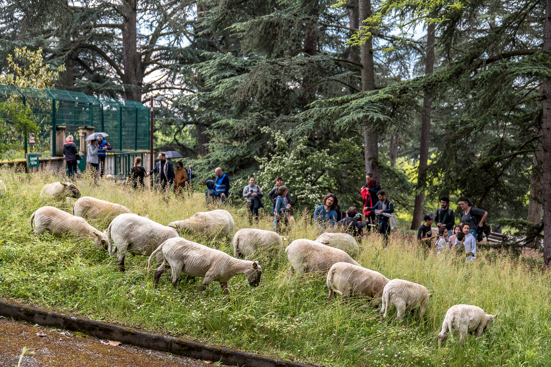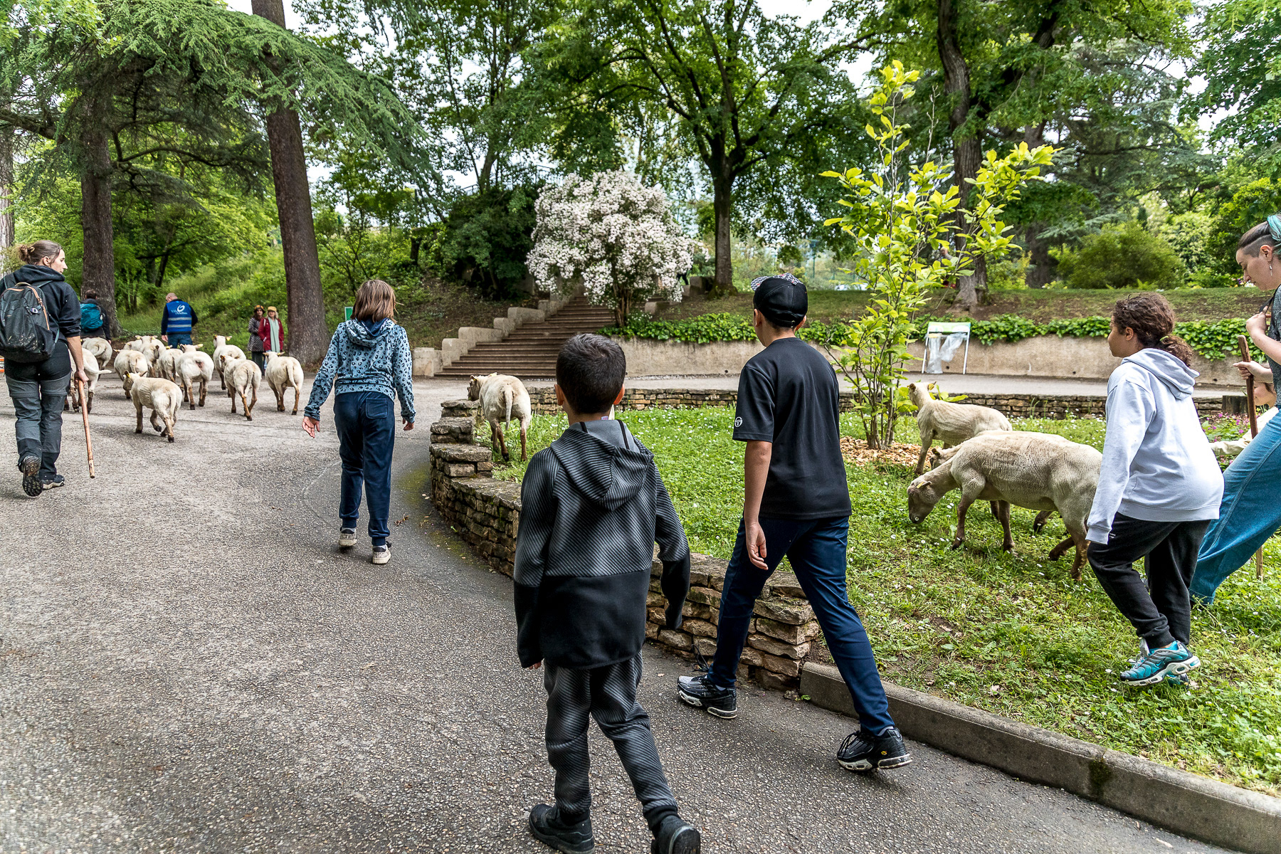 Reportage photo sur une promenade pastorale d'un troupeau de mouton en plein cœur d'une ville de banlieue en marge de la Fête de l'iris - Oullins, Métropole de Lyon, France