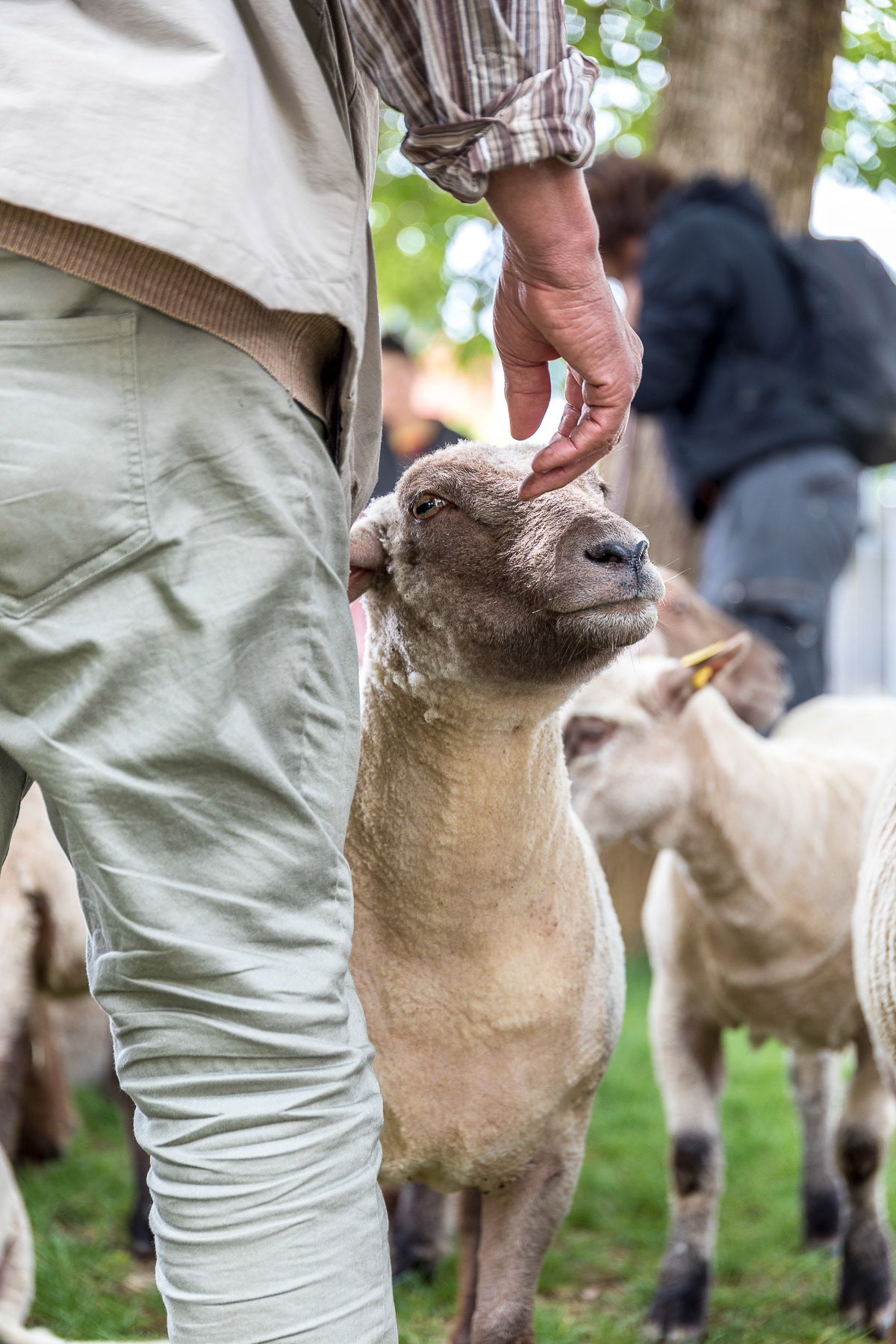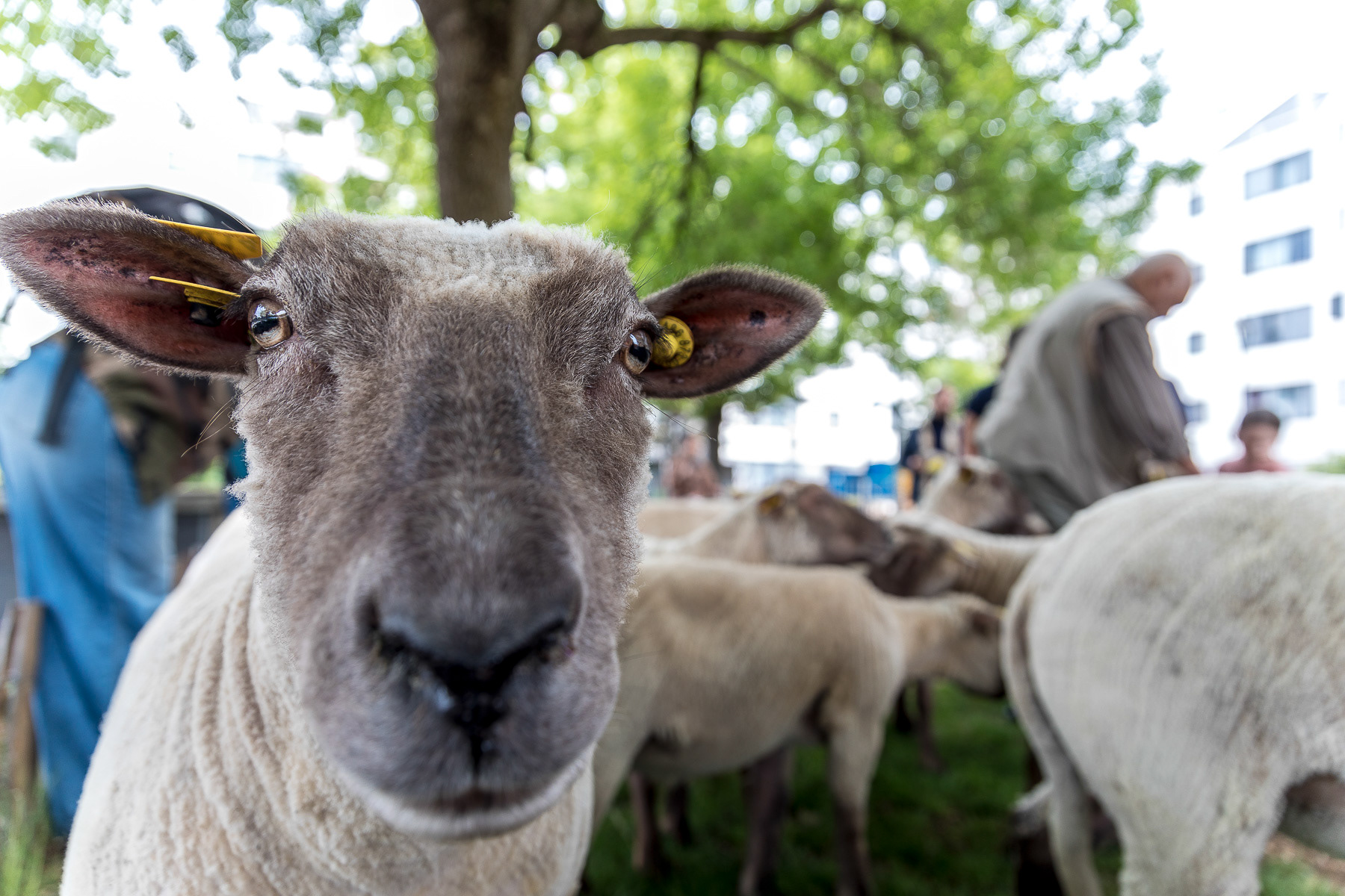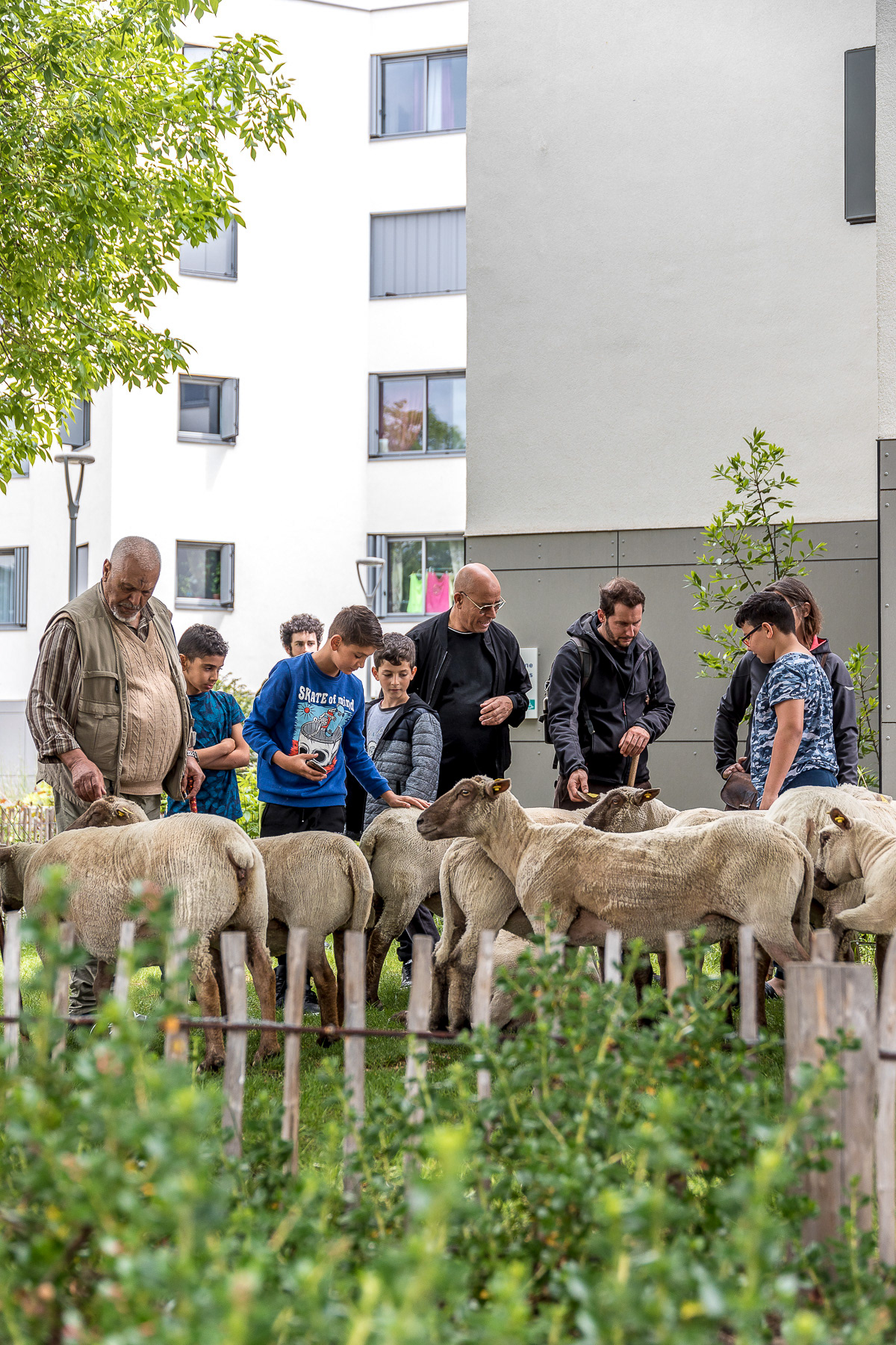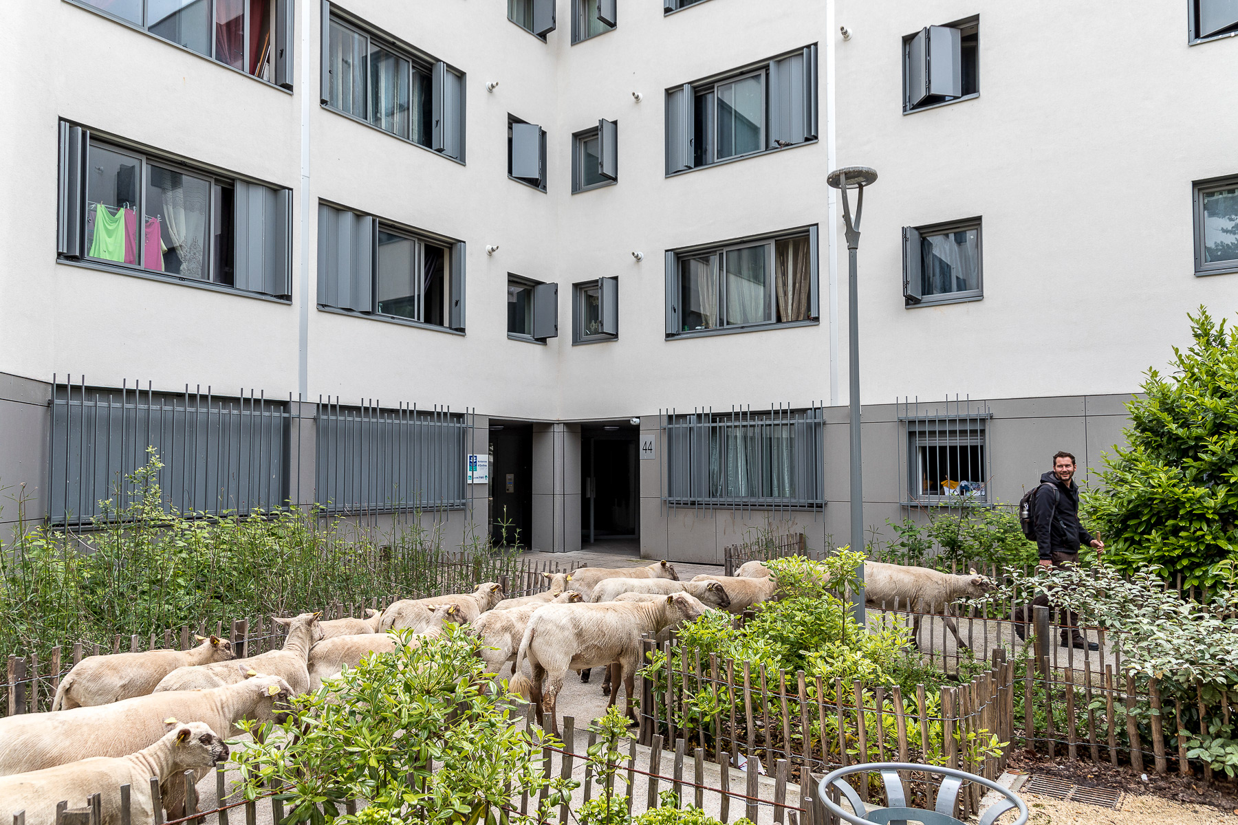 Reportage photo sur une promenade pastorale d'un troupeau de mouton en plein cœur d'une ville de banlieue en marge de la Fête de l'iris - Oullins, Métropole de Lyon, France