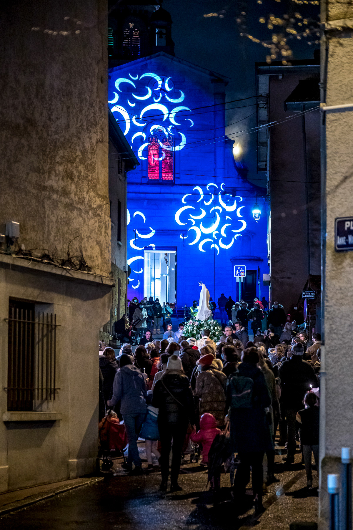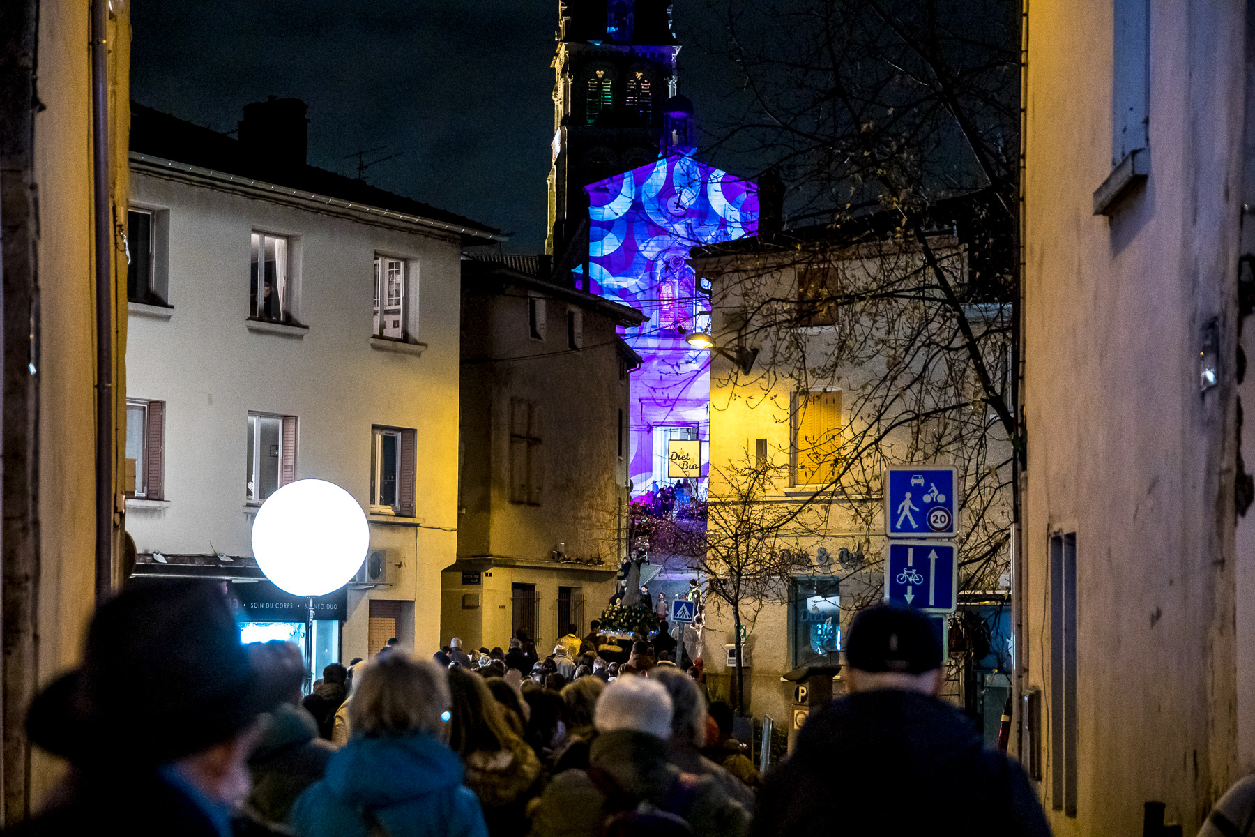 Reportage photo événementiel pour le spectacle du 8 décembren fête des lumières, créé par Gilbert Coudène pour la municipalité - Ville d'Oullins, Grand Lyon, France