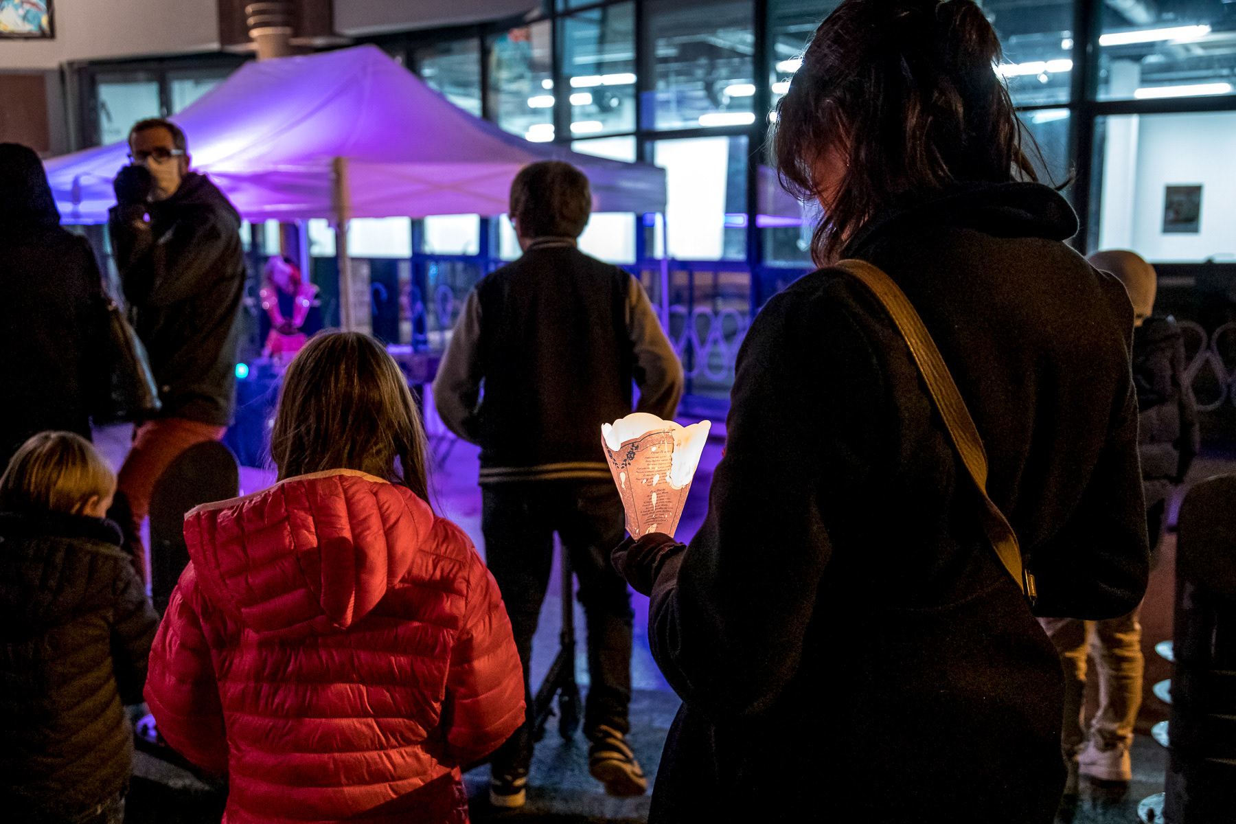 Reportage photo à l'occasion de l'événement "La Nuit est Belle" organisée par la Métropole de Lyon. Lecture dans l'obscurité au B612 et promenade nocturne durant l'extinction de l'éclairage urbain - Saint-Genis-Laval, Grand Lyon, France