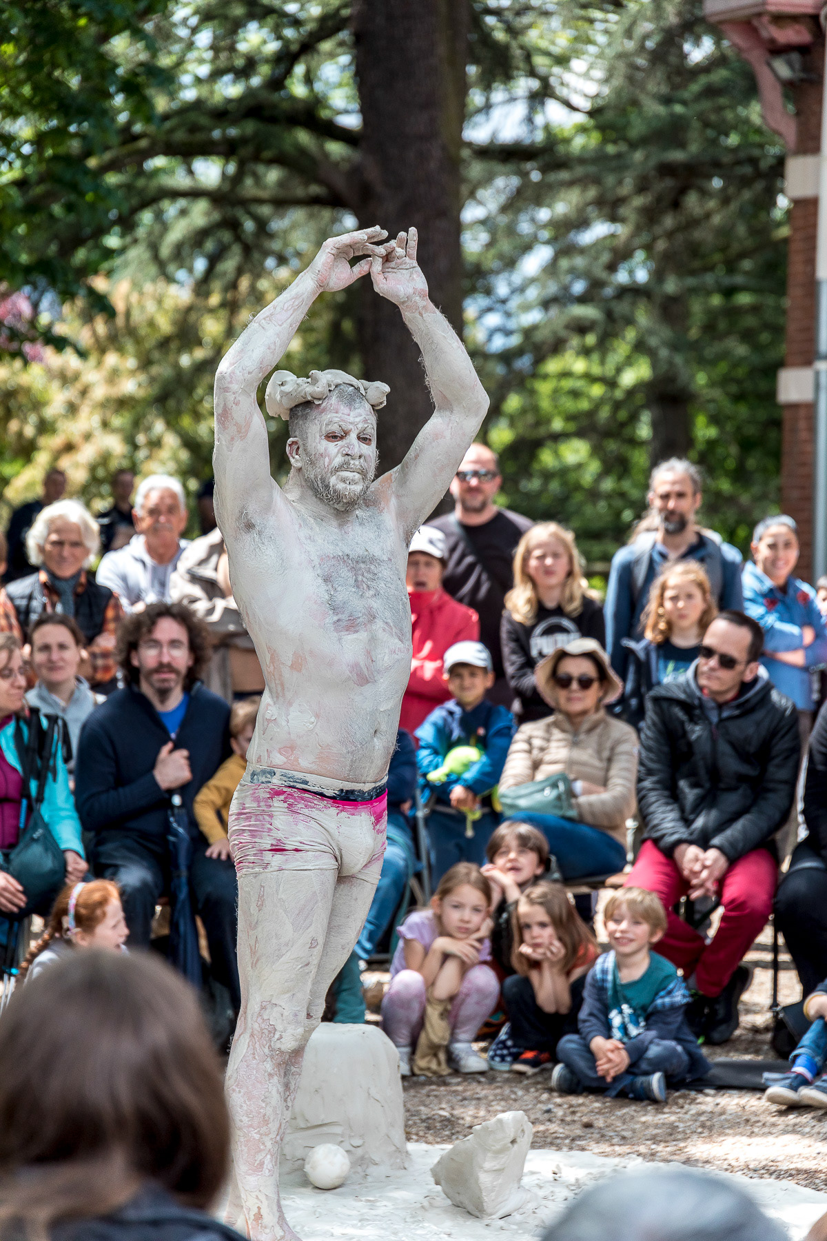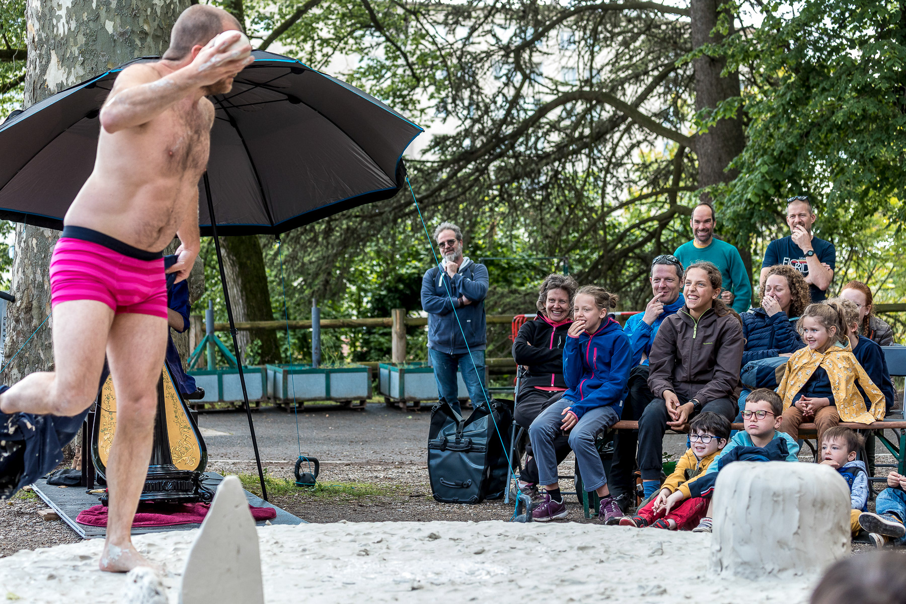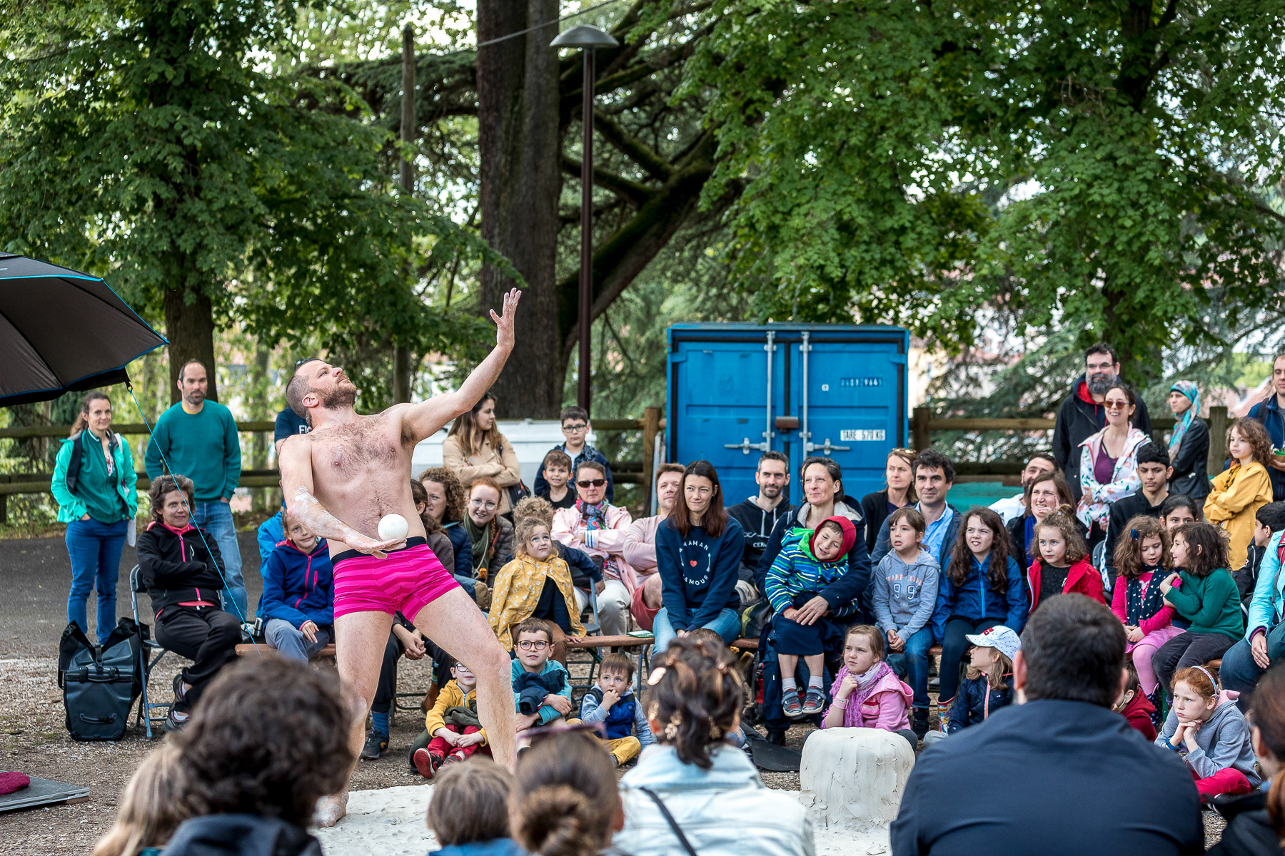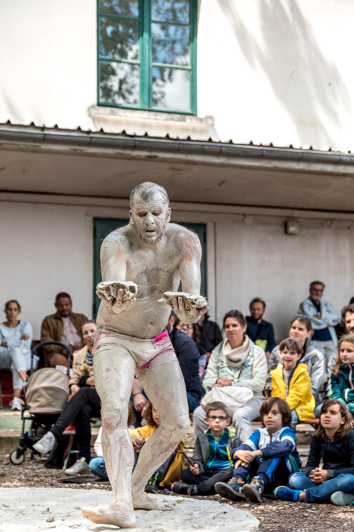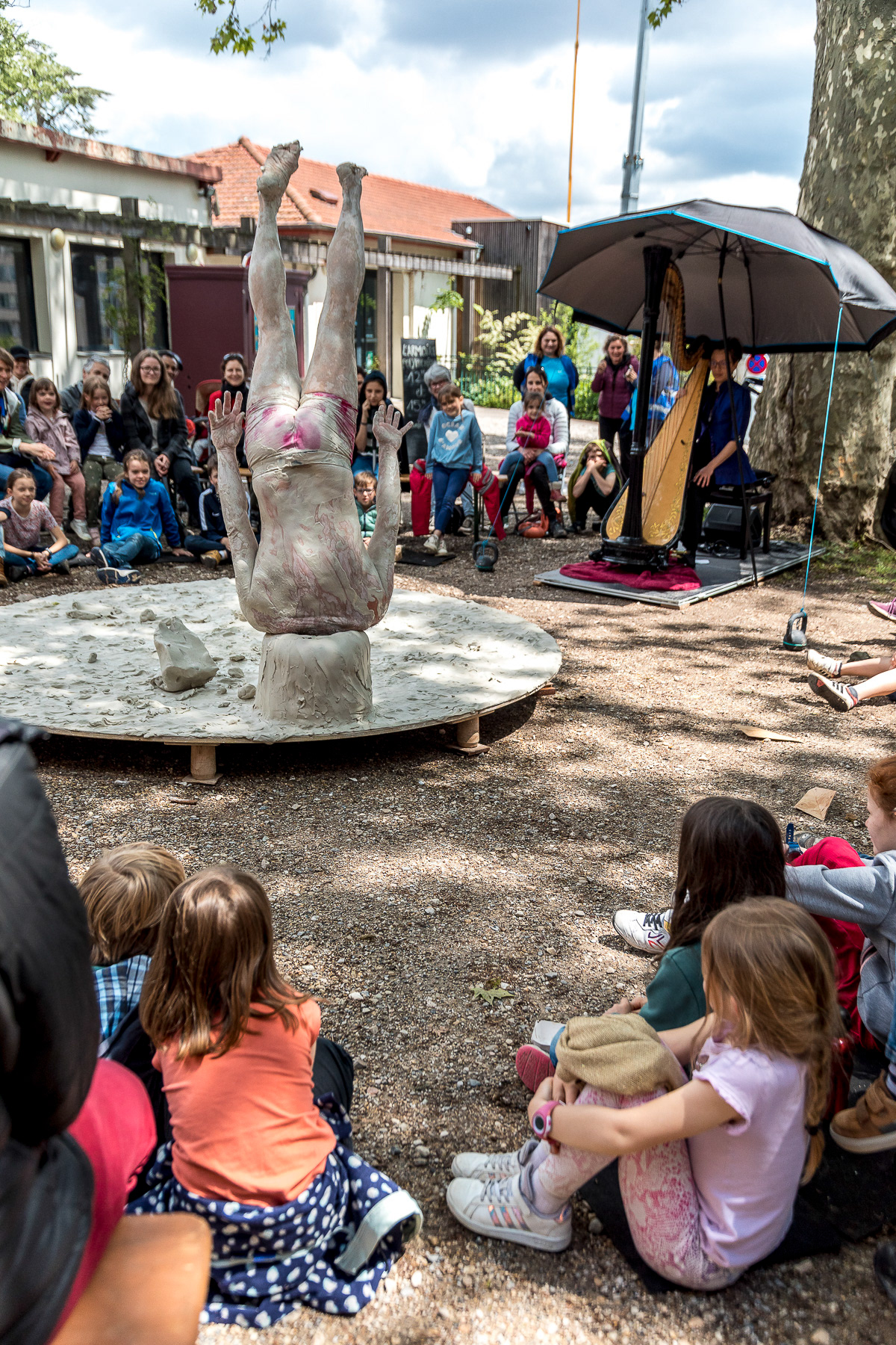 Photographie de spectacle en plein air de la performance de jonglage atypique "Gadoue" par la compagnie Le Jardin des Délices, lors de la fête de l'Iris - Oullins, Grand Lyon, France