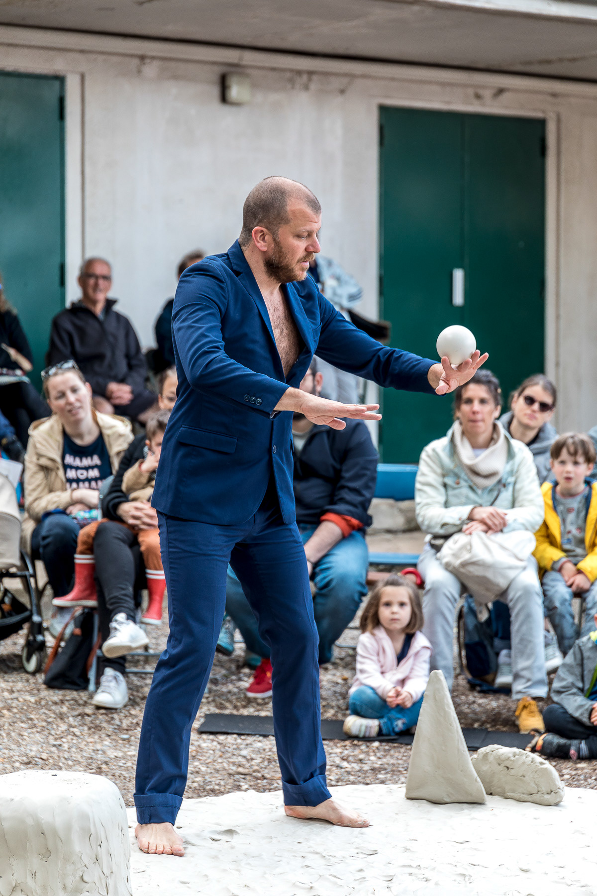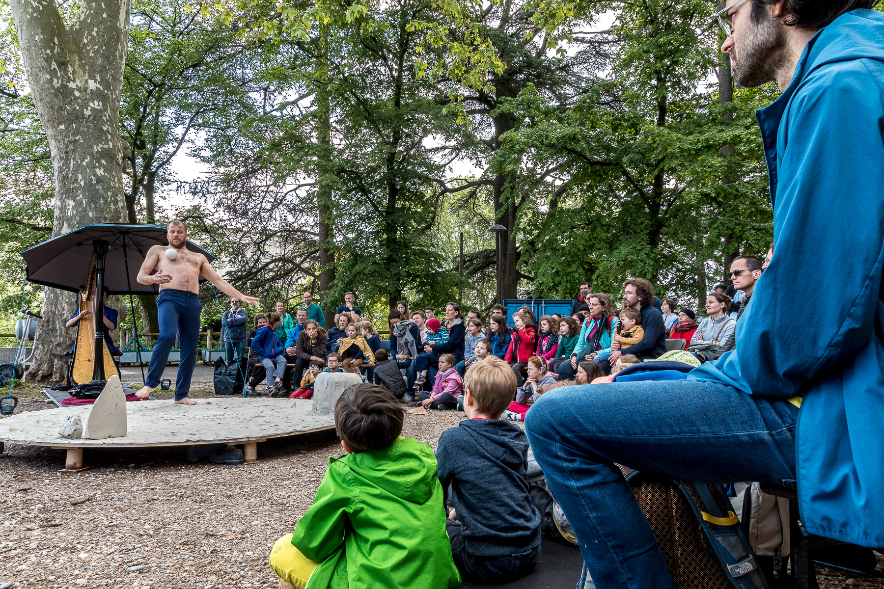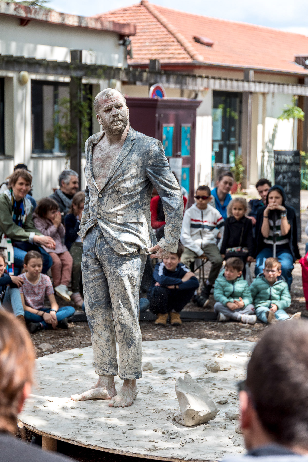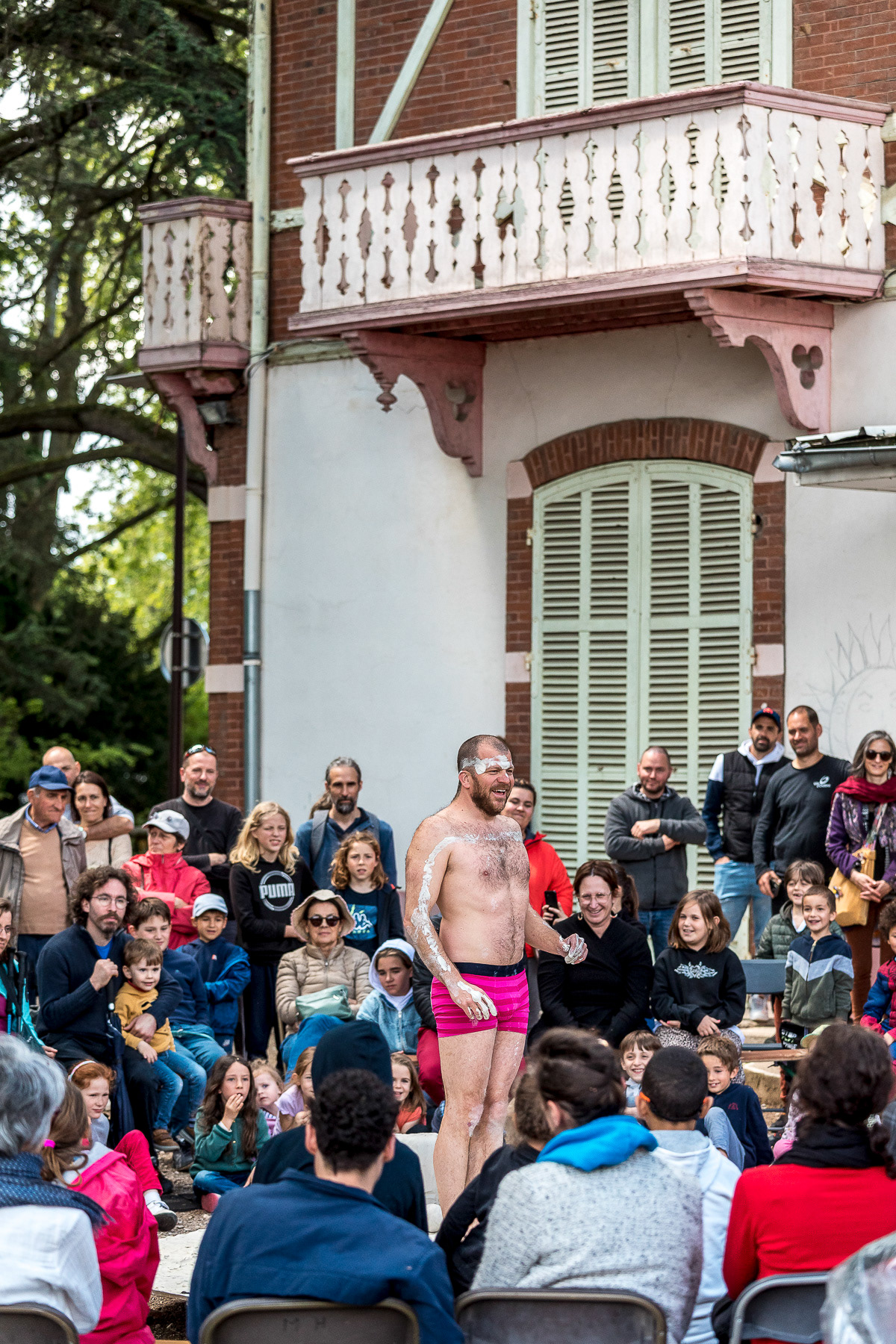 Photographie de spectacle en plein air de la performance de jonglage atypique "Gadoue" par la compagnie Le Jardin des Délices, lors de la fête de l'Iris - Oullins, Grand Lyon, France