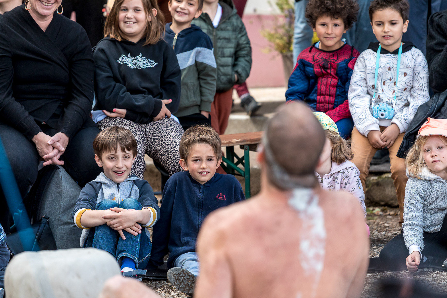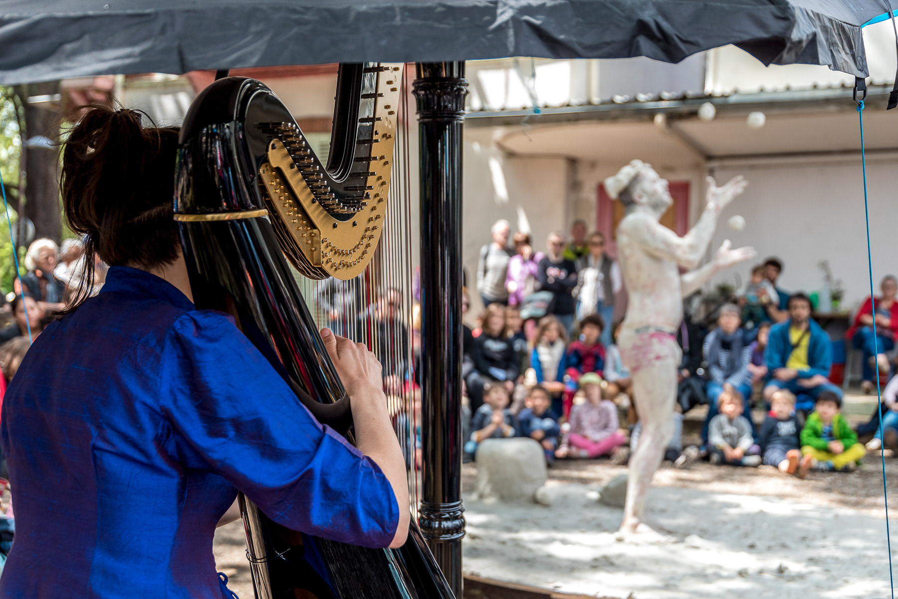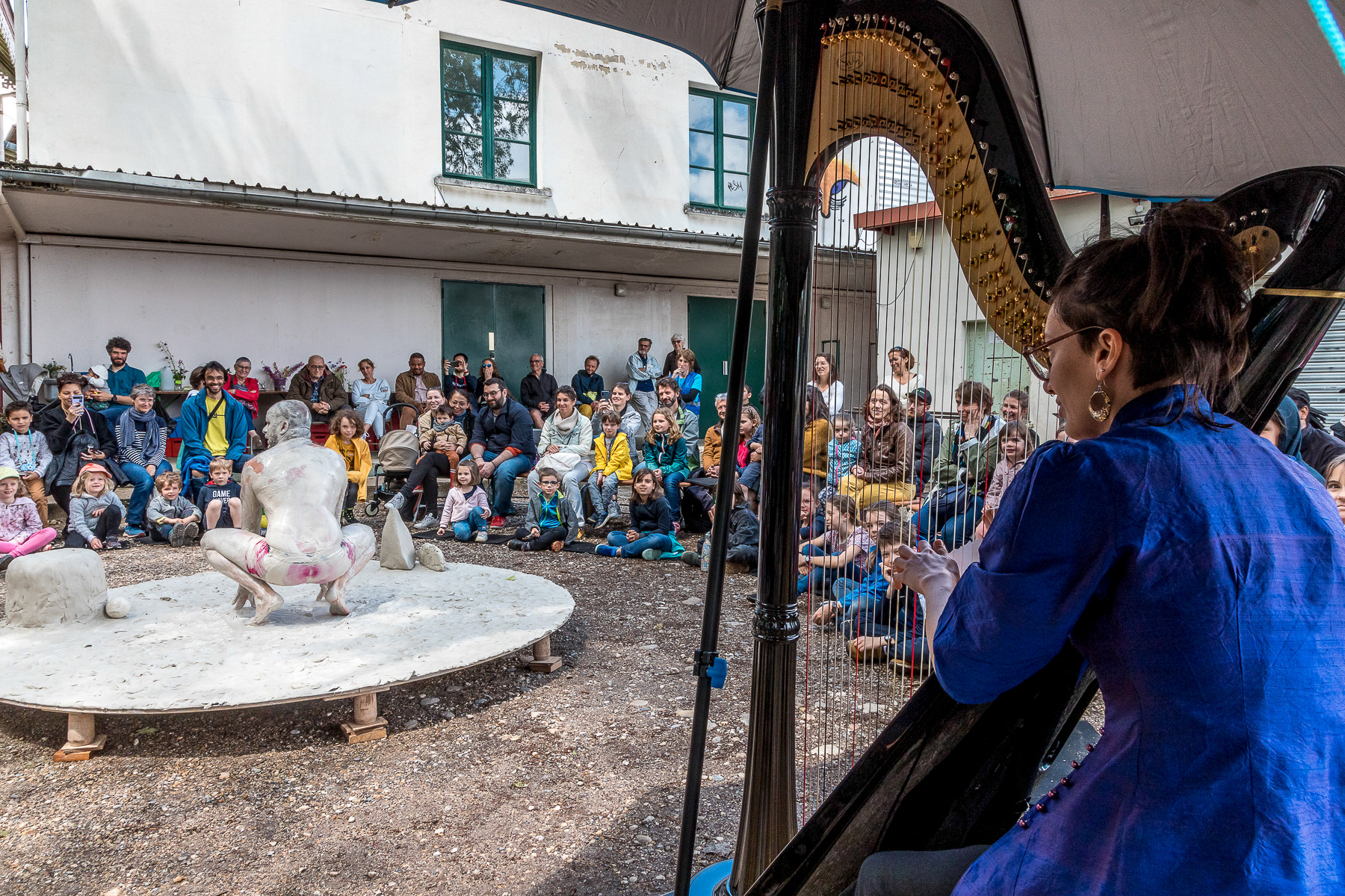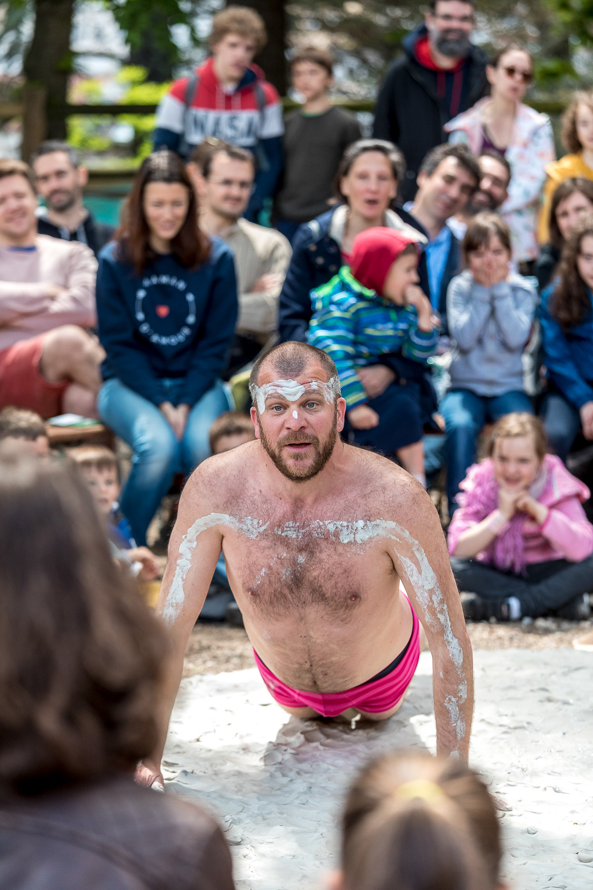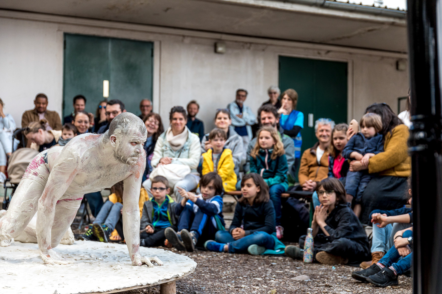 Photographie de spectacle en plein air de la performance de jonglage atypique "Gadoue" par la compagnie Le Jardin des Délices, lors de la fête de l'Iris - Oullins, Grand Lyon, France